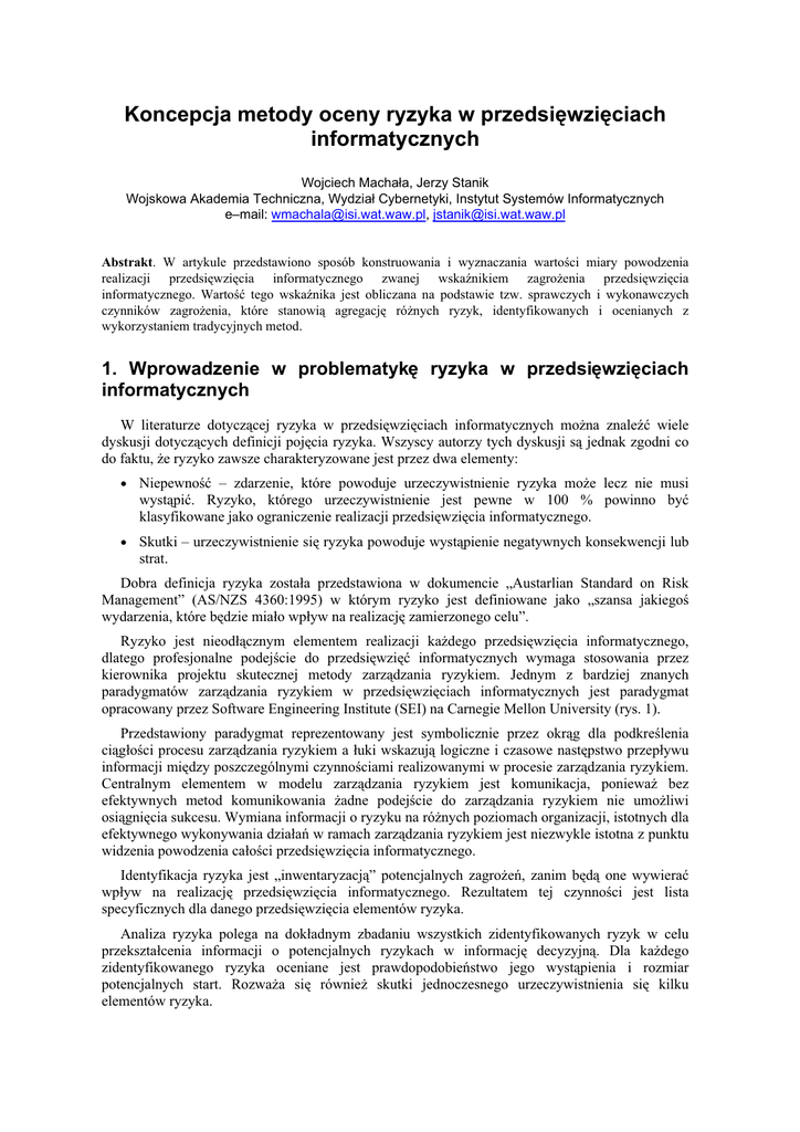 .RQFHSFMDPHWRG\RFHQ\U\]\NDZSU]HGVL Z]L FLDFK informatycznych :RMFLHFK0DFKDáD-HU]\6WDQLN :RMVNRZD$NDGHPLD7HFKQLF]QD:\G]LDá&\EHUQHW\NL,QVW\WXW6\VWHPyZ,QIRUPDW\F]Q\FK e–mail: [email protected], [email protected] Abstrakt : DUW\NXOH SU]HGVWDZLRQR VSRVyE NRQVWUXRZDQLD L Z\]QDF]DQLD ZDUWRFL PLDU\ SRZRG]HQLD UHDOL]DFML SU]HGVL Z]L FLD LQIRUPDW\F]QHJR ]ZDQHM ZVND(QLNLHP ]DJUR*HQLD SU]HGVL Z]L FLD LQIRUPDW\F]QHJR :DUWRü WHJR ZVND(QLND MHVW REOLF]DQD QD SRGVWDZLH W]Z VSUDZF]\FK L Z\NRQDZF]\FK F]\QQLNyZ ]DJUR*HQLD NWyUH VWDQRZL DJUHJDFM Uy*Q\FK U\]\N LGHQW\ILNRZDQ\FK L RFHQLDQ\FK ] wykorzystaniem tradycyjnych metod. :SURZDG]HQLH Z SUREOHPDW\N U\]\ND Z SU]HGVL Z]L FLDFK informatycznych : OLWHUDWXU]H GRW\F]FHM U\]\ND Z SU]HGVL Z]L FLDFK LQIRUPDW\F]Q\FK PR*QD ]QDOH(ü ZLHOH G\VNXVMLGRW\F]F\FKGHILQLFMLSRM FLDU\]\ND:V]\VF\DXWRU]\W\FKG\VNXVMLVMHGQDN]JRGQLFR GRIDNWX*HU\]\NR]DZV]HFKDUDNWHU\]RZDQHMHVWSU]H]GZDHOHPHQW\ • 1LHSHZQRü ± ]GDU]HQLH NWyUH SRZRGXMH XU]HF]\ZLVWQLHQLH U\]\ND PR*H OHF] QLH PXVL Z\VWSLü 5\]\NR NWyUHJR XU]HF]\ZLVWQLHQLH MHVW SHZQH Z SRZLQQR E\ü NODV\ILNRZDQHMDNRRJUDQLF]HQLHUHDOL]DFMLSU]HGVL Z]L FLDLQIRUPDW\F]QHJR • 6NXWNL±XU]HF]\ZLVWQLHQLHVL U\]\NDSRZRGXMHZ\VWSLHQLHQHJDW\ZQ\FKNRQVHNZHQFMLOXE strat. 'REUD GHILQLFMD U\]\ND ]RVWDáD SU]HGVWDZLRQD Z GRNXPHQFLH ÄAustarlian Standard on Risk 0DQDJHPHQW´ $61=6 Z NWyU\P U\]\NR MHVW GHILQLRZDQH MDNR ÄV]DQVD MDNLHJR Z\GDU]HQLDNWyUHE G]LHPLDáRZSá\ZQDUHDOL]DFM ]DPLHU]RQHJRFHOX´ 5\]\NR MHVW QLHRGáF]Q\P HOHPHQWHP UHDOL]DFML ND*GHJR SU]HGVL Z]L FLD LQIRUPDW\F]QHJR GODWHJR SURIHVMRQDOQH SRGHMFLH GR SU]HGVL Z]L ü LQIRUPDW\F]Q\FK Z\PDJD VWRVRZDQLD SU]H] NLHURZQLND SURMHNWX VNXWHF]QHM PHWRG\ ]DU]G]DQLD U\]\NLHP -HGQ\P ] EDUG]LHM ]QDQ\FK SDUDG\JPDWyZ ]DU]G]DQLD U\]\NLHP Z SU]HGVL Z]L FLDFK LQIRUPDW\F]Q\FK MHVW SDUDG\JPDW opracowany przez Software Engineering Institute (SEI) na Carnegie Mellon University (rys. 1). 3U]HGVWDZLRQ\ SDUDG\JPDW UHSUH]HQWRZDQ\ MHVW V\PEROLF]QLH SU]H] RNUJ GOD SRGNUHOHQLD FLJáRFLSURFHVX]DU]G]DQLDU\]\NLHPDáXNLZVND]XMORJLF]QHLF]DVRZHQDVW SVWZRSU]HSá\ZX LQIRUPDFMLPL G]\SRV]F]HJyOQ\PLF]\QQRFLDPLUHDOL]RZDQ\PLZSURFHVLH]DU]G]DQLDU\]\NLHP &HQWUDOQ\P HOHPHQWHP Z PRGHOX ]DU]G]DQLD U\]\NLHP MHVW NRPXQLNDFMD SRQLHZD* EH] HIHNW\ZQ\FK PHWRG NRPXQLNRZDQLD *DGQH SRGHMFLH GR ]DU]G]DQLD U\]\NLHP QLH XPR*OLZL RVLJQL FLDVXNFHVX:\PLDQDLQIRUPDFMLRU\]\NXQDUy*Q\FKSR]LRPDFKRUJDQL]DFMLLVWRWQ\FKGOD HIHNW\ZQHJRZ\NRQ\ZDQLDG]LDáDZUDPDFK]DU]G]DQLDU\]\NLHPMHVWQLH]Z\NOHLVWRWQD]SXQNWX ZLG]HQLDSRZRG]HQLDFDáRFLSU]HGVL Z]L FLDLQIRUPDW\F]QHJR ,GHQW\ILNDFMD U\]\ND MHVW ÄLQZHQWDU\]DFM´ SRWHQFMDOQ\FK ]DJUR*H ]DQLP E G RQH Z\ZLHUDü ZSá\Z QD UHDOL]DFM SU]HGVL Z]L FLD LQIRUPDW\F]QHJR 5H]XOWDWHP WHM F]\QQRFL MHVW OLVWD VSHF\ILF]Q\FKGODGDQHJRSU]HGVL Z]L FLDHOHPHQWyZU\]\ND $QDOL]D U\]\ND SROHJD QD GRNáDGQ\P ]EDGDQLX ZV]\VWNLFK ]LGHQW\ILNRZDQ\FK U\]\N Z FHOX SU]HNV]WDáFHQLD LQIRUPDFML R SRWHQFMDOQ\FK U\]\NDFK Z LQIRUPDFM GHF\]\MQ 'OD ND*GHJR ]LGHQW\ILNRZDQHJR U\]\ND RFHQLDQH MHVW SUDZGRSRGRELHVWZR MHJR Z\VWSLHQLD L UR]PLDU SRWHQFMDOQ\FK VWDUW 5R]ZD*D VL UyZQLH* VNXWNL MHGQRF]HVQHJR XU]HF]\ZLVWQLHQLD VL NLONX elementów ryzyka. 242 :RMFLHFK0DFKDáD-HU]\6WDQLN 5\V0RGHO]DU]G]DQLDU\]\NLHPSURSRQRZDQ\SU]H]Software Engineering Institute 3ODQRZDQLH U\]\ND SROHJD QD Z\NRU]\VWDQLX LQIRUPDFML R U\]\NDFK Z Uy*Q\FK GHF\]MDFK L G]LDáDQLDFK PDMF\FK QD FHOX ]áDJRG]HQLH VNXWNyZ XU]HF]\ZLVWQLHQLD VL U\]\N 'OD ND*GHJR HOHPHQWX U\]\ND SRZLQLHQ E\ü RNUHORQ\ VSRVyE SRVW SRZDQLD QS áDJRG]HQLH XQLNDQLH DNFHSWDFMDWUDQVIHUSRJá ELRQDDQDOL]DU\]\ND OHG]HQLH U\]\ND UHDOL]RZDQH MHVW SRSU]H] PRQLWRURZDQLH VWDWXVX U\]\N RUD] G]LDáD UR]SRF] W\FKZFHOXáDJRG]HQLDOXEXQLNDQLDU\]\ND 6WHURZDQLHU\]\NLHPMHVWF]\QQRFLSROHJDMFQDNRU\JRZDQLXRGFK\OHRGSU]HZLG\ZDQ\FK UH]XOWDWyZG]LDáDSRGM W\FKZFHOXáDJRG]HQLDOXEXQLNDQLDU\]\ND 'ZLHSLHUZV]HF]\QQRFLLGHQW\ILNDFMDLDQDOL]DPR*QDRNUHOLüMDNRG]LDáDQLD]PLHU]DMFHGR RFHQ\U\]\NDDZ\NRQ\ZDQLHSR]RVWDá\FKF]\QQRFLSODQRZDQLHOHG]HQLHLVWHURZDQLH]PLHU]D GRREQL*DQLDU\]\ND : GDOV]HM F] FL DUW\NXáX SU]HGVWDZLRQR NRQFHSFM PHWRG\ RFHQ\ U\]\ND FR Z NRQWHNFLH RSLVDQHJRZ\*HMPRGHOX]DU]G]DQLDU\]\NLHPR]QDF]DNRQFHSFM LGHQW\ILNDFMLLDQDOL]\U\]\ND 2. Identyfikacja i analiza ryzyka 6WRVRZDQHZSUDNW\FHPHWRG\LGHQW\ILNDFMLU\]\NDVZVZRMHMLVWRFLHEDUG]RSRGREQHGRVLHELH ± SROHJDM RQH QD XWZRU]HQLX OLVW\ (UyGHá SRWHQFMDOQ\FK U\]\N GOD NRQNUHWQHJR SU]HGVL Z]L FLD LQIRUPDW\F]QHJR/LVWDWDNDF] VWRMHVWSU]HNV]WDáFDQDGRSHZQHMVWUXNWXU\KLHUDUFKLF]QHM3RQL*HM przedstawiono fragment takiej struktury. 1. URGRZLVNRZ\WZDU]DQLD 1.1. Proces wytwarzania: 1.1.1. .... 1.1.2. .... 1.2. 3URFHV]DU]G]DQLDSU]HGVL Z]L FLHP 1.2.1. Planowanie .RQFHSFMDPHWRG\RFHQ\U\]\NDZSU]HGVL Z]L FLDFKLQIRUPDW\F]Q\FK 1.2.2. 1.2.3. 1.2.4. 1.3. .... 1.4. .... 2. .... 243 Organizacja projektu .... .... 'R ND*GHJR HOHPHQWDUQHJR (UyGáD U\]\ND QDOH*\ GRáF]\ü S\WDQLH OXE OLVW S\WD NWyUH XPR*OLZL LGHQW\ILNDFM U\]\N ]ZL]DQ\FK ] GDQ\P (UyGáHP 5\]\ND ]ZL]DQH ] SODQRZDQLHP RUD]RUJDQL]DFMSURMHNWXPRJE\ü]LGHQW\ILNRZDQHQDSRGVWDZLHQDVW SXMFHMOLVW\ S\WD 1.2.1. Planowanie: 1.2.1.1. &]\SU]HGVL Z]L FLHMHVW]DU]G]DQH]JRGQLH]SODQHP" 1.2.1.2. &]\SODQSU]HGVL Z]L FLDSRGOHJDUHRUJDQL]DFMLVWRVRZQLHGRRNROLF]QRFL" 1.2.1.3. &]\ND*G\SR]LRP]HVSRáXZ\NRQDZF]HJRMHVWXZ]JO GQLDQ\ZSODQRZDQLX]DGD" 1.2.1.4. &]\GOD]QDQ\FKU\]\N]RVWDá\XWZRU]RQHSODQ\DZDU\MQH" 1.2.2. Organizacja projektu: 1.2.2.1. &]\RUJDQL]DFMDSU]HGVL Z]L FLDLQIRUPDW\F]QHJRMHVWHIHNW\ZQD" 1.2.2.2. &]\ ZV]\VF\ F]áRQNRZLH ]HVSRáX Z\NRQDZF]HJR GREU]H UR]XPLHM VZRMH UROH L UROH LQQ\FKF]áRQNyZ" 1.2.2.3. &]\ ZV]\VF\ F]áRQNRZLH ]HVSRáX Z\NRQDZF]HJR GREU]H UR]XPLHM ]DNUHV RGSRZLHG]LDOQRFLVZRMHMRUD]LQQ\FKF]áRQNyZ]HVSRáX" 3U]\JRWRZDQLH Z\F]HUSXMFHJR NZHVWLRQDULXV]D XPR*OLZLDMFHJR LGHQW\ILNDFM ZV]\VWNLFK SRWHQFMDOQ\FK U\]\N QLH MHVW WU\ZLDOQH : OLWHUDWXU]H PR*QD ]QDOH(ü ZLHOH Uy*Q\FK V]DEORQyZ NZHVWLRQDULXV]\ VáX*F\FK LGHQW\ILNDFML U\]\ND NWyUH Z UD]LH SRWU]HE\ PRJ E\ü UR]V]HU]RQD R V]F]HJyOQH S\WDQLD Z\QLNDMFH ] VSHF\ILNL GDQHJR SU]HGVL Z]L FLD LQIRUPDW\F]QHJR 0LPR *H SU]\JRWRZDQLHZáDFLZHJRNZHVWLRQDUL