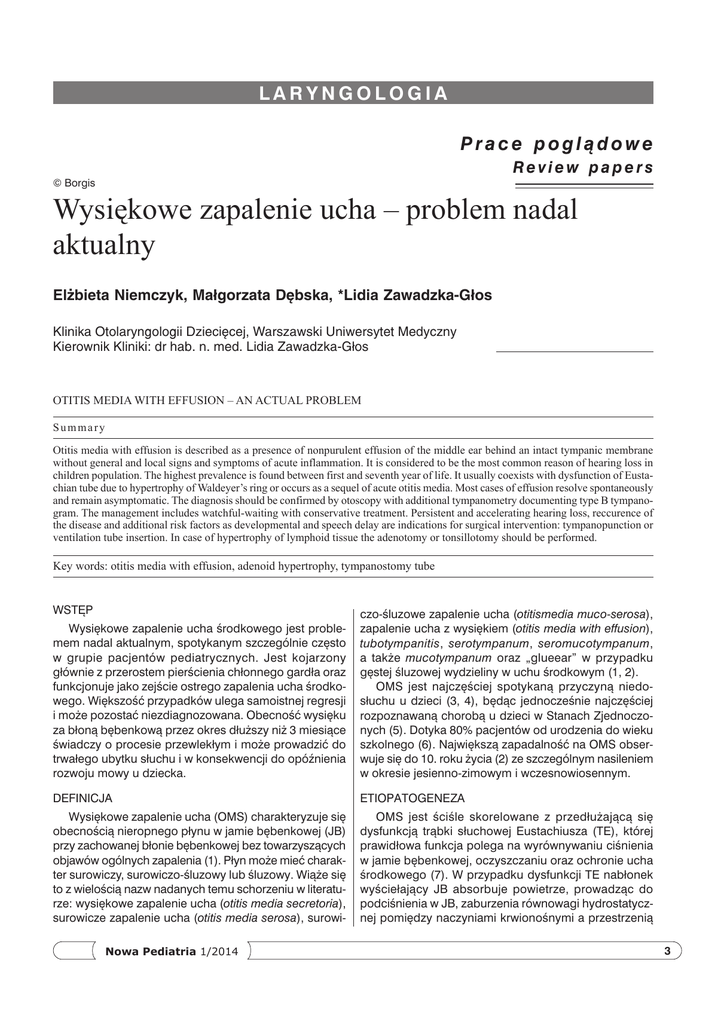 LARYNGOLOGIA Prace poglądowe Review papers © Borgis Wysiękowe zapalenie ucha – problem nadal aktualny Elżbieta Niemczyk, Małgorzata Dębska, *Lidia Zawadzka-Głos Klinika Otolaryngologii Dziecięcej, Warszawski Uniwersytet Medyczny Kierownik Kliniki: dr hab. n. med. Lidia Zawadzka−Głos Otitis media with effusion – an actual problem Summary Otitis media with effusion is described as a presence of nonpurulent effusion of the middle ear behind an intact tympanic membrane without general and local signs and symptoms of acute inflammation. It is considered to be the most common reason of hearing loss in children population. The highest prevalence is found between first and seventh year of life. It usually coexists with dysfunction of Eustachian tube due to hypertrophy of Waldeyer’s ring or occurs as a sequel of acute otitis media. Most cases of effusion resolve spontaneously and remain asymptomatic. The diagnosis should be confirmed by otoscopy with additional tympanometry documenting type B tympanogram. The management includes watchful-waiting with conservative treatment. Persistent and accelerating hearing loss, reccurence of the disease and additional risk factors as developmental and speech delay are indications for surgical intervention: tympanopunction or ventilation tube insertion. In case of hypertrophy of lymphoid tissue the adenotomy or tonsillotomy should be performed. Key words: otitis media with effusion, adenoid hypertrophy, tympanostomy tube WSTĘP Wysiękowe zapalenie ucha środkowego jest problemem nadal aktualnym, spotykanym szczególnie często w grupie pacjentów pediatrycznych. Jest kojarzony głównie z przerostem pierścienia chłonnego gardła oraz funkcjonuje jako zejście ostrego zapalenia ucha środkowego. Większość przypadków ulega samoistnej regresji i może pozostać niezdiagnozowana. Obecność wysięku za błoną bębenkową przez okres dłuższy niż 3 miesiące świadczy o procesie przewlekłym i może prowadzić do trwałego ubytku słuchu i w konsekwencji do opóźnienia rozwoju mowy u dziecka. czo-śluzowe zapalenie ucha (otitismedia muco-serosa), zapalenie ucha z wysiękiem (otitis media with effusion), tubotympanitis, serotympanum, seromucotympanum, a także mucotympanum oraz „glueear” w przypadku gęstej śluzowej wydzieliny w uchu środkowym (1, 2). OMS jest najczęściej spotykaną przyczyną niedosłuchu u dzieci (3, 4), będąc jednocześnie najczęściej rozpoznawaną chorobą u dzieci w Stanach Zjednoczonych (5). Dotyka 80% pacjentów od urodzenia do wieku szkolnego (6). Największą zapadalność na OMS obserwuje się do 10. roku życia (2) ze szczególnym nasileniem w okresie jesienno-zimowym i wczesnowiosennym. DEFINICJA ETIOPATOGENEZA Wysiękowe zapalenie ucha (OMS) charakteryzuje się obecnością nieropnego płynu w jamie bębenkowej (JB) przy zachowanej błonie bębenkowej bez towarzyszących objawów ogólnych zapalenia (1). Płyn może mieć charakter surowiczy, surowiczo-śluzowy lub śluzowy. Wiąże się to z wielością nazw nadanych temu schorzeniu w literaturze: wysiękowe zapalenie ucha (otitis media secretoria), surowicze zapalenie ucha (otitis media serosa), surowi- OMS jest ściśle skorelowane z przedłużającą się dysfunkcją trąbki słuchowej Eustachiusza (TE), której prawidłowa funkcja polega na wyrównywaniu ciśnienia w jamie bębenkowej, oczyszczaniu oraz ochronie ucha środkowego (7). W przypadku dysfunkcji TE nabłonek wyściełający JB absorbuje powietrze, prowadząc do podciśnienia w JB, zaburzenia równowagi hydrostatycznej pomiędzy naczyniami krwionośnymi a przestrzenią Nowa Pediatria 1/2014 3 Elżbieta Niemczyk, Małgorzata Dębska, Lidia Zawadzka-Głos pozanaczyniową, a następnie przesięku. W przypadku stanu zapalnego, który wiąże się ze zwiększoną przepuszczalnością naczyń, może pojawić się wysięk. Dysfunkcja TE uniemożliwia dodatkowo samooczyszczanie JB z płynu, a podciśnienie w JB predysponuje do powstania refluksu trąbkowego. Powoduje to przemieszczanie się patogenów z nosogardła do ucha środkowego. Obecność dodatkowego przewlekłego czynnika zapalnego prowadzi po pewnym czasie do metaplazji sześciennego nabłonka wyściełającego JB w gruczołowy nabłonek wielorzędowy produkujący gęstą wydzielinę śluzową. Płyn w jamie bębenkowej jest przyczyną niedosłuchu mieszanego lub przewodzeniowego do 50 dB (średnio 20-30 dB) (1, 2, 4, 5). Wbrew opiniom niektórych autorów płyn w jamie bębenkowej w przypadku OMS nie jest jałowy. Najczęściej występujące patogeny pokrywają się z tymi, które występują w ostrym zapaleniu ucha środkowego (OMA) i infekcjach górnych dróg oddechowych (IGDO). Bakterie Haemophilus influenzae spotykane są najczęściej, czyli w ok. 25% przypadków, Streptococcus pneumoniae – w ok. 9%, następnie Moraxella catarrhalis i bakterie beztlenowe. W ostatnich latach zidentyfikowano Alloiococcus otitis prawdopodobnie odpowiedzialne za przedłużanie się procesu zapalnego w uchu środkowym. Udowodniono również budowanie biofilmu w wyściółce JB w przypadku niektórych bakterii. Wirusy izolowane z płynu w JB za pomocą nowoczesnych technologii PCR stanowią 20% wszystkich patogenów. Są to wirusy: HSV, CMV, VZV, EBV, RSV, rhinowirusy, adenowirusy, enterowirusy oraz wirusy paragrypy (1, 5). w pozycji leżącej, kontakt z rówieśnikami w żłobku czy przedszkolu, warunki klimatyczne, socjoekonomiczne również wpływają na możliwość powstania OMS. Nie bez znaczenia jest skłonność osobnicza, rodzinna i rasowa (rasa biała, Eskimosi, rdzenni Amerykanie) w kierunku zapaleń ucha środkowego. Wykazano, że OMS występuje częściej u płci męskiej (1, 2, 5, 7-9). U osób dorosłych i nastolatków OMS jest zwykle jednostronne, bez względu na wiek i płeć i może świadczyć o guzie nosogardła. Inna przyczyna to obrzęk błony śluzowej, podśluzowej TE i JB w wyniku odczynu popromiennego po naświetlaniu t
