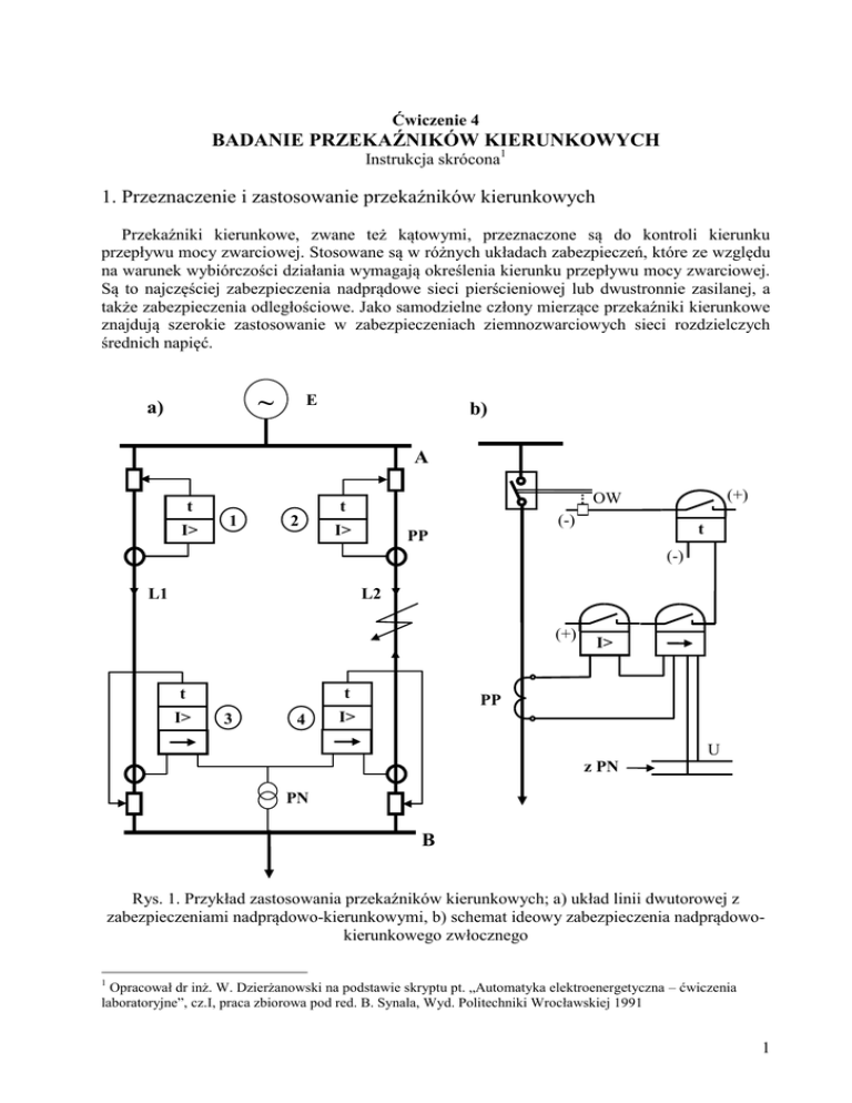 Ćwiczenie 4CbbbbĆWICZENIE NR 3 Ćwiczenie 4 BADANIE PRZEKAŹNIKÓW KIERUNKOWYCH Instrukcja skrócona1 1. Przeznaczenie i zastosowanie przekaźników kierunkowych Przekaźniki kierunkowe, zwane też kątowymi, przeznaczone są do kontroli kierunku przepływu mocy zwarciowej. Stosowane są w różnych układach zabezpieczeń, które ze względu na warunek wybiórczości działania wymagają określenia kierunku przepływu mocy zwarciowej. Są to najczęściej zabezpieczenia nadprądowe sieci pierścieniowej lub dwustronnie zasilanej, a także zabezpieczenia odległościowe. Jako samodzielne człony mierzące przekaźniki kierunkowe znajdują szerokie zastosowanie w zabezpieczeniach ziemnozwarciowych sieci rozdzielczych średnich napięć. ~ a) E b) A t I> 1 2 (+) OW t I> (-) t PP (-) L2 L1 (+) t I> t 3 4 I> PP I> U z PN PN B Rys. 1. Przykład zastosowania przekaźników kierunkowych; a) układ linii dwutorowej z zabezpieczeniami nadprądowo-kierunkowymi, b) schemat ideowy zabezpieczenia nadprądowokierunkowego zwłocznego 1 Opracował dr inż. W. Dzierżanowski na podstawie skryptu pt. „Automatyka elektroenergetyczna – ćwiczenia laboratoryjne”, cz.I, praca zbiorowa pod red. B. Synala, Wyd. Politechniki Wrocławskiej 1991 1 Przykład zastosowania przekaźników kierunkowych w układzie zabezpieczeń nadprądowokierunkowych zwłocznych w najprostszej sieci pierścieniowej pokazano na rys. 1. Najprostszą sieć pierścieniową tworzy linia 2-torowa (L1, L2) zasilana jednostronnie ze źródła E, jak na rys. 1a). W celu zapewnienia wybiórczości działania zabezpieczeń nadprądowych zwłocznych linii w takim układzie sieciowym, konieczne jest zastosowanie przekaźników kierunkowych tam, gdzie moc zwarciowa może zmieniać kierunek w zależności od położenia miejsca zwarcia. W tym wypadku zabezpieczenia obu linii w stacji B muszą być wyposażone w przekaźniki kierunkowe, które powinny blokować zabezpieczenie w przypadku wykrycia przepływu mocy zwarciowej w kierunku szyn stacji B. Opóźnienia czasowe (tB) zabezpieczeń w stacji B są mniejsze od opóźnień (tA) w stacji A o czas stopniowania t. W razie wystąpienia zwarcia, np. w torze L2 (jak na rys. 1) pobudzają się człony prądowe wszystkich zabezpieczeń w układzie sieciowym. Impuls na wyłączenie, jako pierwszy, poda z opóźnieniem tB przekaźnik 4 w stacji B, gdyż jego człon kierunkowy na to zezwoli z uwagi na przepływ mocy zwarciowej od szyn stacji B. W tym samym czasie człon kierunkowy zabezpieczenia 3 działa blokująco. Po otwarciu wyłącznika toru L2 w stacji B prąd zwarciowy w zdrowym torze L1 zanika i jego zabezpieczenia (1 i 3) wracają do stanu spoczynku. W stanie pobudzenia pozostaje zabezpieczenie nadprądowo-zwłoczne 2 toru L2 w stacji A, które po nastawionym czasie tA spowoduje otwarcie wyłącznika, dokonując w ten sposób ostatecznej wybiórczej eliminacji zwarcia. Prąd rozruchowy członów prądowych omawianych zabezpieczeń dobiera się wg takich samych zasad jak dla linii promieniowych, tzn. powyżej maksymalnej wartości prądu obciążenia toru , z uwzględnieniem chwilowych przeciążeń ruchowych linii i współczynnika powrotu zastosowanych członów prądowych zabezpieczenia. Czasy opóźnień dobiera się wg ogólnych zasad stopniowania czasowego zabezpieczeń nadprądowo-zwłocznych, stosowanych w sieciach promieniowych i magistralnych, tj. ti = ti-1 + t. Pełny układ zabezpieczenia nadprądowo-kierunkowego w sieci trójfazowej jest realizowany według zasady zilustrowanej na rys. 1b), które może być w wykonaniu dwu lub trójfazowym. Wykonanie dwufazowe stosowane jest w sieciach rozdzielczych z nieuziemionym skutecznie punktem zerowym. 2. Zasady realizacji i podstawowe charakterystyki przekaźników kierunkowych Przekaźniki kierunkowe identyfikują kierunek przepływu mocy zwarciowej na zasadzie kontroli kąta przesunięcia fazowego między napięciem i prądem wejściowym. Gdy wartość tego kąta zawiera się w obszarze określonym charakterystyką kątową przekaźnika, przekaźnik działa, a gdy wykracza poza tę charakterystykę – przekaźnik blokuje. Przekaźniki kierunkowe realizowane są na bazie komparatorów fazy elektromechanicznych (starsze rozwiązania) i statycznych, których sygnałami wejściowymi są prąd I i napięcie U pochodzące z obiektu zabezpieczanego. Ustrój pomiarowy przekaźnika kierunkowego, ze względów technicznych, nie może działać przy dowolnie małych wartościach sygnałów wejściowych, dlatego w zastosowaniach praktycznych przekaźnik kierunkowy nie może być traktowany jako idealny komparator fazy. Potrzebna jest znajomość rzeczywistych charakterystyk eksploatacyjnych przekaźników kierunkowych. Podstawową wielkością, która charakteryzuje zakres kątowy działania przekaźnika kierunkowego, bez względu na jego konstrukcję, jest tzw. kąt przesunięcia wewnętrznego (kąt maksymalnej czułości). 2 Kąt przesunięcia wewnętrznego jest to taki kąt, o jaki należy obrócić wektor prądu I z położenia zgodnego z napięciem U w kierunku wyprzedzenia, aby moc rozruchowa Pr , wyrażona zależnością (1): Pr kUI cos (1) osiągnęła maksymalną wartość. gdzie: U – napięcie przyłożone do napięciowego obwodu wejściowego przekaźnika, I – prąd płynący w prądowym obwodzie wejściowym przekaźnika, - kąt przesunięcia fazowego pomiędzy napięciem U i prądem I w zabezpieczanym obiekcie, Warunek działania przekaźnika kierunkowego można zapisać następująco: Pr kUI cos Pro (2) gdzie Pro – wartość mocy wejściowej potrzebna do zadziałania przekaźnika kierunkowego (w komparatorze idealnym Pro=0). Jak widać z zal. (2), na warunki działania przekaźnika kierunkowego mają wpływ zarówno wartości amplitud sygnałów wejściowych U oraz I, jak i wartości: kąta przesunięcia fazowego pomiędzy tymi sygnałami i kąta wewnętrznego . Dla konkretnego zastosowania przekaźnika kierunkowego określona 
