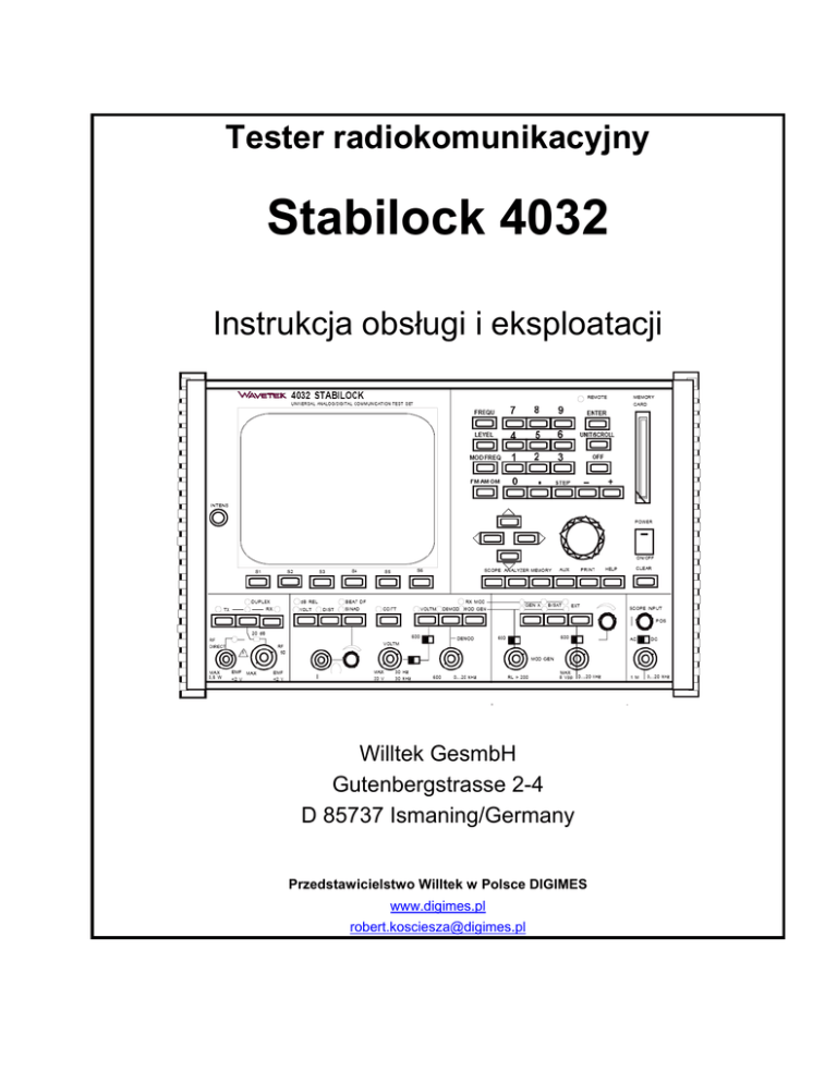 Tester radiokomunikacyjny Stabilock 4032 Instrukcja obsługi i eksploatacji Willtek GesmbH Gutenbergstrasse 2-4 D 85737 Ismaning/Germany Przedstawicielstwo Willtek w Polsce DIGIMES www.digimes.pl [email protected] UWAGA : instrukcja niniejsza dotyczy testera Stabilock 4032 Willtek , jest to nowa legalna nazwa , pomimo tego w instrukcji mogą być użyte nazwy Wavetek ,Acterna czy Schlumberger , firma Willtek jest ciągle prawnym sukcesorem nazwy testera Stabilock i kontynuuje jego produkcję. Spis treści Rozdział 1. Wstęp Uwagi dotyczące bezpieczeństwa.....................................................................................................................1-1 .. Bezpiecznik sieciowy ..................................................................................................................................1-3 .. Uziemienie...................................................................................................................................................1-3 .. Wyłączanie w przypadku uszkodzenia .......................................................................................................1-3 .. Konserwacja................................................................................................................................................1-3 . Co trzeba wiedzieć ..........................................................................................................................................1-4 . Dostarczone wyposażenie...............................................................................................................................1-4 . Przygotowanie do pierwotnego uruchomienia.................................................................................................1-5 .. Różne zasilacze ..........................................................................................................................................1-5 .. Dopuszczalne pięcia sieci ...........................................................................................................................1-5 .. Wymiana bezpiecznika ...............................................................................................................................1-6 .. Równoległe zasilanie sieciowe i bateryjne..................................................................................................1-6 .. Przygotowanie do zasilania bateryjnego.....................................................................................................1-7 ... Gniazdo zasilające .................................................................................................................................1-7 ... Wymagania dotyczące napięcia i mocy baterii zasilającej.....................................................................1-7 ... Bezpiecznik.............................................................................................................................................1-7 ... Przygotowanie kabla zasilającego do zasilania bateryjnego .................................................................1-7 ... Równoległe dołączenie baterii i sieci......................................................................................................1-7 .. Dopuszczalna moc wejściowa sygnału radiowego RF ...............................................................................1-8 ... Gniazdo RF DIRECT [bezpośrednie wejście sygnału radiowego RF] ...................................................1-8 ... Gniazdo RF [z tłumieniem] .....................................................................................................................1-8 .. Włączenie....................................................................................................................................................1-9 Rozdział 2 Płyta czołowa i płyta tylna Płyta Czołowa ...................................................................................................................................................2-3 .. Opis i funkcja Klawiszy................................................................................................................................2-4 .. Opis pokręteł regulacyjnych ......................................................................................................................2-13 .. Opis gniazd ...............................................................................................................................................2-14 .. Opis przełączników suwakowych..............................................................................................................2-15 . Płyta tylna ......................................................................................................................................................2-16 .. Detektor akustyczny + wzorzec 10 MHz [moduł 1] ...................................................................................2-17 .. Stopień częstotliwości pośredniej - IF (moduł 3) ......................................................................................2-18 .. Generator modulujący MOD GENERATOR A [moduł 4] ..........................................................................2-18 .. Komputer podległy (ang. SLAVE COMPUTER) [moduł 7] .......................................................................2-19 .. Układ sterowania monitora (ang. MONITOR CONTROL) [moduł 9] ........................................................2-19 .. Komputer główny (ang. HOST COMPUTER) [moduł 10] .........................................................................2-19 .. Zasilacz.........................................................................................................................................................2-19 Rozdział 3 Obsługa Stosowana notacja .....................................................................................................................