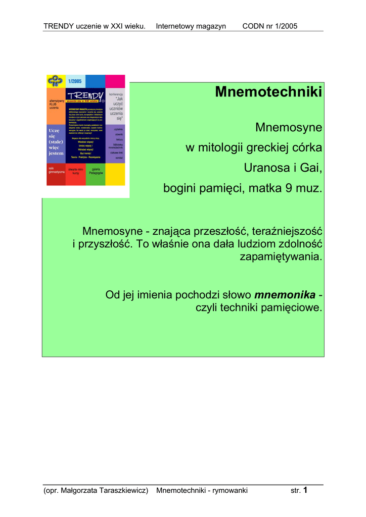 TRENDY uczenie w XXI wieku. Internetowy magazyn CODN nr 1/2005 Mnemotechniki Mnemosyne w mitologii greckiej córka Uranosa i Gai, bogini pamięci, matka 9 muz. Mnemosyne - znająca przeszłość, teraźniejszość i przyszłość. To właśnie ona dała ludziom zdolność zapamiętywania. Od jej imienia pochodzi słowo mnemonika czyli techniki pamięciowe. (opr. Małgorzata Taraszkiewicz) Mnemotechniki - rymowanki str. 1 TRENDY uczenie w XXI wieku. Internetowy magazyn CODN nr 1/2005 Mnemotechnik jest wiele, do najbardziej znanych i skutecznych należą: (opr. Małgorzata Taraszkiewicz) Mnemotechniki - rymowanki str. 2 TRENDY uczenie w XXI wieku. Internetowy magazyn CODN nr 1/2005 W tym numerze przedstawiamy kilka rymowanek. Te łatwe do zapamiętania „wierszyki”, ułatwiają zapamiętanie treści, zwłaszcza takich, które nie są powiązane, które wymagają mechanicznego zapamiętania i przez co stwarzają uczniom spore trudności. Uwaga! te wierszyki niekoniecznie muszą być poprawne językowo, im dziwniejsze – tym lepiej! 1. Nazwy i kolejność planet 2. Kolory tęczy 3. Przypadki Jednocześnie zapraszam do nadsyłania innych wierszyków, dzięki którym zapamiętywanie informacji może być łatwe i trwałe. Otworzymy bibliotekę mnemotechnik! PLANETY Moją - Merkury My Wolę - Wenus Very Znaj - Ziemia Educated Matole - Mars Mother Jak - Jowisz Just Się - Saturn Show Uprę - Uran Us Nie - Neptun Nine Pozwolę - Pluton Planets (opr. Małgorzata Taraszkiewicz) Mnemotechniki - rymowanki str. 3 TRENDY uczenie w XXI wieku. Internetowy magazyn CODN nr 1/2005 TĘCZA Czemu - czerwony Patrzysz - pomarańczowy Żabko - żółty Zielona - zielony Na - niebieski Głupiego - granatowy Fanfarona - fioletowy PRZYPADKI Mama - Mianownik Dała - Dopełniacz Celci - Celownik Bułkę - Biernik Nasmarował - Narzędnik Masłem - Mianownik Wujek - Wołacz (opr. Małgorzata Taraszkiewicz) Mnemotechniki - rymowanki str. 4