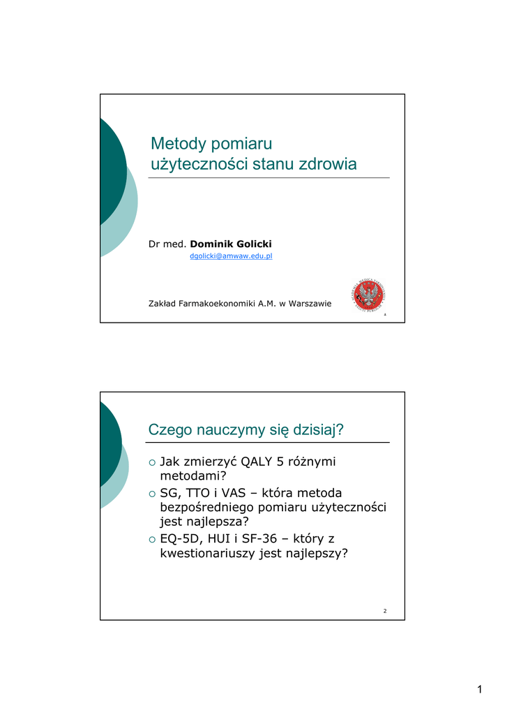 Metody pomiaru uŜyteczności stanu zdrowia Dr med. Dominik Golicki [email protected] Zakład Farmakoekonomiki A.M. w Warszawie 1 Czego nauczymy się dzisiaj? Jak zmierzyć QALY 5 róŜnymi metodami? SG, TTO i VAS – która metoda bezpośredniego pomiaru uŜyteczności jest najlepsza? EQ-5D, HUI i SF-36 – który z kwestionariuszy jest najlepszy? 2 1 liczba cytowań QALY cytowania w bazie Medline (PubMed) 500 450 3500 400 350 300 250 200 150 100 50 0 1983 1986 1989 1992 1995 1998 2001 2004 lata 3 Farmakoekonomika Porównanie alternatywnych alokacji ograniczonych, dostępnych środków: Na co powinniśmy przeznaczyć dostępne środki: na wózki inwalidzkie? czy na program skriningowy raka piersi? Porównanie kosztów Porównanie wyników Wyniki muszą być porównywalne generyczne miary wyników 4 2 Lata Ŝycia skorygowane o jakość Quality Adjusted Life Years (QALY) Iloczyn: zyskane lata Ŝycia x indeks jakości Ŝycia Indeks jakości Ŝycia 1.0 = pełne zdrowie 0.0 = śmierć (skrajnie zły stan zdrowia) 5 Lata Ŝycia skorygowane o jakość Quality Adjusted Life Years (QALY) Przykład Utrata wzroku przy urodzeniu Indeks jakości Ŝycia = 0,5 Oczekiwana długość Ŝycia = 80 lat 0,5 x 80 = 40 QALY 6 3 Który program zdrowotny jest bardziej efektywny kosztowo? Nowy wózek inwalidzki dla osób w wieku podeszłym (iBOT) Specjalistyczny program opieki neonatologicznej 7 Który program zdrowotny jest bardziej efektywny kosztowo? Nowy wózek inwalidzki dla osób w wieku podeszłym (iBOT) Indeks jakości Ŝycia = 0,1 Oczekiwana długość Ŝycia: 10 lat QALY = 10 x 0,1 = 1 QALY Koszty: 3 000 $ rocznie Koszty programu: 10 x 3 000 $ = 30 000 $ Koszt/QALY = 30 000 $ /QALY 8 4 Który program zdrowotny jest bardziej efektywny kosztowo? Specjalistyczny program opieki neonatologicznej Indeks jakości Ŝycia = 0,8 Oczekiwana długość Ŝycia: 35 lat Koszty: 250 000 $ QALY = 35 x 0,8 = 28 QALY koszt/QALY = 8 929 $ /QALY 9 Który program zdrowotny jest bardziej efektywny kosztowo? Nowy wózek inwalidzki dla osób w wieku podeszłym (iBOT) Koszt/QALY = 30 000 $ /QALY Specjalistyczny program opieki neonatologicznej koszt/QALY = 8 929 $ /QALY 10 5 Tabele ligowe Intervention $ / QALY GM-CSF in elderly with leukemia 235,958 EPO in dialysis patients 139,623 Lung transplantation 100,957 End stage renal disease management 53,513 Heart transplantation 46,775 Didronel in osteoporosis 32,047 PTA with Stent 17,889 Breast cancer screening 5,147 Viagra 5,097 Treatment of congenital anorectal malformations 2,778 11 Problemy w szacowaniu uŜyteczności Jakość Ŝycia w danym stanie zdrowia określona pojedynczą liczbą Do obliczenia QALY potrzebna jest jednowymiarowa ocena jakości Ŝycia 100 90 S c o res o n S F -3 6 80 70 General pop. 60 Diabetes II 50 Growth hormon def. 40 Depression 30 20 10 y l th in ea pa l it lH ly Vi ta Ge ne ra di Bo l l th ea lh ta en le M ic em ot io na ng ni Ph ys le Ro al ci So Ro ni ng ti o io ct nc Fu fu n al ic ys al 0 Ph Wyklucza to moŜliwość korzystania z wielowymiarowych (wielodomenowych) kwestionariuszy oceny jakości Ŝycia: Np.: SF-36, NHP, WHOQOL 12 6 Metody pomiaru uŜyteczności Bezpośrednie Pośrednie 13 Metody bezpośredniego pomiaru uŜyteczności stanu zdrowia 14 7 Bezpośredni pomiar uŜyteczności Metoda loterii (standard gamble, SG) Metoda handlowania czasem (time trade-off, TTO) Wizualna skala analogowa (visual analogue scale, VAS) Patient trade-off (PTO) 15 Wizualna skala analogowa visual analogue scale (VAS) Źródło – badania psychologiczne “Jak oceniasz swój stan zdrowia?” MoŜliwe róŜne punkty zaczepienia: Normalne zdrowie X Normalne zdrowie (1.0) versus śmierć (0.0) Najlepszy wyobraŜalny stan zdrowia versus najgorszy wyobraŜalny stan zdrowia Śmierć 16 8 Metoda handlowania czasem Time Trade-Off (TTO) 1,0 wartość Stan zdrowia i hi 0 x t czas 17 Metoda handlowania czasem Time Trade-Off (TTO) Ograniczenie do wózka inwalidzkiego Oczekiwana długość Ŝycia: 50 lat Ile lat Ŝycia (z oczekiwanych 50) byś oddał za wyleczenie? np. 10 lat QALY(wózek) = QALY(zdrowie) Lata (w)* indeks QoL (w) = Lata (z)* indeks QoL (z) 50 * indeks QoL (w) = 40 * 1 indeks QoL (w) = 40/50 = 0,8 18 9 Metoda loterii Standard Gamble (SG) P ZDROWY Alternatywa 1 1-P wybór ŚMIERĆ Alternatywa 2 STAN i 19 Metoda loterii Standard Gamble (SG) Ograniczenie do wózka inwalidzkiego Oczekiwana długość Ŝycia nie ma znaczenia Jak duŜe ryzyko zgonu byłbyś gotów zaakceptować, stosując terapię która umoŜliwiłaby Ci chodzenie ? Max. ryzyko 20% Ŝycie na wózku = (100%-20%) Ŝycia chodząc indeks QoL (w) = 80% lub 0.8 20 10 Konsekwentny obraz róŜnic UŜyteczność 1,0 0,9 0,8 0,7 0,6 0,5 0,4 0,3 SG TTO VAS 103 studentów 0,2 0,1 0,0 3 33 33 3 23 22 3 32 22 1 32 33 2 23 21 1 21 32 2 12 11 2 11 11 1 12 11 1 11 21 1 21 11 1 11 12 stan zdrowia (EQ-5D) 21 Ekonomiści zdrowia preferują SG i TTO Wizualna skala analogowa Metoda łatwa Brak alternatyw: brak wyraźnego związku z QALY Standard Gamble / Time trade-Off Trudniejsze metody Wybór (Trade-off): wyraźny związek z QALY Niewielkie róŜnice między SG i TTO 22 11 Kiedy QALY ma znaczenie? Choroby przewlekłe Opieka paliatywna Długotrwałe negatywne konsekwencje choroby 23 Metody pośredniego pomiaru uŜyteczności stanu zdrowia 24 12 Taksonomia miar jakości Ŝycia związanej ze zdrowiem (HRQoL) QoL HRQoL HRQoL Intrumenty ogólne Miary szczegółowe Generic instruments Specific instruments Profile zdrowotne Miary uŜyteczności Health profiles Utility measures 25 Oprac. na podstawie: Cramer JA, Spilker B. Quality of life and phatmacoeconomics. Lippincott – Raven, Philapdelphia 1998. Zewaluowane kwestionariusze Rosser EuroQol EQ-5D www.euroqol.org QWB SF-36 (SF-6D) www.sf-36.org HUI Mark 2 HUI Mark 3 15D www.15d-instrument.net 26 13 Zewaluowane kwestionariusze Kwestionariusz Liczba stanów zdrowia Rosser 30 EuroQol EQ-5D 245 QWB 2,200 SF-36 (SF-6D) 18,000 HUI Mark 2 24,000 HUI Mark 3 972,000 15D 3,052,000,000 2