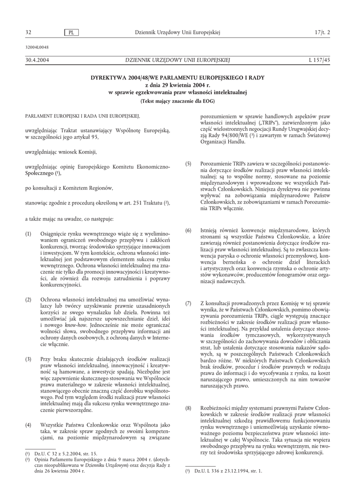 32 Dziennik Urzędowy Unii Europejskiej PL 17/t. 2 32004L0048 30.4.2004 DZIENNIK URZĘDOWY UNII EUROPEJSKIEJ L 157/45 DYREKTYWA 2004/48/WE PARLAMENTU EUROPEJSKIEGO I RADY z dnia 29 kwietnia 2004 r. w sprawie egzekwowania praw własności intelektualnej (Tekst mający znaczenie dla EOG) porozumieniem w sprawie handlowych aspektów praw własności intelektualnej („TRIPs”), zatwierdzonym jako część wielostronnych negocjacji Rundy Urugwajskiej decyzją Rady 94/800/WE (3) i zawartym w ramach Światowej Organizacji Handlu. PARLAMENT EUROPEJSKI I RADA UNII EUROPEJSKIEJ, uwzględniając Traktat ustanawiający Wspólnotę Europejską, w szczególności jego artykuł 95, uwzględniając wniosek Komisji, uwzględniając opinię Europejskiego Komitetu EkonomicznoSpołecznego (1), (5) Porozumienie TRIPs zawiera w szczególności postanowienia dotyczące środków realizacji praw własności intelektualnej; są to wspólne normy, stosowane na poziomie międzynarodowym i wprowadzone we wszystkich Państwach Członkowskich. Niniejsza dyrektywa nie powinna wpływać na zobowiązania międzynarodowe Państw Członkowskich, ze zobowiązaniami w ramach Porozumienia TRIPs włącznie. (6) Istnieją również konwencje międzynarodowe, których stronami są wszystkie Państwa Członkowskie, a które zawierają również postanowienia dotyczące środków realizacji praw własności intelektualnej. Są to zwłaszcza konwencja paryska o ochronie własności przemysłowej, konwencja berneńska o ochronie dzieł literackich i artystycznych oraz konwencja rzymska o ochronie artystów wykonawców, producentów fonogramów oraz organizacji nadawczych. (7) Z konsultacji prowadzonych przez Komisję w tej sprawie wynika, że w Państwach Członkowskich, pomimo obowiązywania porozumienia TRIPs, ciągle występują znaczące rozbieżności w zakresie środków realizacji praw własności intelektualnej. Na przykład ustalenia dotyczące stosowania środków tymczasowych, wykorzystywanych w szczególności do zachowywania dowodów i obliczania strat, lub ustalenia dotyczące stosowania nakazów sądowych, są w poszczególnych Państwach Członkowskich bardzo różne. W niektórych Państwach Członkowskich brak środków, procedur i środków prawnych w rodzaju prawa do informacji i do wycofywania z rynku, na koszt naruszającego prawo, umieszczonych na nim towarów naruszających prawo. (8) Rozbieżności między systemami prawnymi Państw Członkowskich w zakresie środków realizacji praw własności intelektualnej szkodzą prawidłowemu funkcjonowaniu rynku wewnętrznego i uniemożliwiają uzyskanie równoważnego poziomu bezpieczeństwa praw własności intelektualnej w całej Wspólnocie. Taka sytuacja nie wspiera swobodnego przepływu na rynku wewnętrznym, nie tworzy też środowiska sprzyjającego zdrowej konkurencji. po konsultacji z Komitetem Regionów, stanowiąc zgodnie z procedurą określoną w art. 251 Traktatu (2), a także mając na uwadze, co następuje: (1) Osiągnięcie rynku wewnętrznego wiąże się z wyeliminowaniem ograniczeń swobodnego przepływu i zakłóceń konkurencji, tworząc środowisko sprzyjające innowacjom i inwestycjom. W tym kontekście, ochrona własności intelektualnej jest podstawowym elementem sukcesu rynku wewnętrznego. Ochrona własności intelektualnej ma znaczenie nie tylko dla promocji innowacyjności i kreatywności, ale również dla rozwoju zatrudnienia i poprawy konkurencyjności. (2) Ochrona własności intelektualnej ma umożliwiać wynalazcy lub twórcy uzyskiwanie prawnie uzasadnionych korzyści ze swego wynalazku lub dzieła. Powinna też umożliwiać jak najszersze upowszechnianie dzieł, idei i nowego know-how. Jednocześnie nie może ograniczać wolności słowa, swobodnego przepływu informacji ani ochrony danych osobowych, z ochroną danych w Internecie włącznie. (3) Przy braku skutecznie działających środków realizacji praw własności intelektualnej, innowacyjność i kreatywność są hamowane, a inwestycje spadają. Niezbędne jest więc zapewnienie skutecznego stosowania we Wspólnocie prawa materialnego w zakresie własności intelektualnej, stanowiącego obecnie znaczną część dorobku wspólnotowego. Pod tym względem środki realizacji praw własności intelektualnej mają dla sukcesu rynku wewnętrznego znaczenie pierwszorzędne. (4) Wszystkie Państwa Członkowskie oraz Wspólnota jako taka, w zakresie spraw zgodnych ze swoimi kompetencjami, na poziomie międzynarodowym są związane (1) Dz.U. C 32 z 5.2.2004, str. 15. (2) Opinia Parlamentu Europejskiego z dnia 9 marca 2004 r. (dotychczas nieopublikowana w Dzienniku Urzędowym) oraz decyzja Rady z dnia 26 kwietnia 2004 r. (3) Dz.U. L 336 z 23.12.1994, str. 1. 17/t. 2 (9) PL Dziennik Urzędowy Unii Europejskiej Występujące aktualnie rozbieżności prowadzą też do osłabiania prawa materialnego w zakresie własności intelektualnej oraz do fragmentacji rynku wewnętrznego w tym obszarze. Powoduje to utratę wiary kręgów biznesu w rynek wewnętrzny, co w konsekwencji powoduje zmniejszenie inwestycji w innowacyjność i kreatywność. Naruszenia praw własności intelektualnej coraz częściej związane są z działalnością przestępczości zorganizowanej. Rosnące wykorzystywanie Internetu umożliwia natychmiastową dystrybucję pirackich produktów na całej kuli ziemskiej. Skuteczna realizacja prawa materialnego w zakresie własności intelektualnej powinna wynikać z działań szczególnych na poziomie wspólnotowym. To dlatego zbliżanie ustawodawstw Państw Członkowskich w tym zakresie jest podstawowym warunkiem wstępnym prawidłowego funkcjonowania rynku wewnętrznego. (10) Celem niniejszej dyrektywy jest zbliżenie systemów prawnych w celu zapewnienia wysokiego, równoważnego i jednakowego poziomu bezpieczeństwa na rynku wewnętrznym. (11) Niniejsza dyrektywa nie ma na celu ustanowienia zharmonizowanych zasad współpracy sądowej, jurysdykcji, uznawania i wykony