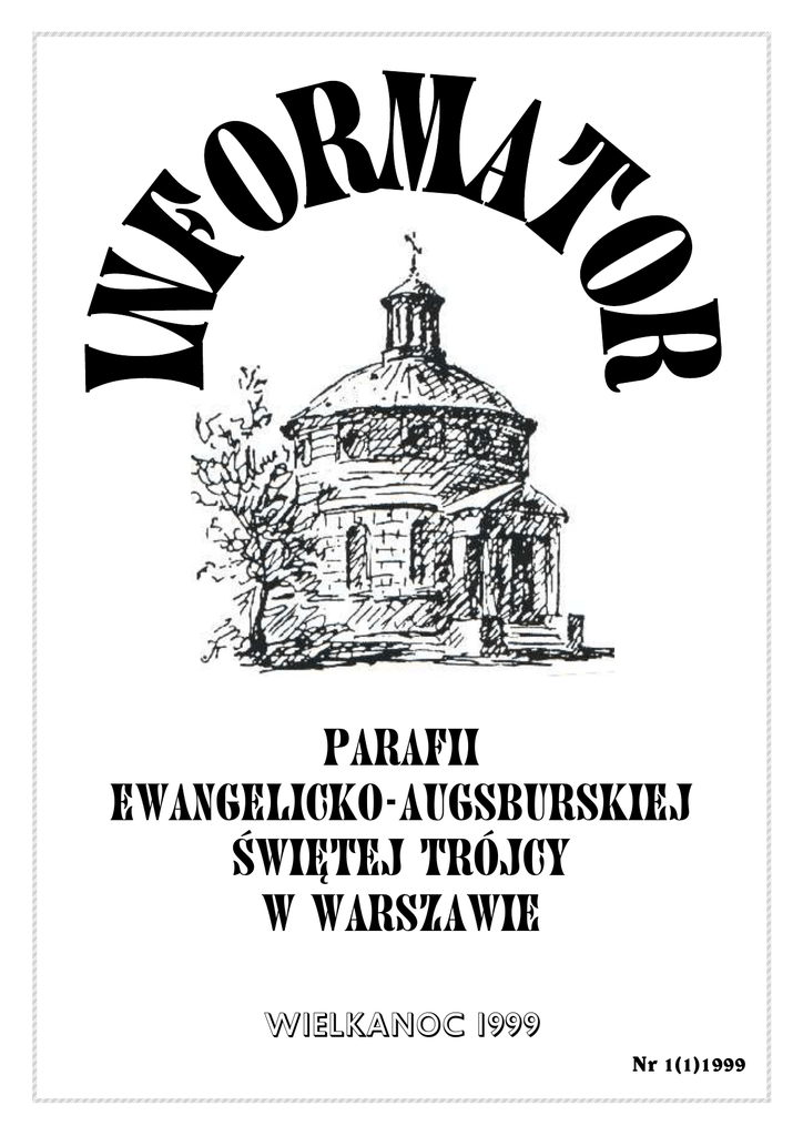 Parafii Ewangelicko-augsburskiej Świętej trójcy w Warszawie Wielkanoc 1999 Nr 1(1)1999 h Pan zmartwychwstał! Alleluja! Z okazji Świąt Zmartwychwstania Pańskiego - wszystkim współwyznawcom, członkom Parafii Świętej Trójcy Trójcy oraz Ich Najbliższym prawdziwie świątecznej radości życzą Księża i Rada Parafialna 2 Drodzy Bracia i Siostry! Po długiej, blisko dziesięcioletniej przerwie oddajemy do Waszych rąk nasz Informator Parafialny. Jest jeszcze skromny objętościowo i zawiera najistotniejsze wiadomości o Parafii i jej działalności w ubiegłym 1998 roku. Mamy szczerą i ufną nadzieję, że Informator, który pojawia się w bliskości Świąt Zmartwychwstania Pańskiego, będzie docierał do Was regularniej i częściej, bogatszy w wiadomości z życia Parafii Świętej Trójcy. Oby Pan Kościoła sprawił, żeby znalazły się wśród nas ochotne serca do podjęcia tego błogosławionego trudu wydawania tak pożądanej publikacji. Życzę tego gorąco Wam wszystkim, najbliższym Współpracownikom i sobie Wasz Ks. dr Włodzimierz Nast Proboszcz GREMIUM KIERUJĄCE PARAFIĄ Gremium kierującym Parafią Świętej Trójcy jest Rada Parafialna, wybrana przez Zgromadzenie Parafialne w dniu 22 czerwca 1997 r. Uroczystego wprowadzenia w urzędowanie dokonał Biskup Diecezji Warszawskiej, ks. Mieczysław Cieślar w dniu 29 czerwca tegoż roku. Kadencja Rady Parafialnej trwa 5 lat, a więc nowe wybory czekają naszą Parafię w 2002 roku. W skład Rady Parafialnej wchodzą z urzędu proboszczowie, wikariusz i katechetka, a więc ks.ks. Włodzimierz Nast, Sławomir Sikora i Ireneusz Lukas oraz p. Gabriela Bakalarz. Rada liczy ponadto dziewięciu wybranych członków. Są to: Marcin Benke, Ewa Dreger, Barbara Dzienio, Ada Hasiuk, Zbigniew Marski, Stanisław Miścicki, Paweł Poppe, Władysław Sikora i Danuta Weigle. Prezydium Rady Parafialnej stanowią: Paweł Poppe prezes, ks. dr Włodzimierz Nast - wiceprezes, Zbigniew Marski - sekretarz, Barbara Dzienio - skarbnik. Zgromadzenie Parafialne wybrało ponadto sześciu zastępców członków Rady, 27-osobowy Komitet Parafialny i 3-osobową Komisję Rewizyjną. 3 OPIEKA DUSZPASTERSKA Proboszczem Parafii Świętej Trójcy jest ks. dr Włodzimierz Nast, który jest równocześnie radcą duchownym Diecezji Warszawskiej i radcą duchownym Konsystorza naszego Kościoła; jest ponadto pracownikiem naukowo-dydaktycznym Chrześcijańskiej Akademii Teologicznej. Obowiązki proboszcza pomocniczego sprawuje ks. Sławomir Sikora, który równocześnie jest administratorem parafii w Radomiu, Lublinie i Zelowie-Bełchatowie; jest także członkiem II zespołu orzekającego Komisji Regulacyjnej, zajmującej się sprawami rewindykacji majątku Kościoła Ewangelicko-Augsburskiego w Polsce. Wikariuszem parafialnym jest ks. Ireneusz Lukas. Lekcje religii, z wyjątkiem nauki przedkonfirmacyjnej oraz dla młodzieży konfirmowanej, prowadzi absolwentka ChAT p. Gabriela Bakalarz. Parafia Świętej Trójcy obejmuje swoim zasięgiem Stolicę oraz część Województwa Mazowieckiego. Kilku zborowników zamieszkuje także w miejscowościach odległej diaspory. Nabożeństwa w kościele Świętej Trójcy odbywają się w każdą niedzielę i święto, poza tym w każdy piątek w czasie adwentowym i pasyjnym. Raz w miesiącu odbywają się nabożeństwa młodzieżowe. Nabożeństwa niedzielne połączone są zawsze z Komunią Świętą i rozpoczynają się o godz. 10:30. Spowiedź odbywa się 15 minut przed nabożeństwem. Piątkowe nabożeństwa adwentowe i pasyjne, nabożeństwa młodzieżowe oraz w święta kościelne, będące dniami roboczymi, rozpoczynają się o godz. 17:00. W miesiącach letnich (w lipcu i sierpniu) w każdą niedzielę odbywają się krótkie nabożeństwa wieczorne o godz. 19:00. 4 Nabożeństwo w Wigilię Świąt Narodzenia Pańskiego rozpoczyna się o godz. 16:00. Na zakończenienie roku kalendarzowego odprawiane jest krótkie nabożeństwo modlitewne o godz. 23:45. W Wielki Piątek odbywają się trzy nabożeństwa połączone z Komunią Świętą - o godz. 7:00, 9:00, 17:00. W I dzień Świąt Wielkanocnych, oprócz nabożeństwa głównego, odprawiane jest nabożeństwo poranne z Komunią Świętą o godz. 7:00. Równolegle z nabożeństwami głównymi w kościele odbywają się nabożeństwa dla dzieci (szkoła niedzielna), które prowadzi p. Gabriela Bakalarz. Księża odprawiają nabożeństwa na rozpoczęcie i zakończenie roku szkolnego. Uroczystość konfirmacji w naszej parafii ma miejsce w niedzielę - Święto Trójcy Świętej (w roku 1999 ten dzień przypada 30 maja). W kościele w Warszawie-Włochach, przy ul. Cietrzewia 22, nabożeństwa odbywają się w I i III niedzielę miesiąca oraz w II dzień świąt Narodzenia Pańskiego i Wielkanocy o godz. 9:15.(W bieżącym roku w okresie wielkanocnym nabożeństwa we Włochach przypadają w dn.: 5 i 18 kwietnia. ) Nabożeństwa komunijne są ogłaszane w comiesięcznych planach nabożeństw i spotkań parafialnych. W kaplicy Halpertów, przy ul Młynarskiej 54/58 odbywają się nabożeństwa: w Wielką Sobotę o godz. 15:00, w rocznicę wybuchu Powstania Warszawskiego 1 sierpnia o godz. 16:00 oraz w Święto Zmarłych 1 listopada w ustalonych godzinach, które będą podane do wiadomości w listopadowym planie nabożeństw. W kaplicy Domu Opieki „Tabita” w Konstancinie-Jeziornie, ul. Długa 43 nabożeństwa odbywają się w każdą niedzielę i święto o godz. 11:00, ponadto w okresie adwentu i w czasie pasyjnym w każdy piątek o godz. 15:00. Nabożeństwo w Wigilię Świąt Narodzenia Pańskiego i na zakończenie roku kalendarzowego rozpoczynają się o godz. 14:00. Nabożeństwa w święta kościelne, będące dniami roboczymi, odprawiane są o godz. 15:00. Nabożeństwa komunijne są ogłaszane w comiesięcznych planach nabożeństw. 5 STATYSTYKA za rok 1998 Parafia Świętej Trójcy liczy około 2000 zborowników. CHRZTY W roku 1998 ochrzczono 15 osó