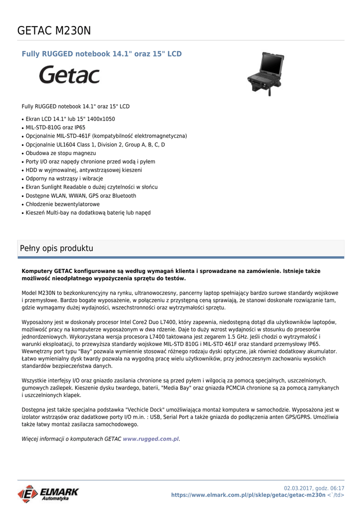 GETAC M230N Fully RUGGED notebook 14.1" oraz 15" LCD Fully RUGGED notebook 14.1" oraz 15" LCD ● Ekran LCD 14.1" lub 15" 1400x1050 ● MIL-STD-810G oraz IP65 ● Opcjonalnie MIL-STD-461F (kompatybilność elektromagnetyczna) ● Opcjonalnie UL1604 Class 1, Division 2, Group A, B, C, D ● Obudowa ze stopu magnezu ● Porty I/O oraz napędy chronione przed wodą i pyłem ● HDD w wyjmowalnej, antywstrząsowej kieszeni ● Odporny na wstrząsy i wibracje ● Ekran Sunlight Readable o dużej czytelności w słońcu ● Dostępne WLAN, WWAN, GPS oraz Bluetooth ● Chłodzenie bezwentylatorowe ● Kieszeń Multi-bay na dodatkową baterię lub napęd Pełny opis produktu Komputery GETAC konfigurowane są według wymagań klienta i sprowadzane na zamówienie. Istnieje także możliwość nieodpłatnego wypożyczenia sprzętu do testów. Model M230N to bezkonkurencyjny na rynku, ultranowoczesny, pancerny laptop spełniający bardzo surowe standardy wojskowe i przemysłowe. Bardzo bogate wyposażenie, w połączeniu z przystępną ceną sprawiają, że stanowi doskonałe rozwiązanie tam, gdzie wymagamy dużej wydajności, wszechstronności oraz wytrzymałości sprzętu. Wyposażony jest w doskonały procesor Intel Core2 Duo L7400, który zapewnia, niedostępną dotąd dla użytkowników laptopów, możliwość pracy na komputerze wyposażonym w dwa rdzenie. Daje to duży wzrost wydajności w stosunku do proesorów jednordzeniowych. Wykorzystana wersja procesora L7400 taktowana jest zegarem 1.5 GHz. Jeśli chodzi o wytrzymałość i warunki eksploatacji, to przewyższa standardy wojskowe MIL-STD 810G i MIL-STD 461F oraz standard przemysłowy IP65. Wewnętrzny port typu "Bay" pozwala wymiennie stosować różnego rodzaju dyski optyczne, jak również dodatkowy akumulator. Łatwo wymienialny dysk twardy pozwala na wygodną pracę wielu użytkowników, przy jednoczesnym zachowaniu wysokich standardów bezpieczeństwa danych. Wszystkie interfejsy I/O oraz gniazdo zasilania chronione są przed pyłem i wilgocią za pomocą specjalnych, uszczelnionych, gumowych zaślepek. Kieszenie dysku twardego, baterii, "Media Bay" oraz gniazda PCMCIA chronione są za pomocą zamykanych i uszczelnionych klapek. Dostępna jest także specjalna podstawka "Vechicle Dock" umożliwiająca montaż komputera w samochodzie. Wyposażona jest w izolator wstrząsów oraz dadatkowe porty I/O m.in. : USB, Serial Port a także gniazda do podłączenia anten GPS/GPRS. Umożliwia także łatwy montaż zasilacza samochodowego. Więcej informacji o komputerach GETAC www.rugged.com.pl. 02.03.2017, godz. 06:17 https://www.elmark.com.pl/pl/sklep/getac/getac-m230n <`/td> Modele Akcesoria i dodatki Symbol Opis Prosimy o kontakt pod nr tel. 022 773 79 37 lub email [email protected] 02.03.2017, godz. 06:17 https://www.elmark.com.pl/pl/sklep/getac/getac-m230n <`/td>