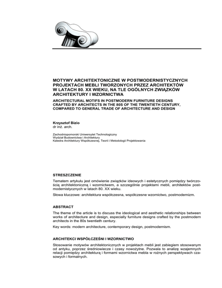 MOTYWY ARCHITEKTONICZNE W POSTMODERNISTYCZNYCH PROJEKTACH MEBLI TWORZONYCH PRZEZ ARCHITEKTÓW W LATACH 80. XX WIEKU, NA TLE OGÓLNYCH ZWIĄZKÓW ARCHITEKTURY I WZORNICTWA ARCHITECTURAL MOTIFS IN POSTMODERN FURNITURE DESIGNS CRAFTED BY ARCHITECTS IN THE 80S OF THE TWENTIETH CENTURY, COMPARED TO GENERAL TRADE OF ARCHITECTURE AND DESIGN Krzysztof Bizio dr inż. arch. Zachodniopomorski Uniwersytet Technologiczny Wydział Budownictwa i Architektury Katedra Architektury Współczesnej, Teorii i Metodologii Projektowania STRESZCZENIE Tematem artykułu jest omówienie związków ideowych i estetycznych pomiędzy twórczością architektoniczną i wzornictwem, a szczególnie projektami mebli, architektów postmodernistycznych w latach 80. XX wieku. Słowa kluczowe: architektura współczesna, współczesne wzornictwo, postmodernizm. ABSTRACT The theme of the article is to discuss the ideological and aesthetic relationships between works of architecture and design, especially furniture designs crafted by the postmodern architects in the 80s twentieth century. Key words: modern architecture, contemporary design, postmodernism. ARCHITEKCI WSPÓŁCZEŚNI I WZORNICTWO Stosowanie motywów architektonicznych w projektach mebli jest zabiegiem stosowanym od antyku, poprzez średniowiecze i czasy nowożytne. Pozwala to analizę wzajemnych relacji pomiędzy architekturą i formami wzornictwa mebla w rożnych perspektywach czasowych i formalnych. 146 p r z e s t r z e ń i FORMa ‘15 Rozwój nowoczesnego wzornictwa powiązany jest wyjątkowo blisko z rozwojem współczesnej architektury. Na fakt ten wpłynęły dwa podstawowe czynniki. Po pierwsze rozwój współczesnego wzornictwa, podobnie jak rozwój współczesnej architektury, sprzęgnięty był z ogólnymi tendencjami w rozwoju społecznym ostatnich stu sześćdziesięciu lat. Po drugie przez znaczną część tego okresu architekci stanowili podstawową kadrę projektantów wzornictwa i dopiero stosunkowo niedawno doszło do usamodzielnienia zawodu projektanta form przemysłowych, choć nadal wśród osób zajmujących się wzornictwem architekci zajmują jedną z wiodących pozycji. Początki związków architektury i wzornictwa współczesnego związane były z narodzinami architektury nowoczesnej i rozwojem przemysłu około 1850 roku. Architekci, poza projektantami samoukami, stanowili wówczas podstawową kadrę zajmującą się projektowaniem dla przemysłu. Przykładem działań demonstrujących nowe podejście, łączących idee architektoniczne i idee wzornictwa, może być projekt krzesła i ławki ogrodowej Potsdam z 1825 roku autorstwa Karla Friedricha Schinkela (1791-1841). Autor ten, wokół którego stworzyła się jedna z najbardziej charakterystycznych szkół architektonicznych pierwszej połowy XIX wieku, kojarzony jest przede wszystkim z twórczością architektoniczną. Przyjęte przez niego zasady kompozycji formy bazowały na zredukowanej interpretacji form historycznych, w tym szczególnie form klasycznych. Projekt krzesła i ławki ogrodowej Podstam stanowi jedno z jego najbardziej oryginalnych dzieł, w którym udało mu się wyjść poza schemat zredukowanej formy historycznej. Żeliwna konstrukcja ławki zaskakuje harmonijnym połączeniem form historycznych i przetworzonej formy bionicznej, nawiązującej do roślinności ogrodowej. W okresie tym także inni architekci tworzyli projekty mebli. Rewolucja przemysłowa wprowadzała nowoczesne rozwiązania techniczne, ale bazowała na formach historycznych. W Anglii większość mebli okresu regencji i epoki wiktoriańskiej była bardzo ozdobna i wykorzystywała motywy architektoniczne. Podobne tendencje panowały także we Francji i w Niemczech. Przezwyciężeniem tych tendencji stał się ruch Arts and Crafts 1, w ramach, którego podjęto próbę stworzenia nowej estetyki, która łączyłaby problemy architektury i przedmiotów użytkowych. Pierwszym z momentów szczególnej aktywności architektów w obszarze wzornictwa była secesja. Większość ze znanych twórców architektury secesyjnej tworzyła także w obszarze wzornictwa, a szczególnie mebla. Było to konsekwencją charakterystycznej dla secesji próby stworzenia działa totalnego, które łączyłoby różne dziedziny sztuki. We Francji szczególnie interesujące w tym względzie były działania Hectora Guimarda (167-1949), przedstawiciela paryskiego nurtu secesji, autora wielu projektów mebli drewnianych w formie zbliżonej do jego najbardziej znanego działa architektonicznego, jakim było wejście do metra Paris Metropolitan z 1900 roku. Swoje doświadczenia w projektowaniu mebli posiadał także Antonio Gaudi (1852-1926), który wykonywał indywidualne projekty wnętrz i mebli do większości własnych prac architektonicznych. Do historii wzornictwa przeszło krzesło z Casa Calvet (1898-1900). W Glasgow pracuje Charles Rennie Mackintosh (1868-1928), autor klasycznego fotela zaprojektowanego dla rezydencji Hill House z 1904 roku. Osobną grupę tworzą architekci secesji wiedeńskiej. Otto Wagner (18411918) projektuje m. in. wnętrza i fotele dla Austrian Post Bank (1905-1906), Josef Maria Olbrich (1867-1908) projektuje m. in. fotel z pokoju gościnnego Willi Fridmanna (18981899). Jednak najbardziej zróżnicowane stają się prace Josefa Hoffmanna (1870-1955), który do historii architektury przeszedł projektem Palais Stoclet w Brukseli (1905-1911), a w historii wzornictwa zapisał się dziesiątkami dzieł urządzeń codziennego użytku projektowanych dla Winer Werkstatte, oraz mebli (np. Sitzmaschine z 1908 roku). Należy także podkreślić działalność projektową Henry van de Veldego (1863-1957), belgijskiego malarza, architekta i projektanta mebli, który przeszedł w swej twórczości różne okresy stylistyczne, zapoczątkowane pracami secesyjni (m. in. klasyczne krzesło Bloemenwerf 1 Obiektem realizującym idee Arts and Crafts był zaprojektowany przez Philipa Webba (1831-1915) Red House w 