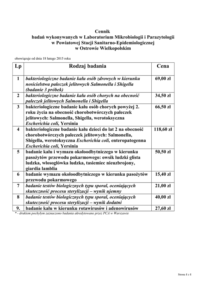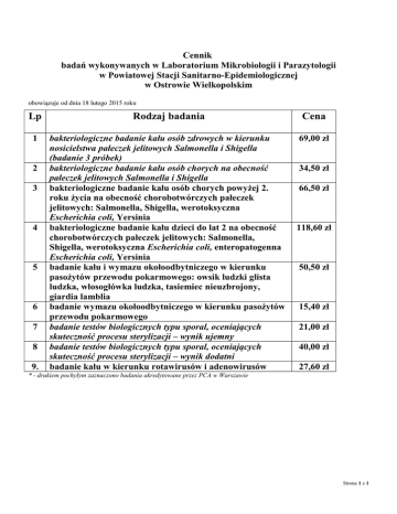 Cennik badań wykonywanych w Laboratorium Mikrobiologii i Parazytologii w Powiatowej Stacji Sanitarno-Epidemiologicznej w Ostrowie Wielkopolskim obowiązuje od dnia 18 lutego 2015 roku Lp Rodzaj badania Cena 1 bakteriologiczne badanie kału osób zdrowych w kierunku nosicielstwa pałeczek jelitowych Salmonella i Shigella (badanie 3 próbek) bakteriologiczne badanie kału osób chorych na obecność pałeczek jelitowych Salmonella i Shigella bakteriologiczne badanie kału osób chorych powyżej 2. roku życia na obecność chorobotwórczych pałeczek jelitowych: Salmonella, Shigella, werotoksyczna Escherichia coli, Yersinia bakteriologiczne badanie kału dzieci do lat 2 na obecność chorobotwórczych pałeczek jelitowych: Salmonella, Shigella, werotoksyczna Escherichia coli, enteropatogenna Escherichia coli, Yersinia badanie kału i wymazu okołoodbytniczego w kierunku pasożytów przewodu pokarmowego: owsik ludzki glista ludzka, włosogłówka ludzka, tasiemiec nieuzbrojony, giardia lamblia badanie wymazu okołoodbytniczego w kierunku pasożytów przewodu pokarmowego badanie testów biologicznych typu sporal, oceniających skuteczność procesu sterylizacji – wynik ujemny badanie testów biologicznych typu sporal, oceniających skuteczność procesu sterylizacji – wynik dodatni badanie kału w kierunku rotawirusów i adenowirusów 69,00 zł 2 3 4 5 6 7 8 9. 34,50 zł 66,50 zł 118,60 zł 50,50 zł 15,40 zł 21,00 zł 40,00 zł 27,60 zł * - drukiem pochyłym zaznaczono badania akredytowane przez PCA w Warszawie Strona 1 z 1