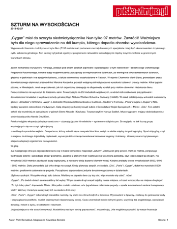 SZTURM NA WYSOKOŚCIACH 2013-12-27 „Cygan” miał do szczytu siedmiotysięcznika Nun tylko 97 metrów. Zawrócił! Ważniejsze było dla niego sprowadzenie na dół kumpla, którego dopadła choroba wysokościowa. Wyprawa do Kaszmiru i zdobycie szczytu Nun (7135 metrów nad poziomem morza) dla naszych specjalsów miały być ukoronowaniem trzyletniego cyklu szkolenia górskiego. Ten trening był jednak zgodny z programami natowskimi zakładającymi między innymi szkolenie w granicznych warunkach klimatu. Zanim komandosi wyruszyli w Himalaje, przeszli pod okiem polskich alpinistów i speleologów, w tym ratowników Tatrzańskiego Ochotniczego Pogotowia Ratunkowego, kolejne etapy wtajemniczenia: począwszy od wspinaczki na ściankach, po treningi na kilkusetmetrowych ścianach, głęboko w jaskiniach i na alpejskim lodowcu, a także ratownictwo wysokościowe w Tatrach. W rejonie Chamonix-Mont-Blanc, prowadzeni przez doświadczonego alpinistę i przewodnika Marcina Kacperka, przeszli wstępną aklimatyzację na wysokości czterech tysięcy metrów. Kilka tygodni później, w Himalajach, mieli się przekonać, jak ich organizmy zareagują na długotrwały wysiłek przy niskim ciśnieniu i niedoborze tlenu. Polscy żołnierze nie wyruszyli do Kaszmiru sami. Towarzyszyło im 25 hinduskich wojskowych, a wśród nich znakomicie przygotowani i doświadczeni himalaiści z wojskowej szkoły górskiej High Altitude Warfare School w Gulmarg (HAWS). W skład polskiej ekipy wchodzili instruktorzy górscy: „Dziadzia” z GROM-u, „Wujo” z Jednostki Wojskowej Komandosów z Lublińca, „Gadzin” z Formozy, „Paris” z Agatu i „Cygan” z Nila, będący zarazem ratownikiem medycznym. Całą ekspedycję koordynowali ludzie z Dowództwa Wojsk Specjalnych – Mirek i „Gilu”. Ten ostatni szkolił się wcześniej ze specjalsami w górach Sierra Nevada i Kaukazu. Towarzyszył im Narcyz Sadłoń, lekarz wyprawy, mający doświadczenie z siedmiotysięcznika Nanda Devi East. Polsko-indyjsko ekspedycja była prowadzona – używając języka himalaistów – systemem oblężniczym. Ze względu na tak liczną grupę wspinających się na szczyt był to jedyny z możliwych sposobów wejścia. Gospodarze, którzy szkolili się w masywie Nun Kun, wzięli na siebie między innymi logistykę. Spod stóp góry, czyli z miejsca, do którego dojeżdżały ciężarówki, wyruszyła kilkudziesięcioosobowa karawana tragarzy i żołnierzy. Mozolny marsz był pierwszym etapem adaptacji organizmów do wysokości. W górę Już następnego dnia po zagospodarowaniu się w bazie komandosi rozpoczęli „szturm”. Zdobywali górę powoli, metr po metrze, poręczując trudniejsze odcinki i zakładając obozy pośrednie. Zgodnie z planem mieli wędrować na tak zwaną zakładkę, czyli jeden zespół za drugim. Na wysokości 3500 metrów zbudowali bazę logistyczną, a następny obóz bazowy kilometr wyżej. Kolejne znalazły się na wysokościach 5500, 6100 i 6500 metrów. Dalej prowadziła już tylko droga na szczyt. Kiedy pierwszy zespół, w składzie „Gilu”, „Paris” i „Cygan”, dotarł na wysokość 5500 metrów, gwałtownie załamała się pogoda. Początkowo zapowiadano jedynie dwudniową przerwę w działaniach. „Byliśmy spokojni. Wszystko dotąd szło dobrze. Mieliśmy w zapasie dwa czy trzy dni, więc musiało się udać”, mówi „Cygan”. „Po dwóch dniach zamierzaliśmy iść wyżej. W tym czasie drugi zespół zająłby nasze miejsce, a trzeci wskoczyłby na miejsce drugiego”. „To był dobry plan”, dopowiada Mirek. „Wszystko zostało ustalone, a tu tygodniowe załamanie pogody – spada temperatura i naciera huraganowy wiatr”. Wichury i śnieżyce zatrzymały ich na siedem dni i nocy. „Gilu”, „Paris” i „Cygan” zakotwiczyli niewielkie namioty, by wiatr nie zdmuchnął ich z lodowca. Wyposażeni w śpiwory, zestawy do gotowania wody i przyrządzania posiłków, musieli przetrzymać nieplanowany postój. Czas urozmaicali sobie różnymi grami, uczyli się też angielskiego, opowiadali dowcipy, mówili o życiu, o kobietach i rodzinach. „Najważniejsze to nie stracić motywacji. Musieliśmy nad tym trochę popracować”, wspominają. „Nie mogliśmy pozwolić, by nasze frustracje Autor: Piotr Bernabiuk, Magdalena Kowalska-Sendek Strona: 1 sprawiły, że zrezygnowani wrócimy na dół. Trzeba było utrzymać gotowość i zaatakować szczyt”. „Było potwornie zimno, temperatura spadała w nocy do minus 30 stopni Celsjusza. Strasznie wiało. Najprostsze czynności były dla nas bardzo trudne. Siedzieliśmy w namiotach zasypywanych śniegiem”, wspomina „Gilu”. „Jeśli chcesz jeść, musisz wyjść z namiotu po śnieg, który stopisz i dopiero wtedy ugotujesz jedzenie. Jeśli chcesz się wysikać, musisz iść do wychodka 150 metrów dalej. No i zdejmij kombinezon przy takiej pogodzie…”, opowiada „Paris”. Przestali odśnieżać namioty, które nieustannie były zasypywane grubą warstwą puchu. Gdy śniegiem myli talerze, zamarzały im ręce. Postanowili jednak, że to właśnie oni zaatakują szczyt. Rolą pozostałych komandosów było ewentualne wsparcie. „W dniu ataku szczytowego byliśmy z Narcyzem na wysokości 5600 metrów, w obozie pierwszym, w którym doktor urządził swój »szpital«. Gotowaliśmy gar wody, przygotowywaliśmy płyny izotoniczne i zupki. Poiliśmy i karmiliśmy zarówno Hindusów, jak i naszych. Niżej, w bazie, w gotowości oczekiwał lekarz gospodarzy”, opowiada Mirek z DWS i dodaje: „Zadanie dostał także drugi zespół szturmowy, złożony z »Gadziny«, »Wuja« i »Dziadzia«. Tydzień przymusowego czekania odcisnął na nich swoje piętno, ale nadal byli w niezłej formie. Mieli wyruszyć na 6500 metrów, założyć obóz drugi, rozbić namioty, gotować herbatę, szykować jedzenie, czekać na wracających. A jakby coś złego się działo, mieli iść w stronę wierzchołka i sprowadzać kolegów”. Naj