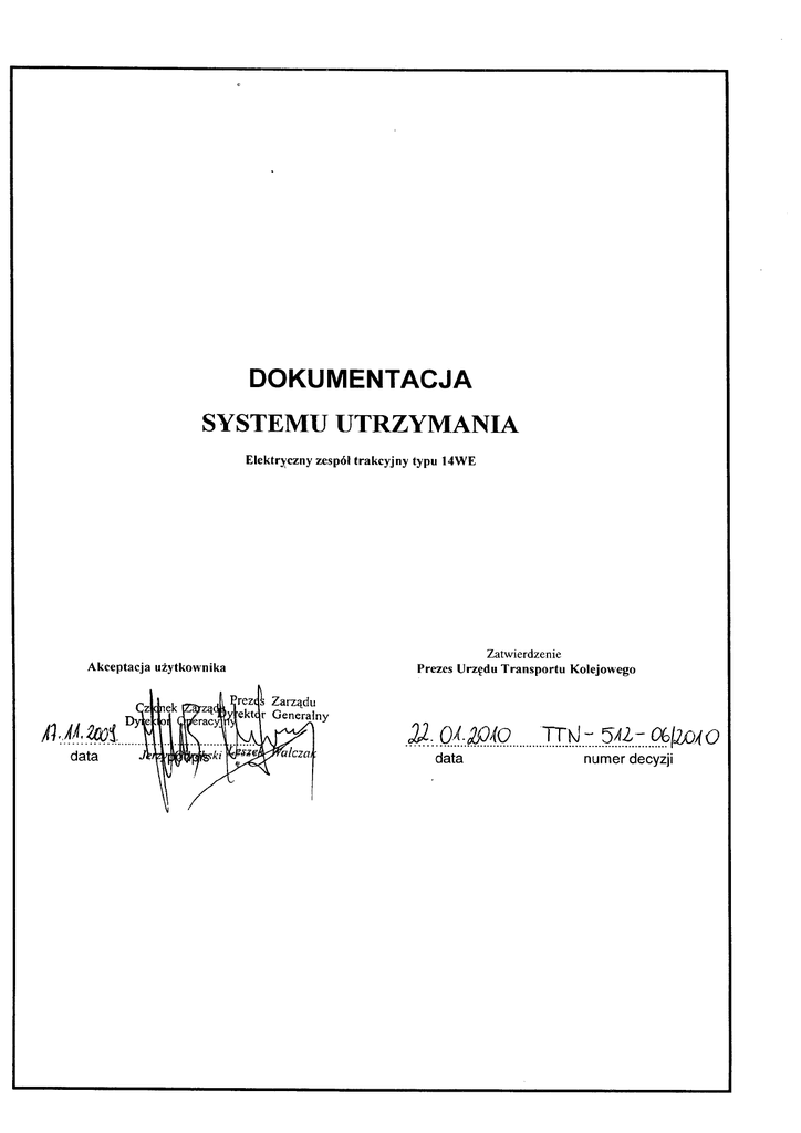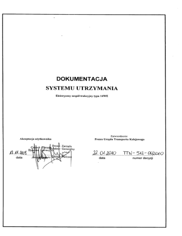 UŜytkownik pojazdu kolejowego Dokumentacja systemu utrzymania Opracował Szybka Kolej Miejska Sp. z o.o. Warszawa (SKMWA) NEWAG Spółka Akcyjna 08.2005 Data Nr NS/14WE/900/1624/05 Strona 1 Arkusz [strona] 1[1/1] Załącznik [strona] KARTA INFORMACYJNA 1. RODZAJ POJAZDU KOLEJOWEGO Elektryczny zespół trakcyjny 2. TYP POJAZDU Oznaczenie uŜytkownika Kod konstrukcyjny 100 14WE 3. ŚWIADECTWO DOPUSZCZENIA DO EKSPLOATACJI TYPU POJAZDU KOLEJOWEGO Numer świadectwa Data wydania T/2007/0136 23.07.2007 r. 4. DOKUMENTACJA BAZOWA Warunki techniczne Autor Dokumentacja techniczno-ruchowa Odbioru Wykonania Energocontrol Sp. z o.o. Kraków Autor NEWAG Spółka Akcyjna Autor NEWAG Spółka Akcyjna 5. ZAŚWIADCZENIE UśYTKOWNIKA Zaświadczam, Ŝe w niniejszej dokumentacji technologicznej systemu utrzymania dla zapewnienia bezpieczeństwa w transporcie kolejowym zastosowano obowiązujące Polskie Normy, przepisy i regulaminy międzynarodowe. Podpis uŜytkownika 6. DATA I NR DECYZJI ZATWIERDZAJĄCEJ PREZESA URZĘDU TRANSPORU KOLEJOWEGO Data 22.01.2010 Numer TTN-512-06/2010 Użytkownik pojazdu kolejowego Szybka Kolej Miejska Sp. z o.o. Warszawa (SKMWA) Dokumentacja systemu utrzymania Opracował Data 08.2005 NEWAG Spółka Akcyjna Nr NS/14WE/900/1624/05 Strona 2 Arkusz [strona] 2[1/3] Załącznik [strona] SPIS TREŚCI Treść LP. Strona Arkusz 1 Karta informacyjna. 1 1 2 Spis treści 2 2 3 Wstęp. 5 3 4 Cykl obsługiwania 12 4 5 Karta zmian. 14 5 6 Normy. 15 6 7 Karta cyklu obsługiwania. Elektryczny zespół trakcyjny 14WE. 18 7 22 8 29 9 8 9 Opis funkcjonalny pojazdu z podziałem na jego elementy składowe w procesie utrzymania. Zestawienie parametrów mierzonych w procesie przeglądu lub naprawy i opis metod pomiarowych. 10 Wykaz urządzeń i narzędzi specjalistycznych. 32 10 11 Wykaz testów wykonywanych w trakcie utrzymania. 33 11 34 12 35 13 12 13 Wymagania dotyczące kwalifikacji pracowników oraz wymagania szczególne w zakresie czynności spawania i badań nieniszczących. Ograniczenia związane z bezpieczeństwem i interoperacyjnością dla podzespołów lub części istotnych dla bezpieczeństwa i interoperacyjności. 14 Wykaz podzespołów objętych dozorem technicznym. 36 14 15 Zarządzanie dokumentacją. 37 15 16 Ewidencja informacji i bezpiecznego dostępu do informacji. 38 16 Obsługi poziomów 1,2,3 17 Karta obsług poziomu 1,2,3. Ostoja. 39 F2 18 Karta obsług poziomu 1,2,3. Pudło. 40 F3 19 Karta obsług poziomu 1,2,3. Wózki. 41 F4 20 Karta obsług poziomu 1,2,3. Zestawy kołowe z łożyskami, maźnicami i zawieszeniem silników trakcyjnych. 42 F5 21 Karta obsług poziomu 1,2,3. Sprzęgi. 43 F8 22 Karta obsług poziomu 1,2,3. Układ hamulcowy i układ sprężonego powietrza. 44 F9 23 Karta obsług poziomu 1,2,3. Wentylacja, klimatyzacja i ogrzewanie. 47 F11 24 Karta obsług poziomu 1,2,3. Wyposażenie wnętrza. 48 F13 25 Karta obsług poziomu 1,2,3. Bateria akumulatorów. 49 F14 26 Karta obsług poziomu 1,2,3. Oświetlenie i instalacja elektryczna. 50 F15 27 Karta obsług poziomu 1,2,3. Maszyny i aparaty elektryczne. 52 F17 28 Karta obsług poziomu 1,2,3. Przyrządy kontrolno – pomiarowe. 56 F24 29 Karta obsług poziomu przeciwpożarowe. 57 F25 30 Karta obsług poziomu 1,2,3. System smarowania. 59 F26 31 Karta obsług poziomu 1,2,3. Instalacja rozgłoszeniowa, tablice kierunkowe, system kasowników. 60 F28 32 Karta obsług poziomu 1,2,3. Instalacja zamykania i blokowania drzwi. 61 F29 1,2,3. Urządzenia i systemy czujności, urządzenia Załącznik Użytkownik pojazdu kolejowego Dokumentacja systemu utrzymania Opracował Szybka Kolej Miejska Sp. z o.o. Warszawa (SKMWA) Data NEWAG Spółka Akcyjna 08.2005 Nr NS/14WE/900/1624/05 Strona 3 Arkusz [strona] 2[2/3] Załącznik [strona] SPIS TREŚCI Treść LP. 33 Strona Karta obsług poziomu 1,2,3. Pojazd kolejowy kompletny po obsłudze. Arkusz Załącznik 62 F31 Obsługi poziomów 4,5 34 Karta obsług poziomu 4,5. Pojazd szynowy kompletny. 63 F1 35 Karta obsług poziomu 4,5. Ostoja. 64 F2 36 Karta obsług poziomu 4,5. Pudło. 65 F3 37 Karta obsług poziomu 4,5. Wózki. 67 F4 38 Karta obsług poziomu 4,5. Zestawy kołowe z łożyskami, maźnicami i zawieszeniem silników trakcyjnych. 69 F5 39 Karta obsług poziomu 4,5. Sprzęgi . 72 F8 40 Karta obsług poziomu 4,5. Układ hamulcowy i układ sprężonego powietrza. 73 F9 41 Karta obsług poziomu 4,5. Wentylacja, klimatyzacja i ogrzewanie. 78 F11 42 Karta obsług poziomu 4,5. Wyposażenie wewnętrzne. 81 F13 43 Karta obsług poziomu 4,5. Bateria akumulatorów. 82 F14 44 Karta obsług poziomu 4,5. Oświetlenie i instalacja elektryczna. 83 F15 45 Karta obsług poziomu 4,5. Maszyny i aparaty elektryczne. 85 F17 46 Karta obsług poziomu 4,5. Przyrządy kontrolno – pomiarowe. 89 F24 47 Karta obsług poziomu przeciwpożarowe. 90 F25 48 Karta obsług poziomu 4,5. System smarowania. 91 F26 49 Karta obsług poziomu 4,5. Instalacja rozgłoszeniowa, tablice kierunkowe, system kasowników i monitoringu. 92 F28 50 Karta obsług poziomu 4,5. Instalacja zamykania i blokowania drzwi. 93 F29 51 Karta obsług poziomu 4,5. Pojazd szynowy kompletny po naprawie. 94 F31 4,5. Urządzenia i systemy czujności, urządzenia Załączniki – wzory kart pomiarowych z wykazem wartości konstrukcyjnych, ponaprawczych i kresowych parametrów dla zespołów, podzespołów i elementów pojazdu 52 Protokół. Arkusz pomiarowy ostoi wagonu 410B. 95 F2 1 53 Protokół. Arkusz pomiarowy ostoi wagonu 309B. 97 F2 2 54 Karta pomiarowa czopa skrętu. 99 F2 3 55 Protokół. Arkusz pomiarowy pudła wagonu 410B. 100 F3 1 56 Protokół. Arkusz pomiarowy pudła wagonu 309B. 103 F3 2 57 Protokół odbioru ramy wózka i belki bujakowej elektrycznego zespołu trakcyjnego typu 14WE. 106 F4 1 58 Protokół odbioru luzów węzła przymaźniczego elektrycznego zespołu trakcyjnego 14WE 108 F4 2 59 Protokół odbioru zestawów kołowych elektrycznego zespołu trakcyjnego 14WE 110 F4 3 60 Karta pomiarowa gniazda czopa skrętu. 113 F4 4 Użytko