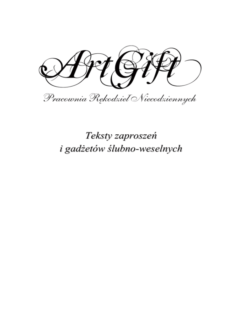 Teksty do zaproszeń i gadżetów ślubno-weselnych Teksty zaproszeń i gadżetów ślubno-weselnych Strona 1 Teksty do zaproszeń i gadżetów ślubno-weselnych Strona 2 Teksty do zaproszeń i gadżetów ślubno-weselnych SPIS TREŚCI Teksty do zaproszeń na Chrzest Teksty do zaproszeń na Komunię Teksty do zaproszeń urodzinowych Teksty do zaproszeń ślubnych Zamiast kwiatów i prezentów 4 10 14 17 Wino Książki Kupony LOTTO Upominki na Dom Dziecka Coś innego Zamiast prezentów pieniądze Do schroniska 38 40 42 44 46 47 50 Teksty do Księgi Gości Teksty zawieszek na alkohol Strona 3 51 54 Teksty do zaproszeń i gadżetów ślubno-weselnych Teksty do zaproszeń na chrzest TEKST 1. Anna Kowalska wraz z Rodzicami z radością pragnie zaprosić Babcie Krysię na uroczyste przyjęcie Sakramentu Chrztu Świętego które odbędzie się w dniu 14 maja 2012 roku o godzinie 9.30 w Kościele pw. Św. Wawrzyńca w Kutnie. ************************** TEKST 2. Serdecznie zapraszamy W. P. ............................................. na uroczystość przyjęcia Sakramentu Chrztu Świetego przez naszą córkę Annę Kowalską która odbędzie się w dniu 14 maja 2011 roku o godzinie 9.30 w Kościele pw. Św. Wawrzyńca w Kutnie. Marzena i Artur ************************** Strona 4 Teksty do zaproszeń i gadżetów ślubno-weselnych TEKST 3. Anna Kowalska wraz z Rodzicami z wielką przyjemnością pragnie zaprosić Babcie Krysię na uroczystość przyjęcia Sakramentu Chrztu Świetego która odbędzie się w dniu 14 maja 2011 roku o godzinie 9.30 w Kościele pw. Św. Wawrzyńca w Kutnie. ************************** TEKST 4. Dnia 14 maja 2007 roku o godzinie 9.30 w Kościele p. w. Św. Wawrzyńca w Kutnie nasza córka Anna Kowalska przyjmie Sakrament Chrztu Świętego Na uroczystość serdecznie zapraszamy Sz. P. Jana Kowalskiego - Anita i Adam ************************** Strona 5 Teksty do zaproszeń i gadżetów ślubno-weselnych TEKST 5. Anna Kowalska wraz z Rodzicami z radością pragnie zaprosić Babcie Krysię na uroczystość przyjęcia Sakramentu Chrztu Świetego, która odbędzie się w dniu 14 maja 2011 roku o godzinie 9.30 w Kościele pw. Św. Wawrzyńca w Kutnie. ************************** TEKST 6. Niniejszym mamy przyjemność zaprosić Babcie Krysię na uroczystość przyjęcia Sakramentu Chrztu Świetego przez naszą córkę Annę Kowalską w dniu 14 maja 2011 roku o godzinie 9.30 w Kościele pw. Św. Wawrzyńca w Kutnie. Małgorzata i Tomasz Kowalscy ************************** TEKST 7. W tym szczególnym dniu mamy zaszczyt zaprosić Babcie Krysię na uroczystość przyjęcia Sakramentu Chrztu Świetego przez Piotrusia Komorowskiego która odbędzie się dnia 9 września 2011 roku o godzinie 12.00 w Kościele pw. Św. Wawrzyńca w Kutnie. Strona 6 Teksty do zaproszeń i gadżetów ślubno-weselnych TEKST 8. Pragnąc wspólnie przeżyć uroczystość przyjęcia Sakramentu Chrztu Świętego Kinga Solina wraz z rodzicami serdecznie zaprasza Sz. P. Józefę i Henryka Solina do udziału we Mszy świętej, która odbędzie się dnia 14 kwietnia 2011 roku o godzinie 10:00 w kościele Przemienienia Pańskiego w Krakowie. do udziału we Mszy świętej, która odbędzie się dnia 14 kwietnia 2011 roku o godzinie 10:00 w kościele Przemienienia Pańskiego w Krakowie. ************************** TEKST 9. Mamą Chrzestną/ Tatą Chrzestnym nie każda osoba zostać może, -to wyjątkowa osoba, która w przyszłości doradzi, pomoże. Która niezwłocznie przybędzie gdy bardzo potrzebna będzie. Gdy poleci łezka szczęścia chusteczkę poda, dla Alicji czasu jej poświęcić nie będzie szkoda. Taką Mamę Chrzestną dla naszej córki chcieliśmy, dlatego właśnie Ciebie droga Gosiu/ Januszu wybraliśmy. Dziękujemy, Asia i Marek Pragnąc wspólnie przeżyć uroczystość przyjęcia Sakramentu Chrztu Świętego Alicja Nowak wraz z rodzicami serdecznie zaprasza Ciocię Gosię z Wujkiem Jackiem i Lilianką do udziału we Mszy świętej, która odbędzie się dnia 21 sierpnia 2011 roku o godzinie 12.00 w Kościele p.w. Najświętszego Serca Pana Jezusa w Będzinie. Strona 7 Teksty do zaproszeń i gadżetów ślubno-weselnych Przyjęcie 1. Po uroczystości zapraszamy na przyjęcie do restauracji "Rodeo" ul. Słoneczna 8 w Warszawie. 2. Honorem wielkim będzie nam gościć czcigodnych gości na przyjęciu z tej okazji, które odbędzie się w naszym domu przy ul. Pięknej 55 w Warszawie. 3. Po uroczystości miło nam będzie gościć W. P. na przyjęciu w restauracji "Rodeo" ul. Słoneczna 8 w Warszawie 4. Miło nam będzie gościć Państwa na przyjęciu które odbędzie się w restauracji "Rodeo" ul. Słoneczna 8 w Warszawie Wierszyki 1. "Serce tak ciche, jak wiatr z muszelki Daj mi, o Panie - Boże mój Wielki. Daj mi też święte rączki i nóżki, Żeby trzymały się Twojej dróżki." 2. Dziecko to dar od Pana, to cząstka Nieba na ziemi. 3. Malutki Jaś do Kościoła przyniesiony przez Chrzest zostanie Bogu powierzony. 4. Niechaj Bóg Cię błogosławi Niech przy Tobie zawsze trwa Niechaj Będzie Bożym dziełem każda chwila Twa. Strona 8 Teksty do zaproszeń i gadżetów ślubno-weselnych 5. Przyjdź Panie Jezu do serca mojego malutkiego. Napełnij szczęściem serce me. Ono czeka na Ciebie w dniu Chrztu Świętego. 6. W czasie Chrztu Świętego Pan Jezus powiedział do mnie po imieniu i podarował mi swoje życie. 7. Jezu najsłodszy, Ojcze i Panie dziś moje pierwsze z Tobą spotkanie. Przyjmij w ofierze me serce małe by Cie kochało me życie całe. 8. Przyjdź o Jezu proszę Cię, Niech Twym dzieckiem stanę się. Broń od złego duszę mą, Niech na wieki będzie Twą 9. Małe rączki potrafią ulepić kwiatek z plasteliny, Narysować słońce roześmiane, zbudować domek z klocków. Małe raczki potrafią spleść się nad szyją i otrzeć łzy W małych rączkach mieści się cała miłość. Strona 9 Teksty do zaproszeń i gadżetów ślubno-weselnych Teksty do zaproszeń na komunię T