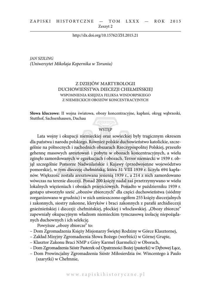 ZAPISKI HISTORYCZNE — TOM Zeszyt 2 LXXX — ROK 2015 http://dx.doi.org/10.15762/ZH.2015.21 JAN SZILING (Uniwersytet Mikołaja Kopernika w Toruniu) Z DZIEJÓW MARTYROLOGII DUCHOWIEŃSTWA DIECEZJI CHEŁMIŃSKIEJ WSPOMNIENIA KSIĘDZA FELIKSA WINDORPSKIEGO Z NIEMIECKICH OBOZÓW KONCENTRACYJNYCH Słowa kluczowe: II wojna światowa, obozy koncentracyjne, kapłani, okręg wąbrzeski, Stutthof, Sachsenhausen, Dachau WSTĘP Lata wojny i okupacji niemieckiej oraz sowieckiej były tragicznym okresem dla państwa i narodu polskiego. Również polskie duchowieństwo katolickie, szczególnie na północnych i zachodnich obszarach Rzeczypospolitej Polskiej, przeszło gehennę masowych aresztowań i pobytu w obozach koncentracyjnych, a wielu zginęło zamordowanych w egzekucjach i obozach. Terror niemiecki w 1939 r. objął szczególnie Pomorze Nadwiślańskie i Kujawy (przedwojenne województwo pomorskie), w tym diecezję chełmińską, która 31 VIII 1939 r. liczyła 694 kapłanów. Większość została aresztowana jesienią 1939 r., a 214 z nich zamordowano wówczas na terenie diecezji. Ponad 200 księży nadal zaś przetrzymywano w wielu lokalnych więzieniach i obozach przejściowych. Ponadto w październiku 1939 r. gestapo utworzyło sześć „obozów zbiorczych” dla części duchowieństwa (siódmy zorganizowano w grudniu) i w nich umieszczono ogółem 255 księży diecezjalnych i zakonnych, siostry zakonne, kleryków i braci zakonnych z parafii archidiecezji gnieźnieńskiej i diecezji: chełmińskiej, płockiej i włocławskiej. „Obozy zbiorcze” zapewniały okupacyjnym władzom niemieckim tymczasową izolację niepożądanych duchownych i ich selekcję. Powyższe „obozy zbiorcze” to: – Dom Zgromadzenia Księży Misjonarzy Świętej Rodziny w Górce Klasztornej, – Zakład Misyjny Zgromadzenia Słowa Bożego (werbiści) w Górnej Grupie, – Klasztor Zakonu Braci NMP z Góry Karmel (karmelici) w Oborach, – Dom Zgromadzenia Sióstr Pasterek od Opatrzności Bożej (pasterki) w Dębowej Łące, – Dom Prowincjalny Zgromadzenia Sióstr Miłosierdzia św. Wincentego à Paulo (szarytki) w Chełmnie, w w w. z a p i s k i h i s t o r y c z n e . p l 94 Jan Sziling [258] – Zakład św. Anny w Kamieniu Pomorskim (obecnie: Kamień Krajeński) prowadzony przez Zgromadzenie Sióstr Świętej Elżbiety (elżbietanki), – Dom Księży Emerytów w Zamartem. Od grudnia 1939 r. do kwietnia 1940 r. większość duchownych z powyższych obozów została stopniowo skierowana, przez Zivilgefangenenlager Danzig Neufahrwasser (obóz dla jeńców cywilnych Gdańsk Nowy Port), do Zivilgefangenenlager Stutthof (obóz dla jeńców cywilnych Stutthof). Obóz ten w pierwszym kwartale 1940 r. stał się centralnym obozem gromadzącym aresztowanych kapłanów z diecezji położonych na Pomorzu Nadwiślańskim i Kujawach. W obozie Stutthof umieszczono wówczas także więźniów cywilnych z poszczególnych lokalnych więzień i obozów. W kwietniu 1940 r. w dwóch zbiorowych transportach z tego obozu przekazano około 2000 więźniów do obozu koncentracyjnego Sachsenhausen. Jednym z wielu księży diecezji chełmińskiej, który przeszedł całą charakterystyczną dla duchowieństwa tej diecezji drogę od internowania w obozach zbiorczych do uwięzienia w obozach koncentracyjnych był ks. Feliks Windorpski. Urodził się 8 XI 1907 r. w Bydgoszczy, po studiach w Seminarium Duchownym w Pelplinie otrzymał w 1933 r. święcenia kapłańskie. Wojna i okupacja niemiecka zastały go na stanowisku administratora parafii pw. Świętej Katarzyny Aleksandryjskiej w Osieczku (dekanat brodnicki). Został aresztowany 25 X 1939 r., następnie był więziony w Dębowej Łące, w Chełmnie, w obozie Stutthof, w obozach koncentracyjnych Sachsenhausen i Dachau, a wolność odzyskał 29 IV 1945 r., gdy KL Dachau zajęły wojska amerykańskie. Do maja 1947 r. pozostał na Zachodzie – początkowo przez kilka tygodni był pielęgniarzem w obozowym szpitalu, a następnie spełniał na terenie okupowanych Niemiec posługę duszpasterską w skupiskach polskich. W czerwcu powrócił do Osieczka, w lipcu tegoż roku objął parafię pw. Świętej Małgorzaty w Płużnicy (dekanat wąbrzeski), a w czerwcu 1955 r. został proboszczem parafii pw. Świętego Jakuba Apostoła w Toruniu i pozostał tutaj do przejścia na emeryturę 30 VI 1983 r. Zmarł 21 IX 1985 r. w Austrii, pochowany zaś został na cmentarzu w Toruniu. Po zakończeniu działań wojennych Kuria Biskupia w Pelplinie podjęła akcję zbierania i gromadzenia materiałów dokumentujących straty osobowe i materialne diecezji chełmińskiej pod okupacją niemiecką. Na podstawie tych materiałów została opublikowana broszura pt. Męczeństwo duchowieństwa pomorskiego 1939– –1945. Straty wojenne diecezji chełmińskiej (Pelplin 1947, ss. 59). Między innymi swoje wspomnienia po wojnie z pobytu w niemieckich obozach w latach 1939– –1945 spisał ks. F. Windorpski. Zostały one przesłane do Kurii Biskupiej w Pelplinie, gdzie potwierdzono ich odbiór dnia 24 VI 1947 r. Wspomnienia ks. F. Windorpskiego zawierają informacje o aresztowaniu księży z powiatu wąbrzeskiego 24/25 X 1939 r. i o ich dalszych losach oraz opisują tragiczne warunki pobytu księży polskich w KL Sachsenhausen i w KL Dachau. Życiorys według biogramu autorstwa ks. Anastazego Nadolnego zamieszczonego w: Toruński słownik biograficzny, t. 3, red. Krzysztof Mikulski, Toruń 2002, s. 244. w w w. z a p i s k i h i s t o r y c z n e . p l [259] Z dziejów martyrologii duchowieństwa diecezji chełmińskiej... 95 Z wielkim uznaniem autor opisał postawę ks. Pawła Prabuckiego, Sługi Bożego w procesie beatyfikacyjnym drugiej grupy męczenników z okresu drugiej wojny światowej. Maszynopis wspomnień ks. F. Windorpskiego obejmuje siedem stron, a strony 1–3 i 5–7 zawierają od 56 do 62 wierszy, natomiast strona czwarta zawiera 27 wierszy. Na tej stronie pod tekstem został umieszczony rę