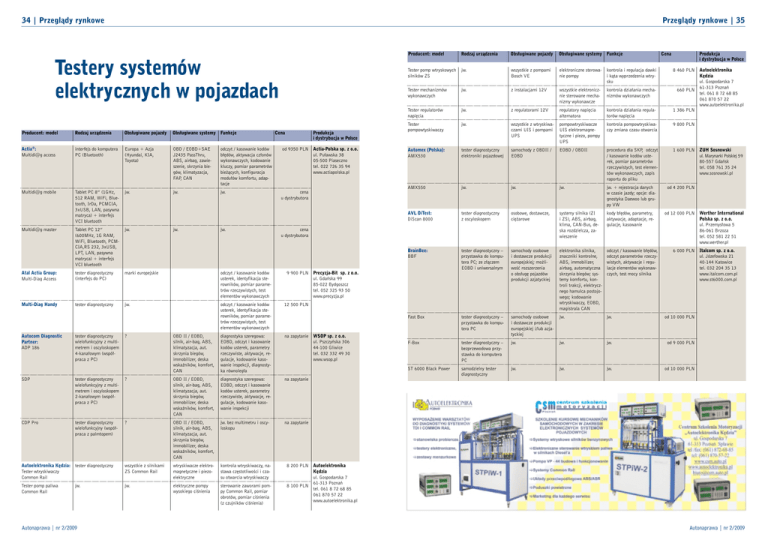 34 | Przeglàdy rynkowe Przeglàdy rynkowe | 35 Testery systemów elektrycznych w pojazdach Producent: model Rodzaj urzàdzenia Obs∏ugiwane pojazdy Obs∏ugiwane systemy Funkcje Actia®: Multidi@g access interfejs do komputera PC (Bluetooth) Europa + Azja (Hyundai, KIA, Toyota) OBD / EOBD+SAE J2435 PassThru, ABS, airbag, zawieszenie, skrzynia biegów, klimatyzacja, FAP, CAN odczyt / kasowanie kodów b∏´dów, aktywacja cz∏onów wykonawczych, kodowanie kluczy, pomiar parametrów bie˝àcych, konfiguracja modu∏ów komfortu, adaptacje od 9350 PLN Actia-Polska sp. z o.o. ul. Pu∏awska 38 05-500 Piaseczno tel. 022 726 35 94 www.actiapolska.pl Multidi@g mobile Tablet PC 8” (1GHz, 512 RAM, WiFi, Bluetooth, IrDa, PCMCIA, 3xUSB, LAN, pasywna matryca) + interfejs VCI bluetooth jw. jw. jw. cena u dystrybutora Tablet PC 12” (600MHz, 1G RAM, WiFi, Bluetooth, PCMCIA,RS 232, 3xUSB, LPT, LAN, pasywna matryca) + interfejs VCI bluetooth jw. Atal Actia Group: Multi-Diag Access tester diagnostyczny (interfejs do PC) marki europejskie odczyt / kasowanie kodów usterek, identyfikacja sterowników, pomiar parametrów rzeczywistych, test elementów wykonawczych Multi-Diag Handy tester diagnostyczny jw. odczyt / kasowanie kodów usterek, identyfikacja sterowników, pomiar parametrów rzeczywistych, test elementów wykonawczych 12 500 PLN OBD II / EOBD, silnik, air-bag, ABS, klimatyzacja, aut. skrzynia biegów, immobilizer, deska wskaêników, komfort, CAN diagnostyka szeregowa: EOBD, odczyt i kasowanie kodów usterek, parametry rzeczywiste, aktywacje, regulacje, kodowanie kasowanie inspekcji, diagnostyka równoleg∏a na zapytanie WSOP sp. z o.o. ul. Pszczyƒska 306 44-100 Gliwice tel. 032 332 49 30 www.wsop.pl Multidi@g master Autocom Diagnostic Partner: ADP 186 tester diagnostyczny wielofunkcyjny z multimetrem i oscyloskopem 4-kana∏owym (wspó∏praca z PC) ? jw. jw. Cena Produkcja i dystrybucja w Polsce ? OBD II / EOBD, silnik, air-bag, ABS, klimatyzacja, aut. skrzynia biegów, immobilizer, deska wskaêników, komfort, CAN diagnostyka szeregowa: EOBD, odczyt i kasowanie kodów usterek, parametry rzeczywiste, aktywacje, regulacje, kodowanie kasowanie inspekcji na zapytanie CDP Pro tester diagnostyczny wielofunkcyjny (wspó∏praca z palmtopem) ? OBD II / EOBD, silnik, air-bag, ABS, klimatyzacja, aut. skrzynia biegów, immobilizer, deska wskaêników, komfort, CAN jw. bez multimetru i oscyloskopu na zapytanie wszystkie z silnikami ZS Common Rail wtryskiwacze elektromagnetyczne i piezoelektryczne kontrola wtryskiwaczy, nastawa cz´stotliwoÊci i czasu otwarcia wtryskiwaczy jw. elektryczne pompy wysokiego ciÊnienia sterowanie zaworami pompy Common Rail, pomiar obrotów, pomiar ciÊnienia (z czujników ciÊnienia) jw. Autonaprawa | nr 2/2009 Obs∏ugiwane pojazdy Obs∏ugiwane systemy Funkcje Tester pomp wtryskowych silników ZS jw. wszystkie z pompami Bosch VE elektroniczne sterowanie pompy kontrola i regulacja dawki i kàta wyprzedzenia wtrysku Tester mechanizmów wykonawczych jw. z instalacjami 12V wszystkie elektronicznie sterowane mechanizmy wykonawcze kontrola dzia∏ania mechanizmów wykonawczych Tester regulatorów napi´cia jw. z regulatorami 12V regulatory napi´cia alternatora kontrola dzia∏ania regulatorów napi´cia Tester pompowtyskiwaczy jw. wszystkie z wtryskiwaczami UIS i pompami UPS pompowtryskiwacze UIS elektromagnetyczne i piezo, pompy UPS kontrola pompowtryskiwaczy zmiana czasu otwarcia 9 800 PLN Automex (Polska): AMX530 tester diagnostyczny elektroniki pojazdowej samochody z OBDII / EOBD EOBD / OBDII procedura dla SKP, odczyt / kasowanie kodów usterek, pomiar parametrów rzeczywistych, test elementów wykonawczych, zapis raportu do pliku 1 600 PLN ZUH Sosnowski ul. Marynarki Polskiej 59 80-557 Gdaƒsk tel. 058 761 35 24 www.sosnowski.pl AMX550 jw. jw. jw. jw. + rejestracja danych w czasie jazdy; opcje: diagnostyka Daewoo lub grupy VW AVL DiTest: DiScan 8000 tester diagnostyczny z oscyloskopem osobowe, dostawcze, ci´˝arowe systemy silnika (ZI i ZS), ABS, airbag, klima, CAN-Bus, deska rozdzielcza, zawieszenie kody b∏´dów, parametry, aktywacje, adaptacje, regulacje, kasowanie BrainBee: BBF tester diagnostyczny – przystawka do komputera PC; ze z∏àczem EOBD i uniwersalnym samochody osobowe i dostawcze produkcji europejskiej; mo˝liwoÊç rozszerzenia o obs∏ug´ pojazdów produkcji azjatyckiej elektronika silnika, znaczniki kontrolne, ABS, immobilizer, airbag, automatyczna skrzynia biegów; systemy komfortu, kontroli trakcji, elektrycznego hamulca postojowego; kodowanie wtryskiwaczy, EOBD, magistrala CAN odczyt / kasowanie b∏´dów, odczyt parametrów rzeczywistych, aktywacje i regulacje elementów wykonawczych, test mocy silnika Fast Box tester diagnostyczny – przystawka do komputera PC samochody osobowe i dostawcze produkcji europejskiej i/lub azjatyckiej jw. jw. od 10 000 PLN F-Box tester diagnostyczny – bezprzewodowa przystawka do komputera PC jw. jw. jw. od 9 000 PLN ST 6000 Black Power samodzielny tester diagnostyczny jw. jw. jw. od 10 000 PLN 9 900 PLN Precyzja-Bit sp. z o.o. ul. Gdaƒska 99 85-022 Bydgoszcz tel. 052 325 93 50 www.precyzja.pl tester diagnostyczny wielofunkcyjny z multimetrem i oscyloskopem 2-kana∏owym (wspó∏praca z PC) Tester pomp paliwa Common Rail Rodzaj urzàdzenia cena u dystrybutora SDP Autoelektronika K´dzia: tester diagnostyczny Tester wtryskiwaczy Common Rail Producent: model Cena Produkcja i dystrybucja w Polsce 8 460 PLN Autoelektronika K´dzia ul. Gospodarska 7 61-313 Poznaƒ 660 PLN tel. 061 8 72 68 85 061 870 57 22 www.autoelektronika.pl 1 386 PLN od 4 200 PLN od 12 000 PLN Werther International Polska sp. z o.o. ul. Przemys∏owa 5 86-061 Brzoza tel. 052 581 22 51 www.werther.pl 6 000 PLN Italcom sp. z o.o. ul. Józefowska 21 40-144 Katowice tel. 032 204 35 13 www.italcom.com.pl www.st6000.com.pl 8 200 PLN Autoelektronika K´dzia ul. Gospodarska 7 61-313 Poznaƒ 8 100 PLN tel. 061 8 72 68 85 061 870 57 22 www.autoelek