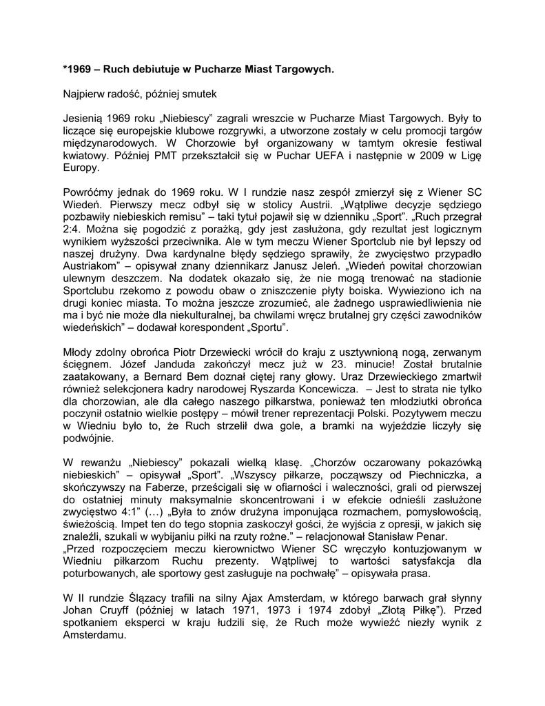 *1969 – Ruch debiutuje w Pucharze Miast Targowych. Najpierw radość, później smutek Jesienią 1969 roku „Niebiescy” zagrali wreszcie w Pucharze Miast Targowych. Były to liczące się europejskie klubowe rozgrywki, a utworzone zostały w celu promocji targów międzynarodowych. W Chorzowie był organizowany w tamtym okresie festiwal kwiatowy. Później PMT przekształcił się w Puchar UEFA i następnie w 2009 w Ligę Europy. Powróćmy jednak do 1969 roku. W I rundzie nasz zespół zmierzył się z Wiener SC Wiedeń. Pierwszy mecz odbył się w stolicy Austrii. „Wątpliwe decyzje sędziego pozbawiły niebieskich remisu” – taki tytuł pojawił się w dzienniku „Sport”. „Ruch przegrał 2:4. Można się pogodzić z porażką, gdy jest zasłużona, gdy rezultat jest logicznym wynikiem wyższości przeciwnika. Ale w tym meczu Wiener Sportclub nie był lepszy od naszej drużyny. Dwa kardynalne błędy sędziego sprawiły, że zwycięstwo przypadło Austriakom” – opisywał znany dziennikarz Janusz Jeleń. „Wiedeń powitał chorzowian ulewnym deszczem. Na dodatek okazało się, że nie mogą trenować na stadionie Sportclubu rzekomo z powodu obaw o zniszczenie płyty boiska. Wywieziono ich na drugi koniec miasta. To można jeszcze zrozumieć, ale żadnego usprawiedliwienia nie ma i być nie może dla niekulturalnej, ba chwilami wręcz brutalnej gry części zawodników wiedeńskich” – dodawał korespondent „Sportu”. Młody zdolny obrońca Piotr Drzewiecki wrócił do kraju z usztywnioną nogą, zerwanym ścięgnem. Józef Janduda zakończył mecz już w 23. minucie! Został brutalnie zaatakowany, a Bernard Bem doznał ciętej rany głowy. Uraz Drzewieckiego zmartwił również selekcjonera kadry narodowej Ryszarda Koncewicza. – Jest to strata nie tylko dla chorzowian, ale dla całego naszego piłkarstwa, ponieważ ten młodziutki obrońca poczynił ostatnio wielkie postępy – mówił trener reprezentacji Polski. Pozytywem meczu w Wiedniu było to, że Ruch strzelił dwa gole, a bramki na wyjeździe liczyły się podwójnie. W rewanżu „Niebiescy” pokazali wielką klasę. „Chorzów oczarowany pokazówką niebieskich” – opisywał „Sport”. „Wszyscy piłkarze, począwszy od Piechniczka, a skończywszy na Faberze, prześcigali się w ofiarności i waleczności, grali od pierwszej do ostatniej minuty maksymalnie skoncentrowani i w efekcie odnieśli zasłużone zwycięstwo 4:1” (…) „Była to znów drużyna imponująca rozmachem, pomysłowością, świeżością. Impet ten do tego stopnia zaskoczył gości, że wyjścia z opresji, w jakich się znaleźli, szukali w wybijaniu piłki na rzuty rożne.” – relacjonował Stanisław Penar. „Przed rozpoczęciem meczu kierownictwo Wiener SC wręczyło kontuzjowanym w Wiedniu piłkarzom Ruchu prezenty. Wątpliwej to wartości satysfakcja dla poturbowanych, ale sportowy gest zasługuje na pochwałę” – opisywała prasa. W II rundzie Ślązacy trafili na silny Ajax Amsterdam, w którego barwach grał słynny Johan Cruyff (później w latach 1971, 1973 i 1974 zdobył „Złotą Piłkę”). Przed spotkaniem eksperci w kraju łudzili się, że Ruch może wywieźć niezły wynik z Amsterdamu. Piłkarze zachwyceni byli bazą w Holandii - stadionem, boiskami treningowymi oraz luksusowym hotelem z basenami i sauną. Po spotkaniu byli załamani. Do 41. minuty było 0:0, a później nasz zespół stracił aż 7 bramek, nie strzelając ani jednej! „Najsmutniejszy dzień chorzowian” – dziennikarze nie mieli wątpliwości. „Ten doskonały zespół właśnie w spotkaniu z Ruchem wzniósł się na wyżyny swoich umiejętności”. (…) „Nieszczęście rozpoczęło się w ostatnich trzech minutach przed gwizdkiem na przerwę…”. To była jedna z najbardziej dotkliwych porażek w historii klubu. Komentator holenderskiego dziennika De Telegraaf napisał: „Rewanż w Chorzowie to tylko formalność, która, niestety, kosztuje i zabiera czas”. Drugie spotkanie z wielkim Ajaksem zakończyło się wynikiem 1:2. Ruch przeważał, a rywale kończyli w dziesiątkę. Cruyff wyleciał z boiska, po tym jak uderzył łokciem Wyrobka. Jedynego gola zdobył Antoni Piechniczek. Ruch zapłacił frycowe w europejskich pucharach, ale nabyte doświadczenie miało procentować w następnych sezonach. KSZ Puchar Miast Targowych – I runda 17.09.1969 Wiener SC Wiedeń – Ruch Chorzów 4:2 (3:1) Bramki: 1:0 Pribil 12’, 1:1 Marx 30’, 2:1 Onger 35’, 3:1 F. Laudrup 40’, 3:2 Gomoluch 64’, 4:2 Hörmayer 80’ 30.09.1969 Ruch Chorzów – Wiener SC Wiedeń 4:1 (2:0) Bramki: 1:0 Piechniczek 7’, 2:0 Faber 16’, 3:0 Marx 51’, 4:0 Herman 55’, 4:1 F. Laudrup 72’. II runda 19.11.1969 Ajax Amsterdam – Ruch Chorzów 7:0 (2:0) Bramki: 1:0 Vasović 43’, 2:0 Swart 44’, 3:0 Cruyff 56’, 4:0 Van Dijk 63’, 5:0 Cruyff 70’, 6:0 Vasović 76’ (karny), 7:0 Van Dijk 80’ 26.11.1969 Ruch Chorzów – Ajax Amsterdam 1:2 (1:1) Bramki: 0:1 Mühren 15’, 1:1 Piechniczek 43’, 1:2 Van Dijk 89’