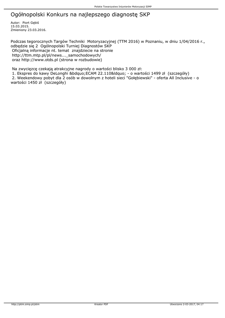 Polskie Towarzystwo Inżynierów Motoryzacji SIMP Ogółnopolski Konkurs na najlepszego diagnostę SKP Autor: Piort Gębiś 15.03.2015. Zmieniony 23.03.2016. Podczas tegorocznych Targów Techniki Motoryzacyjnej (TTM 2016) w Poznaniu, w dniu 1/04/2016 r., odbędzie się 2 Ogólnopolski Turniej Diagnostów SKP Oficjalną informacje nt. temat znajdziecie na stronie http://ttm.mtp.pl/pl/news..._samochodowych/ oraz http://www.otds.pl (strona w rozbudowie) Na zwycięzcę czekają atrakcyjne nagrody o wartości blisko 3 000 zł: 1. Ekspres do kawy DeLonghi „ECAM 22.110“ - o wartości 1499 zł (szczegóły) 2. Weekendowy pobyt dla 2 osób w dowolnym z hoteli sieci "Gołębiewski" - oferta All Inclusive - o wartości 1450 zł (szczegóły) http://ptim.simp.pl/ptim Kreator PDF Utworzono 2-03-2017, 04:17