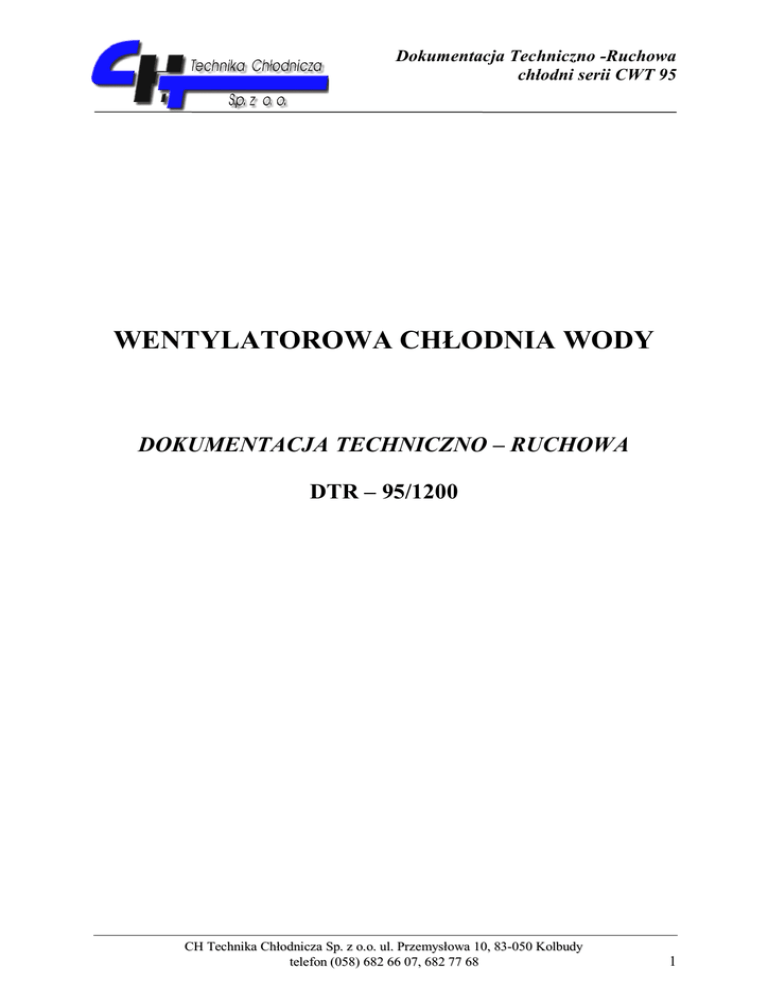 Dokumentacja Techniczno -Ruchowa chłodni serii CWT 95 WENTYLATOROWA CHŁODNIA WODY DOKUMENTACJA TECHNICZNO – RUCHOWA DTR – 95/1200 CH Technika Chłodnicza Sp. z o.o. ul. Przemysłowa 10, 83-050 Kolbudy telefon (058) 682 66 07, 682 77 68 1 Dokumentacja Techniczno -Ruchowa chłodni serii CWT 95 SPIS TREŚCI 1. WSTĘP 1.1 Przedmiot Dokumentacji Techniczno-Ruchowej ...............................................3 1.2 Budowa chłodni...................................................................................................3 1.3 Zasada działania .................................................................................................3 2. PRZYGOTOWANIE CHŁODNI DO PRACY. 2.1 Zakres dostawy ...................................................................................................4 2.2 Ustawienie chłodni .............................................................................................4 2.3 Włączenie chłodni do instalacji ..........................................................................4 3. URUCHAMIANIE 3.1 Rozruch próbny ..................................................................................................4 3.2 Prace regulacyjne ...............................................................................................5 3.3 Eksploatacja i obsługa ....................................................................................... 5 3.4 Zatrzymanie chłodni .......................................................................................... 6 4. WARUNKI PRAWIDŁOWEJ EKSPLOATACJI 4.1 Zakres prac .........................................................................................................7 4.2 Prace konserwacyjne ..........................................................................................7 4.3 Prace konserwacyjne i remontowe silnika elektrycznego .................................7 CH Technika Chłodnicza Sp. z o.o. ul. Przemysłowa 10, 83-050 Kolbudy telefon (058) 682 66 07, 682 77 68 2 Dokumentacja Techniczno -Ruchowa chłodni serii CWT 95 1. WSTĘP 1.1 Przedmiot Dokumentacji Techniczno-Ruchowej Przedmiotem niniejszej dokumentacji techniczno-ruchowej są wymagania stawiane wentylatorowym chłodniom wody typ CWT 95/1200 w zakresie montażu i projektowania instalacji, uruchomienia, eksploatacji, obsługi, konserwacji i remontów. W związku z ciągłym postępem technicznym producent zastrzega sobie prawo zmian konstrukcyjnych i dokumentacyjnych. 1.2 Budowa chłodni Chłodnia typu CWT 95/1200 zbudowana jest w postaci prostopadłościanu o podstawie kwadratowej i składa się z następujących zespołów: 1. zespołu zbiornika, 2. zespołu baterii, 3. zespołu wentylatorowego. 1.3 Zasada działania Wentylatorowe chłodnie wody typ CWT 95/1200 są prostymi wymiennikami ciepła, przy czym czynnikiem chłodzonym jest woda z obiegu cieplnego, czynnikiem chłodzącym - powietrze czerpane z przestrzeni zewnętrznej. Woda ciepła z obiegu doprowadzana jest króćcem z zasilania oznaczonym symbolem Dn150 i rozpylona w baterii układu zraszania, woda przepływa grawitacyjnie przez kanały bloków wkłady kontaktowego do zespołu zbiornika. Przez okna wlotowe przepływa powietrze. Czynnik chłodzący przepływa przez baterię kanałami wkładów kontaktowych, a następnie kanałami odkraplacza. Ruch powietrza jest wymuszony mechanicznie wentylatorem. Dostęp do regulatora pływakowego oraz filtra możliwy jest po zdjęciu odpowiedniego okna wlotu powietrza, mocowanego do zbiornika za pomocą wkrętów. W przestrzeni baterii, a zwłaszcza w kanałach bloków kontaktowych następuje wymiana ciepła wody do powietrza w przeciwprądzie. Schłodzona powietrzem woda spływa do zespołu zbiornika, skąd króćcem odbioru Dn200 jest odbierana do obiegu cieplnego. Odbiór wody następuje pompą wirową o wielkości dobranej do projektowanego obiektu. Chwilowy nadmiar wody podany do chłodni usuwany jest króćcem przelewu. Strata wody w obiegu /odparowanie oraz unoszenie jej ze strumieniem powietrza/ uzupełniana jest króćcem uzupełnienia, który musi być podłączony do elektrozaworu (sterowanie sygnałem z regulatora dwustawnego poziomu) lub do regulatora typu Quick Stop – zawór mechaniczny. Uzupełnienie wody realizowane jest z instalacji wodociągowej wody zimnej lub instalacji uzupełnienia wody. Chłodnia jest wyposażona w króciec spustu umieszczony w dolnej części ściany zbiornika. Króciec spustu zapewnia odprowadzenie wody z zespołu zbiornika chłodni na okres jej wyłączenia z ruchu. Chłodnia może być wyposażona w termostat regulujący pracę wentylatora oraz inne przyrządy kontrolno-pomiarowe, w zależności od potrzeb wynikających z wymagań instalacyjnych obiegu. Urządzenia te nie wchodzą w zakres dostawy. Chłodnie przystosowane do odbioru grawitacyjnego wody wyposażone są tylko: - w króciec odbioru Dn 200 umieszczony w dnie zbiornika - ramę montażową w wersji bez zbiornika. CH Technika Chłodnicza Sp. z o.o. ul. Przemysłowa 10, 83-050 Kolbudy telefon (058) 682 66 07, 682 77 68 3 Dokumentacja Techniczno -Ruchowa chłodni serii CWT 95 2. PRZYGOTOWANIE CHŁODNI DO PRACY. 2.1 Zakres dostawy W zakres dostawy wyrobu wchodzi : - chłodnia wody CWT 95/1200 - wkręt samogwint. A 5,5 x 32 - 60 szt - dokumentacja techniczno - ruchowa DTR -95/1200, Scalenie chłodni pozostaje po stronie producenta. Zamawiający jest zobowiązany zapewnić pracę dźwigu 6t. na czas rozładunku i scalenia chłodni. 2.2 Ustawienie chłodni Chłodnię należy ustawić na poprzednio przygotowanym fundamencie lub konstrukcji wsporczej. Usytuowanie terenowe chłodni należy przewidzieć w miejscach odpowiednio do tego celu przeznaczonych, tj.: - przewiewnych o ciągłym i swobodnym przepływie powietrza, - pozbawionych możliwości szkodliwego wpływu cieplnego i wilgotnego powietrza z chłodni na budynki, linie energetyczne, podstacje elektryczne, itp. 2.3 Włączenie chłodni do instalacji Włączenie 