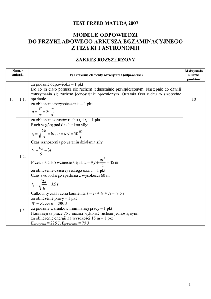 TEST PRZED MATURĄ 2007 MODELE ODPOWIEDZI DO PRZYKŁADOWEGO ARKUSZA EGZAMINACYJNEGO Z FIZYKI I ASTRONOMII ZAKRES ROZSZERZONY Numer zadania 1. 1.1. 1.2. Punktowane elementy rozwiązania (odpowiedzi) Maksymaln a liczba punktów za podanie odpowiedzi – 1 pkt Do 15 m ciało porusza się ruchem jednostajnie przyspieszonym. Następnie do chwili zatrzymania się ruchem jednostajnie opóźnionym. Ostatnia faza ruchu to swobodne spadanie. za obliczenie przyspieszenia – 1 pkt F m a = = 30 2 m s za obliczenie czasów ruchu t1 i t2 – 1 pkt Ruch w górę pod działaniem siły: 2h m t1 = = 1s , v = a ⋅ t = 30 s a Czas wznoszenia po ustaniu działania siły: v t2 = o = 3s 10 g at 2 = 45 m 2 za obliczenie czasu t3 i całego czasu – 1 pkt Czas swobodnego spadania z wysokości 60 m: 2h t3 = = 3,5 s Przez 3 s ciało wzniesie się na h = v ot + g 1.3. Całkowity czas ruchu kamienia: t = t1 + t2 + t3 = 7,5 s. za obliczenie pracy – 1 pkt W = Fs cos α = 300 J za podanie warunków minimalnej pracy – 1 pkt Najmniejszą pracę 75 J moŜna wykonać ruchem jednostajnym. za obliczenie energii na wysokości 15 m – 1 pkt Ekinetyczna = 225 J, Epotencjalna = 75 J 1 za narysowanie wykresu wykonanej pracy – 1 pkt za narysowanie i zeskalowanie układu współrzędnych – 1 pkt za narysowanie wykresu prędkości – 1 pkt 1.4 W, J 300 v, m/s 30 200 20 100 10 5 10 15 s, m 1 2 3 4 5 6 7 8 t, s -10 -20 -34,6 2.1. 2.2. 2.3. za podanie warunków – 1 pkt Aby nie było wybrzuszenia skóry, ciśnienie spowodowane obciąŜeniem musi być równe ciśnieniu atmosferycznemu. za obliczenie masy – 1 pkt mg F = p, = 100 000 Pa ⇒ m = 1 kg S 0,0001m 2 za udzielenie odpowiedzi – 1 pkt Gdy jest niskie ciśnienie, powietrze naciska na skórę mniejszą siłą. Naczynia krwionośne rozszerzają się. Krew płynie wolniej. za podanie odpowiedzi – 1 pkt Ciśnienie hydrostatyczne słupa wody nie moŜe być większe od ciśnienia atmosferycznego. za obliczenie wysokości – 1 pkt F = ghρ ⇒ h = 10 m za obliczenie wysokości – 1 pkt patm = g ⋅ ρ ⋅ h ⇒ h = 10 m 2. 2.4. 10 za wyjaśnienie – 1 pkt Gdy szklankę zanurzymy w wodzie i obrócimy ją otworem do dołu oraz podniesiemy do góry, to woda nie wylewa się z niej. Gdyby szklanka miała wysokość 10 m (przy ciśnieniu atmosferycznym powyŜej 1000 hPa) i miała zanurzony tylko wylot, to woda równieŜ nie wylewałaby się. Przy większej wysokości (przy tym samym ciśnieniu atmosferycznym) część wody wyleje się. W górnej części naczynia nie będzie wody. Inaczej moŜna powiedzieć, Ŝe ciśnienie atmosferyczne moŜe wtłoczyć wodę jedynie do wysokości 10 m (zaleŜy jeszcze od stanu barometru). Z takiej właśnie głębokości hydrofor moŜe zasysać wodę. W praktyce maksymalna głębokość studni nie przekracza 9 m. za obserwację – 1 pkt Ciśnienie spowodowane cięŜarem tłoka musi być równe hydrostatycznemu za obliczenie wysokości – 1 pkt F = g ⋅ ρ ⋅ h – 1 pkt S 2.5. h=4m 2 3.1. 3.2. 3.3. 3.4. 3.5. 3.6. 3. 3.7. Tłok pod naciskiem cięŜarówki moŜe przesuwać się w dół. Zatrzyma się, gdy objętość wody wypchniętej przez tłok będzie równa objętości wody w węŜu, do wysokości 4 m. x ⋅1m 2 = 4m ⋅ 0,0001m 2 x = 0,04 mm – 1 pkt za obliczenie energii – 1 pkt E = 1/2Q· .U = 0,5 J za obliczenie pojemności – 1 pkt C = Q/U = 1 µF za obliczenie odległości – 1 pkt S C = ε o ⇒ d = 8,8·10–8 m d za obliczenie natęŜenia pola – 1 pkt E = U/d E = 1,14·1010 V/m za obliczenie prędkości – 1 pkt m ⋅v 2 = e ⋅ U ⇒ v = 1,7·107 m/s 2 za obliczenie siły – 1 pkt 1 F = Q ⋅ E ⇒ F = 5,7·106 N 2 za obliczenie siły z dielektrykiem – 1 pkt Po włoŜeniu dielektryka natęŜenie pola elektrycznego zmaleje 5 razy. Siła równieŜ zmaleje 5 razy. F1 = 1,1·106 N za narysowanie wykresu – 1 pkt U, V 1500 bez dielektryka 10 1000 500 z dielektrykiem 0,5 1 1,5 Q, mC za obserwację – 1 pkt Kondensator do połowy wypełniony dielektrykiem moŜna potraktować jak dwa kondensatory: bez dielektryka (z lewej) C1 i z dielektrykiem (z prawej) C2. 3.8. 4. 4.1. 4.2. za obliczenie pojemności – 1 pkt C1 = ½ C = 0,5 µF C2 = εr·C1 = 2,5 µF C1 + C2 = 3 µF za zaznaczenie kierunku prądu i obliczenie napięcia – 1 pkt Ze źródła w prawą stronę. U = I · R = 10 A · 0,05 Ω = 0,5 V za obliczenie siły – 1 pkt F = BIl = 0,1 T·10 A · 0,2 m = 0,2 N r r r Wektorowy zapis siły elektrodynamiczej F = I ⋅ l × B za podanie kierunku siły – 1 pkt Kierunek siły jest prostopadły do przewodnika, a zwrot wynika z iloczynu 10 3 wektorowego (reguła prawej dłoni) – do góry. za obliczenie SEM – 1 pkt Ε ind = − Blv = −0,2V za obliczenie natęŜenia – 1 pkt 4.3. 4.4. 4.5. 5.1. 5.2. 5. 5.3. 5.4. 6. 6.1. I= Ε ind = 0,4A R za określenie kierunku prądu – 1 pkt Kierunek przepływu prądu indukcyjnego określa reguła Lenza. Prąd indukcyjny płynie w lewo. za obliczenie wypadkowego napięcia – 1 pkt Uw = U + Ε ind = 0,5 V – 0,2 V = 0,3 V. za kaŜdą obserwację – po 1 pkt 1) Podczas przepływu prądu przewodnik ogrzewa się pod wpływem ciepła. Q = I2Rt, Ε ind = 0,5 V 2) Prąd indukcyjny ma przeciwny kierunek do prądu ze źródła. Do prędkości 50 m/s wypadkowe natęŜenie prądu maleje. (Prąd ze źródła ma stałą wartość, a indukcyjny rośnie do 10 A – przy prędkości przewodnika 50 m/s i ma przeciwny zwrot.) 3) Przy większej prędkości prąd indukcyjny przewyŜsza prąd ze źródła i przewodnik znów się nagrzewa. za obserwację – 1 pkt Moc przepływającego przez Ŝarówkę prądu jest równa mocy promieniowania cieplnego. za skorzystanie z mocy prądu i promieniowania i za obliczenie temperatury – 1 pkt 4lρ 2 P = I 2R , P = E ⋅ S ⇒ ⋅ I = σT 4 dl T = 2500 K 2 πd za obliczenie długości fali i za określenie barwy fali – 1 pkt b λmax = = 1,15 µm T nadfiolet za określenie temperatur – 1 pkt T = 303K, T1 = 293K za obserwację – 1 pkt Jeśli kula zn