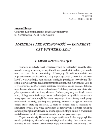 Zagadnienia Filozoficzne w Nauce XLVIII (2011), 33–45 Michał Heller Centrum Kopernika Badań Interdyscyplinarnych ul. Sławkowska 17, 31–016 Kraków MATERIA I PRZYCZYNOWOŚĆ — KONKRETY CZY UNIWERSALIA? 1. UWAGI WPROWADZAJĄCE Sukcesy młodych nauk empirycznych w naturalny sposób skierowały uwagę ówczesnych myślicieli na przedmiot badań tych nauk, tzn. na tzw. świat materialny. Historycy filozofii utwierdzili nas w przekonaniu, że filozofem, który zapoczątkował „zwrot ku człowiekowi”, wprowadzając tym samym napięcie pomiędzy nowożytną filozofią a nowożytnymi naukami przyrodniczymi, był Kartezjusz. Jest to o tyle prawdą, że Kartezjusz istotnie, formalnie rzecz biorąc, dokonał tego kroku, ale „zwrot ku człowiekowi” dokonywał się również, niejako spontanicznie, na innej drodze. Badacz przyrody — fizyk, astronom, biolog — w trakcie procesu badania jest oczywiście zainteresowany tym, co bada, czyli światem przyrody. Ale sukcesy nauk przyrodniczych musiały, prędzej czy później, zwrócić uwagę na metodę, dzięki której stały się możliwe. A metoda to narzędzie w ludzkim poznawaniu świata. Nic więc dziwnego, że nowożytna filozofia nauki od samego początku dryfowała w stronę epistemologii nauki z wyraźnym naciskiem na ludzkie uwarunkowania procesu poznawczego. Często uważa się Hume’a za tego myśliciela, który wytyczył kierunek późniejszej filozoficznej refleksji nad nauką. Jest rzeczą znamienną, że sam Hume, pisząc swoje wpływowe dzieło An Enquiry Con- 34 Michał Heller cerning Human Understanding1 , już w pierwszym zdaniu zaznaczył, że terenem jego dociekań jest moral philosophy, czyli the science of human nature. Jego zdaniem, istnieją dwa style uprawiania takiej filozofii. Dziś niekiedy nazywame je stylem soft i stylem hard. Pierwszy z nich Hume ocenia dość łagodnie, gdy twierdzi, że traktuje się w nim człowieka jako podmiot działania, stosuje się metody intuicyjne i posługuje się językiem „pożyczonym od poezji”. Uprawiając filozofię w drugim stylu, traktuje się człowieka jako istotę rozumną i stara się wniknąć w jego sposób rozumienia świata. Filozofowie tego kierunku poddają ludzką naturę drobiazgowym badaniom (with a narrow scrutiny), celem zidentyfikowania tych zasad, które kierują naszym rozumowaniem” (nr 2). Te wstępne wywody potwierdzają tylko deklarację autora, wyrażoną w tytule jego dzieła, iż pisze on w gruncie rzeczy traktat z teorii poznania. Filozofia Hume’a jest dobrze znana (przynajmniej specjalistom), ale spróbujemy na nią spojrzeć z nieco innego niż zwykle punktu widzenia. Będą mnie interesować te jego poglądy, które kształtowały późniejsze spojrzenie na filozofię fizyki, w szczególności na zagadnienie związku przyczynowego. Skonfrontuję je następnie z tą filozofią, którą zdaje się implikować współczesna fizyka. Ograniczę się w zasadzie do analiz Hume’a z jego Enquiry, gdyż nie tylko on sam uznał, że dzieło to zdystansowało jego wcześniejsze przemyślenia2 , ale właśnie do tego dzieła najczęściej odwoływali się późniejsi myśliciele. Jedynie w podrozdziale 6 sięgnę do Hume’a A Treatise of Human Nature, by uzupełnić jego poglądy dotyczące przyczynowości. 1 D. Hume, Enquiry Concerning the Human Understanding, and Concerning the Principle of Morals, red.: L.A. Selby-Bigge, 1777. Niedawno otrzymaliśmy nowy polski przekład tego dzieła: Badania dotyczące rozumu ludzkiego, przekład: D. Misztal, T. Sieczkowski, Wyd. Zielona Sowa, Kraków 2006. Jednak w dalszym ciągu cytuje Hume’a we własnym przekładzie. 2 Por. Lee Archie, Hume’s Considered View on Causality, philsciarchive.pitt.edu/archive/00002247. Materia i przyczynowość... 35 2. WIEDZA ODPOWIEDZIALNA To, że Hume był empirystą, wie każdy filozof, empiryzm ma jednak bardzo wiele odcieni i bardzo często to właśnie one decydują o randze danego autora. Hume był empirystą radykalnym, ale wiele jego poglądów nie ma wiele wspólnego z tym, co dziś niekiedy nazywa się hume’owskim empiryzmem. Zdaniem Hume’a, ludzkie poznanie opiera się na doznaniach (perceptions)3 , ale rozumianych szeroko. Obejmują one wszystko, co jakoś rejestrujemy w świadomości. Mogą to być aktualne doznania zmysłowe, wspomnienia, a nawet uświadomione sobie myśli. Hume dzieli doznania, ze względu „na różny stopień ich nasilenia i narzucania się (vivacity)”, na impresje i idee. Impresje to te doznania, które narzucają się najbardziej, np. „gdy słyszymy, widzimy, czujemy, lub kochamy, nienawidzimy, pożądamy, chcemy”. Wszystkie pozostałe doznania Hume zalicza do idei. Nie jest to podział zbyt ostry, ale przynajmniej w krańcowych przypadkach wiadomo o co chodzi. Wydaje się, że taki stopień ostrości wystarczał (lub musiał wystarczać) Hume’owi w jego analizach. Nasze ciało podlega prawom bezwładu i innym prawom materii, ale nasza myśl wydaje się być niczym nieskrępowana. Może wybiegać w dowolne regiony wszechświata, lub nawet poza wszechświat, w obszary — jak pisze Hume — „nieograniczonego chaosu, gdzie — jak się zakłada — natura znajduje się w całkowitym bezładzie” (nr 13)4 . Ale to tylko pozór; w istocie nasz umysł nie może nic więcej, jak tylko łączyć, przetasowywać, powiększać lub pomniejszać to, co znamy dzięki doświadczeniu. Innymi słowy, wszystkie nasze idee są tylko mniej lub bardziej udolnymi kopiami naszych impresji. Stąd wniosek: winniśmy nieufnie odnosić się do tych poglądów filozoficznych, które wywodzą się z idei. Wiedza odpowiedzialna to taka wiedza, która daje się zredukować do impresji. 3 Polskie odpowiedniki technicznych terminów Hume’a pochodzą ode mnie. Niekiedy różnią się one od ogólnie przyjętych przekładów. 4 Ciekawy przyczynek do kosmologicznych poglądów Hume’a. Były one zresztą świadectwem epoki: wszechświat jest obszarem