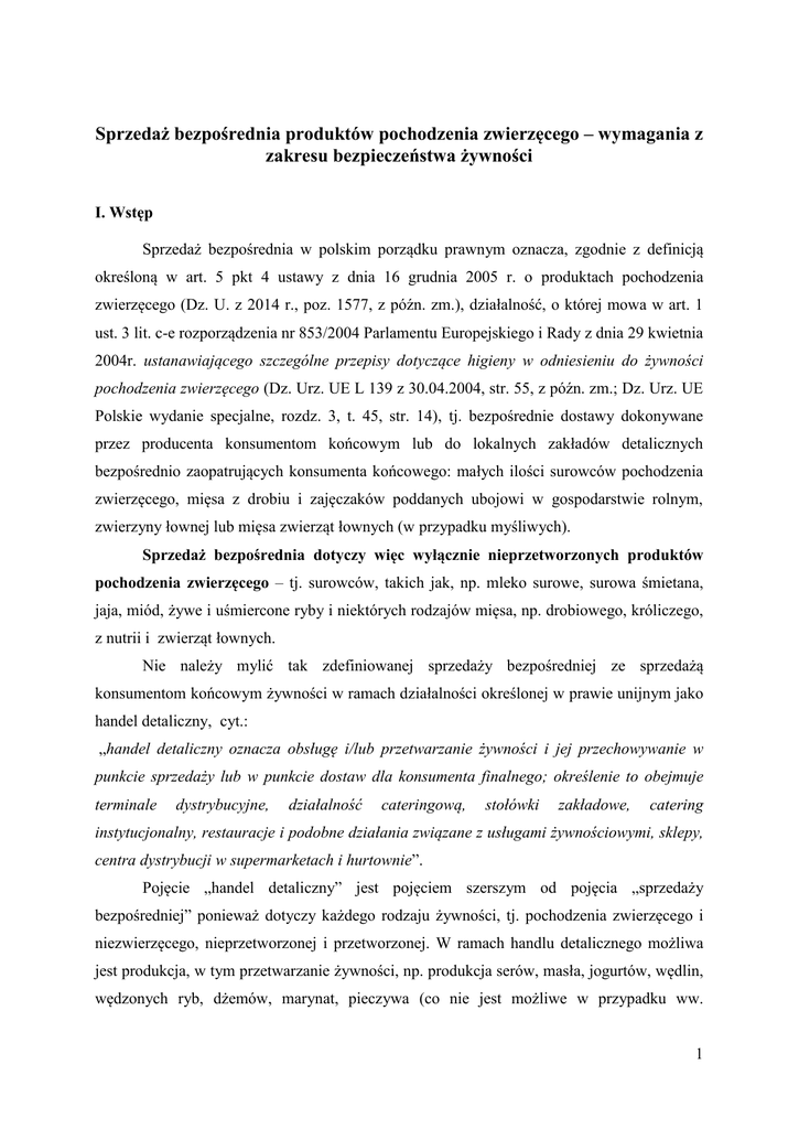 Sprzedaż bezpośrednia produktów pochodzenia zwierzęcego – wymagania z zakresu bezpieczeństwa żywności I. Wstęp Sprzedaż bezpośrednia w polskim porządku prawnym oznacza, zgodnie z definicją określoną w art. 5 pkt 4 ustawy z dnia 16 grudnia 2005 r. o produktach pochodzenia zwierzęcego (Dz. U. z 2014 r., poz. 1577, z późn. zm.), działalność, o której mowa w art. 1 ust. 3 lit. c-e rozporządzenia nr 853/2004 Parlamentu Europejskiego i Rady z dnia 29 kwietnia 2004r. ustanawiającego szczególne przepisy dotyczące higieny w odniesieniu do żywności pochodzenia zwierzęcego (Dz. Urz. UE L 139 z 30.04.2004, str. 55, z późn. zm.; Dz. Urz. UE Polskie wydanie specjalne, rozdz. 3, t. 45, str. 14), tj. bezpośrednie dostawy dokonywane przez producenta konsumentom końcowym lub do lokalnych zakładów detalicznych bezpośrednio zaopatrujących konsumenta końcowego: małych ilości surowców pochodzenia zwierzęcego, mięsa z drobiu i zajęczaków poddanych ubojowi w gospodarstwie rolnym, zwierzyny łownej lub mięsa zwierząt łownych (w przypadku myśliwych). Sprzedaż bezpośrednia dotyczy więc wyłącznie nieprzetworzonych produktów pochodzenia zwierzęcego – tj. surowców, takich jak, np. mleko surowe, surowa śmietana, jaja, miód, żywe i uśmiercone ryby i niektórych rodzajów mięsa, np. drobiowego, króliczego, z nutrii i zwierząt łownych. Nie należy mylić tak zdefiniowanej sprzedaży bezpośredniej ze sprzedażą konsumentom końcowym żywności w ramach działalności określonej w prawie unijnym jako handel detaliczny, cyt.: „handel detaliczny oznacza obsługę i/lub przetwarzanie żywności i jej przechowywanie w punkcie sprzedaży lub w punkcie dostaw dla konsumenta finalnego; określenie to obejmuje terminale dystrybucyjne, działalność cateringową, stołówki zakładowe, catering instytucjonalny, restauracje i podobne działania związane z usługami żywnościowymi, sklepy, centra dystrybucji w supermarketach i hurtownie”. Pojęcie „handel detaliczny” jest pojęciem szerszym od pojęcia „sprzedaży bezpośredniej” ponieważ dotyczy każdego rodzaju żywności, tj. pochodzenia zwierzęcego i niezwierzęcego, nieprzetworzonej i przetworzonej. W ramach handlu detalicznego możliwa jest produkcja, w tym przetwarzanie żywności, np. produkcja serów, masła, jogurtów, wędlin, wędzonych ryb, dżemów, marynat, pieczywa (co nie jest możliwe w przypadku ww. 1 sprzedaży bezpośredniej) i jej sprzedaż wyłącznie konsumentom końcowym, np. w gospodarstwie lub na targu. W Polsce nadzór nad zakładami prowadzącymi handel detaliczny sprawuje Państwowa Inspekcja Sanitarna, podległa Ministrowi Zdrowia. Przetwarzanie produktów pochodzenia zwierzęcego, a także rozbiór mięsa i następnie sprzedaż wyprodukowanych produktów na rynku lokalnym, zarówno konsumentom końcowym, jak i do zakładów prowadzących handel detaliczny z przeznaczeniem dla konsumenta końcowego, jest natomiast możliwe w ramach działalności marginalnej, lokalnej i ograniczonej, dla której warunki prowadzenia określa rozporządzenie Ministra Rolnictwa i Rozwoju Wsi z dnia 21 marca 2016 r. w sprawie szczegółowych warunków uznania działalności marginalnej, lokalnej i ograniczonej (Dz. U. poz. 451). W Polsce nadzór nad zakładami prowadzącymi działalność marginalną, lokalną i ograniczoną, sprawuje Inspekcja Weterynaryjna, podległa Ministrowi Rolnictwa i Rozwoju Wsi. Do sprzedaży bezpośredniej w zakresie wymagań weterynaryjnych, w tym wymagań zdrowotnych, higienicznych i sanitarnych, mają zastosowanie przede wszystkim przepisy ww. ustawy o produktach pochodzenia zwierzęcego oraz rozporządzenia Ministra Rolnictwa i Rozwoju Wsi z dnia 30 września 2015 r. w sprawie wymagań weterynaryjnych przy produkcji produktów pochodzenia zwierzęcego przeznaczonych do sprzedaży bezpośredniej (Dz. U. poz. 1703). Do tego rodzaju działalności mają również zastosowanie, w całości lub w pewnym zakresie, również inne przepisy z zakresu bezpieczeństwa żywności, zarówno Unii Europejskiej, jak i przepisy krajowe. Wykaz najważniejszych przepisów z zakresu bezpieczeństwa żywności mających w całości, lub w pewnym zakresie, zastosowanie do sprzedaży bezpośredniej wymieniono w załączniku. W niniejszym opracowaniu skupiono się przede wszystkim na wymaganiach weterynaryjnych określonych dla sprzedaży bezpośredniej w ww. rozporządzeniu w sprawie wymagań weterynaryjnych przy produkcji produktów pochodzenia zwierzęcego przeznaczonych do sprzedaży bezpośredniej oraz procedurze rejestracji takiej działalności u właściwego powiatowego lekarza weterynarii. II. Wymagania określone dla sprzedaży bezpośredniej w rozporządzeniu w sprawie wymagań weterynaryjnych przy produkcji produktów pochodzenia zwierzęcego przeznaczonych do sprzedaży bezpośredniej i w innych przepisach Rozporządzenie w sprawie wymagań weterynaryjnych przy produkcji produktów pochodzenia zwierzęcego przeznaczonych do sprzedaży bezpośredniej określa wymagania weterynaryjne jakie powinny być spełnione przy produkcji produktów pochodzenia 2 zwierzęcego przeznaczonych do sprzedaży bezpośredniej i przez takie produkty oraz wielkość, zakres i obszar produkcji produktów pochodzenia zwierzęcego przeznaczonych do sprzedaży bezpośredniej, a także wymagania weterynaryjne dla miejsc prowadzenia sprzedaży bezpośredniej. Przepisy krajowe określone w ww. rozporządzeniu są zgodne z zasadą minimalnych wymagań dla małych przedsiębiorstw, tym samym umożliwiają funkcjonowanie rynku sprzedaży produktów pochodzenia zwierzęcego bezpośrednio konsumentowi końcowemu lub do zakładów prowadzących handel detaliczny bezpośrednio zaopatrujących konsumenta końcowego w warunkach gwarantujących właściwą jakość zdrowotną i bezpieczeństwo wprowadzanych na rynek produktów. 1) Produkty pochodzenia zwierzęcego przeznaczone do sprzedaży bezpośredniej 