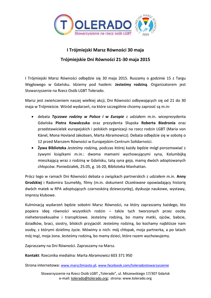 I Trójmiejski Marsz Równości 30 maja Trójmiejskie Dni Równości 21-30 maja 2015 I Trójmiejski Marsz Równości odbędzie się 30 maja 2015. Ruszamy o godzinie 15 z Targu Węglowego w Gdańsku. Idziemy pod hasłem: Jesteśmy rodziną. Organizatorem jest Stowarzyszenie na Rzecz Osób LGBT Tolerado. Marsz jest zwieńczeniem naszej wielkiej akcji, Dni Równości odbywających się od 21 do 30 maja w Trójmieście. Wśród wydarzeń, na które szczególnie chcemy zaprosić są m.in: debata Tęczowe rodziny w Polsce i w Europie z udziałem m.in. wiceprezydenta Gdańska Piotra Kowalczuka oraz prezydenta Słupska Roberta Biedronia oraz przedstawicielek europejskich i polskich organizacji na rzecz rodzin LGBT (Maria von Känel, Mona Hovland Jakobsen, Marta Abramowicz). Debata odbędzie się w sobotę o 12 przed Marszem Równości w Europejskim Centrum Solidarności. Żywa Biblioteka Jesteśmy rodziną, podczas której każdy będzie mógł porozmawiać z żywymi książkami m.in.: dwoma mamami wychowującymi syna, Kolumbijką mieszkającą wraz z rodziną w Gdańsku, tatą syna geja, mamą dwóch adoptowanych chłopców. Poniedziałek, 25.05, g. 16-20, Biblioteka Manhattan. Prócz tego w ramach Dni Równości debata o związkach partnerskich z udziałem m.in. Anny Grodzkiej i Radomira Szumełdy, filmy (m.in. dokument Oczekiwane opowiadający historię dwóch matek w RPA adoptujących czarnoskórą dziewczynkę), dyskusje naukowe, wystawy, imprezy klubowe. Kulminacją wydarzeń będzie sobotni Marsz Równości, na który zapraszamy każdego, kto popiera ideę równości wszystkich rodzin – także tych tworzonych przez osoby nieheteroseksualne i transpłciowe. Jesteśmy rodziną, bo mamy matki, ojców, babcie, dziadków, braci, siostry, bliskich przyjaciół. Jesteśmy rodziną, bo kochamy najbliższe nam osoby, z którymi dzielimy życie. Mówimy o nich: mój chłopak, moja partnerka, a po latach mój mąż, moja żona. Jesteśmy rodziną, bo mamy dzieci, które razem wychowujemy. Zapraszamy na Dni Równości. Zapraszamy na Marsz. Kontakt: Rzecznika medialna: Marta Abramowicz 603 371 950 Strona internetowa: www.marsz3miasto.pl, www.facebook.com/toleradostowarzyszenie Stowarzyszenie na Rzecz Osób LGBT „Tolerado”, ul. Miszewskiego 17/307 Gdańsk e-mail: [email protected]; strona: www.tolerado.org Program Trójmiejskich Dni Równości 2015 21.05| czwartek 18:00 | Zatoka Sztuki | Sopot | al. F. Mamuszki 14 Debata Związki partnerskie – TAK, odważmy się! oraz wernisaż wystawy Równi w Europie - Tak, chcemy! autorstwa Anny Smarzyńskiej. Goście: Anna Grodzka (Zieloni), Radomir Szumełda (PO), Aleksander Lewandowski (SLD). 25.05| poniedziałek 16:00-20:00 | Biblioteka Manhattan | Gdańsk | al. Grunwaldzka 82 Żywa Biblioteka Jesteśmy rodziną we współpracy z Naukowym Kołem Seksuologii UG Equality 26.05 | wtorek 19:00 | Klub Atelier | Sopot | al. F. Mamuszki 2 Wernisaż wystawy Projekt Podróż autorstwa Liliany Piskorskiej i Martyny Tokarskiej 27.05 | środa 18:00 | Świetlica Krytyki Politycznej w Trójmieście | Gdańsk | ul. Nowe Ogrody 35, II p. Pokaz filmu Oczekiwane (Waited for) z dyskusją po projekcji. Reż. Nerina Penzhorn, 2011, 60 min. 28.05 | czwartek 18:00 | Europejskie Centrum Solidarności | Gdańsk | pl. Solidarności 1 Pokaz filmu Parada z dyskusją po projekcji. Reż. Srdjan Dragojević, 2011, 125 min. 29.05 | piątek 18:00 | Świetlica Krytyki Politycznej w Trójmieście | Gdańsk | ul. Nowe Ogrody 35, II p. O tych, które opuściłyśmy. Czy sojusz miejskich queerów i wiejskich lesbijek jest możliwy? Dyskusja wokół raportu Fundacji Przestrzeń Kobiet Spoza centrum widać więcej. Goście: dr Katarzyna Bojarska (UG), Natalia Sarata (Przestrzeń Kobiet), dr Anna Strzałkowska (UG), Bea Tilanus (PvdA, Holandia). Prowadzenie: Ewa Furgał 21:00 | Red Light Pub | Gdańsk | ul. Piwna 28/31 Before Party z udziałem Drag Queen Charlotty i Selliny De Mellon. Grają: DJ Asq, DJ Frisky, Dead Easy Stowarzyszenie na Rzecz Osób LGBT „Tolerado”, ul. Miszewskiego 17/307 Gdańsk e-mail: [email protected]; strona: www.tolerado.org 30.05 | sobota 12:00 | Europejskie Centrum Solidarności | Gdańsk | pl. Solidarności 1 Międzynarodowa debata Tęczowe rodziny w Polsce i Europie Goście: Piotr Kowalczuk (wiceprezydent Gdańska), Robert Biedroń (prezydent Słupska), Maria von Känel (Europejska Sieć Rodzin LGBT NELFA), Mona Hovland Jakobsen (organizacja Tęczowe Rodziny LLH Norwegia). Prowadzenie: Marta Abramowicz Na debatę obowiązuje rejestracja poprzez stronę: http://teczowerodzinyecs.evenea.pl 15:00 | Gdańsk | Targ Węglowy I Trójmiejski Marsz Równości 23:00 | Klub B90 | Gdańsk | ul. Doki 1 After Pride – Women in Art. Grają: An On Bast, El'Mirka, Julia, Ane 23:00 | Sixty9 Club | Sopot | ul. Kościuszki 68a After Party. Gość specjalny: Drag Queen Kim Lee Na wszystkie wydarzenia wstęp wolny! Więcej informacji: www.marsz3miasto.pl Stowarzyszenie na Rzecz Osób LGBT „Tolerado”, ul. Miszewskiego 17/307 Gdańsk e-mail: [email protected]; strona: www.tolerado.org Opisy poszczególnych wydarzeń 21.05| czwartek | 18:00 | Zatoka Sztuki Wydarzenia w Zatoce Sztuki z udziałem Anny Grodzkiej otwierają Trójmiejskie Dni Równości! Debata "Związki partnerskie – TAK, odważmy się!" oraz wernisaż wystawy "Równi w Europie – Tak, chcemy!" autorstwa Anny Smarzyńskiej już 21 maja o godz. 18:00 w Zatoce Sztuki w Sopocie. Wernisaż wystawy "Równi w Europie - Tak, chcemy!", która gościła w Sejmie RP, poprzedzi debata na temat związków partnerskich z udziałem Anny Grodzkiej (Posłanka na Sejm RP, Partia Zieloni), Aleksandra Lewandowskiego (SLD, Rainbow Rose) oraz Radomira Szumełdy (PO). Goście przedstawią plany i możliwości prawnych regulacji na rzecz związków partnerskich, ochrony tęczowych rodzin oraz zabezpieczeń dla nich. Wystawa "Równi w Europie - Tak, chcemy!" składa się z czarno-białych oraz kolorowych fotografii. Fotografie czarno-biał