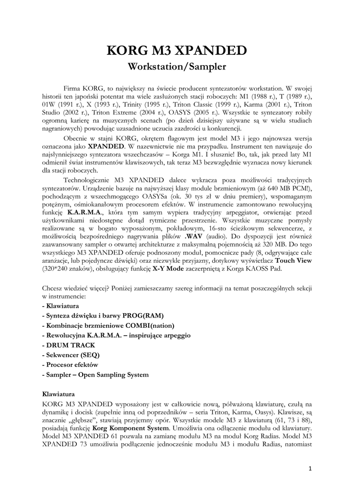 KORG M3 XPANDED Workstation/Sampler Firma KORG, to największy na świecie producent syntezatorów workstation. W swojej historii ten japoński potentat ma wiele zasłużonych stacji roboczych: M1 (1988 r.), T (1989 r.), 01W (1991 r.), X (1993 r.), Trinity (1995 r.), Triton Classic (1999 r.), Karma (2001 r.), Triton Studio (2002 r.), Triton Extreme (2004 r.), OASYS (2005 r.). Wszystkie te syntezatory robiły ogromną karierę na muzycznych scenach (po dzień dzisiejszy używane są w wielu studiach nagraniowych) powodując uzasadnione uczucia zazdrości u konkurencji. Obecnie w stajni KORG, okrętem flagowym jest model M3 i jego najnowsza wersja oznaczona jako XPANDED. W nazewnictwie nie ma przypadku. Instrument ten nawiązuje do najsłynniejszego syntezatora wszechczasów – Korga M1. I słusznie! Bo, tak, jak przed laty M1 odmienił świat instrumentów klawiszowych, tak teraz M3 bezwzględnie wyznacza nowy kierunek dla stacji roboczych. Technologicznie M3 XPANDED dalece wykracza poza możliwości tradycyjnych syntezatorów. Urządzenie bazuje na najwyższej klasy module brzmieniowym (aż 640 MB PCM!), pochodzącym z wszechmogącego OASYSa (ok. 30 tys zł w dniu premiery), wspomaganym potężnym, ośmiokanałowym procesorem efektów. W instrumencie zamontowano rewolucyjną funkcję K.A.R.M.A., która tym samym wypiera tradycyjny arpeggiator, otwierając przed użytkownikami niedostępne dotąd rytmiczne przestrzenie. Wszystkie muzyczne pomysły realizowane są w bogato wyposażonym, pokładowym, 16-sto ścieżkowym sekwencerze, z możliwością bezpośredniego nagrywania plików .WAV (audio). Do dyspozycji jest również zaawansowany sampler o otwartej architekturze z maksymalną pojemnością aż 320 MB. Do tego wszystkiego M3 XPANDED oferuje podnoszony moduł, pomocnicze pady (8, odgrywające całe aranżacje, lub pojedyncze dźwięki) oraz niezwykle przyjazny, dotykowy wyświetlacz Touch View (320*240 znaków), obsługujący funkcję X-Y Mode zaczerpniętą z Korga KAOSS Pad. Chcesz wiedzieć więcej? Poniżej zamieszczamy szereg informacji na temat poszczególnych sekcji w instrumencie: - Klawiatura - Synteza dźwięku i barwy PROG(RAM) - Kombinacje brzmieniowe COMBI(nation) - Rewolucyjna K.A.R.M.A. – inspirujące arpeggio - DRUM TRACK - Sekwencer (SEQ) - Procesor efektów - Sampler – Open Sampling System Klawiatura KORG M3 XPANDED wyposażony jest w całkowicie nową, półważoną klawiaturę, czułą na dynamikę i docisk (zupełnie inną od poprzedników – seria Triton, Karma, Oasys). Klawisze, są znacznie „głębsze”, stawiają przyjemny opór. Wszystkie modele M3 z klawiaturą (61, 73 i 88), posiadają funkcję Korg Komponent System. Umożliwia ona odłączenie modułu od klawiatury. Model M3 XPANDED 61 pozwala na zamianę modułu M3 na moduł Korg Radias. Model M3 XPANDED 73 umożliwia podłączenie jednocześnie modułu M3 i modułu Radias, natomiast 1 model M3 XPANDED 88 pozwala na montaż dwóch modułów M3, lub modułu M3 i modułu Radias. Synteza dźwięku i barwy – PROG(RAM) Korg M3 XPANDED bazuje na nowej syntezie EDS (Enhanced Definition Synthesis), po raz pierwszy zastosowanej w najpotężniejszym syntezatorze ostatnich lat – w Korg OASYS (2005 r.). 2 Instrument zawiera aż 640 MB próbek, w skład których wchodzą: - 1032 multisample ROM - 1606 sampli perkusyjnych ROM - 59 multisampli Brass and Woodwinds 1, EX-USB-PCM01 (128 MB) - 47 multisampli Brass and Woodwinds 2, EX-USB-PCM02 (128 MB) - 10 multisampli Stereo Grand Piano, EX-USB-PCM03 (128 MB) - 4-warstwowa próbka V1 Stereo Piano, EX-USB-PCM4 (28 MB) M3 XPANDED brzmi niewiarygodnie. Na pokładzie mamy pokaźną kolekcję barw żywcem wziętych z flagowego modelu Korga – OASYS. Znajdziemy również propozycje z bardzo popularnego i zasłużonego Tritona Extreme oraz z Tritona Studio. Instrument oferuje szereg nowych, znakomitych programów. Producent sukcesywnie udostępnia coraz to nowsze programy. M3 XPANDED zaopatrzony jest w 14 stałych folderów brzmień (PROG, I-A…I-G, oraz UA…U-G) o łącznej ilości 1664 barw (+ 256 programów GM2 i 9 zestawów perkusyjnych GM2). Instrument oferuje maksymalną ilość 144 zestawów perkusyjnych, w pełni edytowalnych. Jest to absolutny nr 1 pod względem ilości miejsca w instrumencie. M3 jest najlepszym syntezatorem workstation na świecie, tak więc oferuje całą gamę brzmień w najwyższej jakości. W instrumencie zapisanych jest 18 banków brzmień: 1. 00-Keyboard 2. 01-Organ 3. 02-Bell/Mallet 4. 03-Strings 5. 04-Vocal/Airy 6. 05-Brass 7. 06-Woodwind/Reed 8. 07-Guitar/Plucked 9. 08-Bass/SynthBass 10. 09-SlowSynth 3 11. 10-FastSynth 12. 11-LeadSynth 13. 12-MotionSynth 14. 13-SFX 15. 14-Short Decay/Hit 16. 15-Drums 17. 16-User 18. 17-User M3 XPANDED zaopatrzony jest w bardzo przydatną funkcję Jump to Sub. Umożliwia ona podzielenie banku na podgrupy, co zdecydowanie ułatwia wyszukiwanie konkretnych barw (np. bank 00-Keyboard podzielony jest na: 00-A.Piano, 01-Synth E.Piano, 02-Real E.Piano, 03Clav/Harpsi; a bank 09-SlowSynth podzielony jest na: 00-Bright, 01-Dark, 02-Sweep). Wszystkie brzmienia w M3 XPANDED są w pełni edytowalne (nie licząc GM). W instrumencie mamy ogromny zestaw narzędzi potrzebnych do tworzenia nowych ustawień, a najważniejsze z nich, to: Program Basic, OSC Basic, Pitch EG, Filter Routing, LFO, Amp/EQ, AMS/Common Key Track oraz obie sekcje procesora efektów IFX i TFX. 4 Kombinacje brzmieniowe COMBI(nation) Słynna struktura brzmień Combination stworzona została w 1988 r., na potrzeby syntezatora Korg M1. W 2005 r., całkowicie zreformowany tryb COMBI ukazał się Korgu OASYS. Z kolei w M3 XPANDED zamontowana jest jego najnowsza i najmocniejsza wersja. Czym jest tryb COMBI? Jest to wspaniała funkcja umożliwiająca łączenie w dowolny sposób maksymalnie 16. brzmień na raz, w czasie rzeczywistym, w jednej kombinacji, w całkowicie dowolnej konfiguracji na klawiaturze. 5 Wszystkie kombinacje mogą być zapisywa