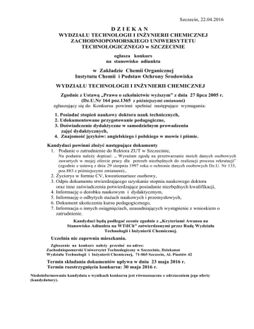 Szczecin, 22.04.2016 DZIEKAN WYDZIAŁU TECHNOLOGII I INŻYNIERII CHEMICZNEJ ZACHODNIOPOMORSKIEGO UNIWERSYTETU TECHNOLOGICZNEGO w SZCZECINIE ogłasza konkurs na stanowisko adiunkta w Zakładzie Chemii Organicznej Instytutu Chemii i Podstaw Ochrony Środowiska WYDZIAŁU TECHNOLOGII I INŻYNIERII CHEMICZNEJ Zgodnie z Ustawą „Prawo o szkolnictwie wyższym” z dnia 27 lipca 2005 r. (Dz.U.Nr 164 poz.1365 z późniejszymi zmianami) zgłaszający się do Konkursu powinni spełniać następujące wymagania: 1. Posiadać stopień naukowy doktora nauk technicznych, 2. Udokumentowane przygotowanie pedagogiczne, 3. Doświadczenie dydaktyczne w samodzielnym prowadzeniu zajęć dydaktycznych, 4. Znajomość języków: angielskiego i polskiego w mowie i piśmie. Kandydaci powinni złożyć następujące dokumenty 1. Podanie o zatrudnienie do Rektora ZUT w Szczecinie, Na podaniu należy dopisać: „ Wyrażam zgodę na przetwarzanie moich danych osobowych zawartych w mojej ofercie pracy dla potrzeb niezbędnych do realizacji procesu rekrutacji” (zgodnie z ustawą z dnia 29 sierpnia 1997 roku o ochronie danych osobowych Dz.U. Nr 133, poz.883 z późniejszymi zmianami)., 2. Życiorys w formie CV, kwestionariusz osobowy, 3. Odpis dokumentu stwierdzającego uzyskanie stopnia naukowego doktora oraz inne zaświadczenia potwierdzające posiadanie niezbędnych kwalifikacji, 4. Informację o dorobku naukowym i dydaktycznym, 5. Informację o odbytych stażach naukowych i przemysłowych, 6. Dokument ukończenia kursu pedagogicznego, 7. Informacja o innych osiągnięciach, uzasadniających wystąpienie z wnioskiem o zatrudnienie. Kandydaci będą podlegać ocenie zgodnie z „Kryteriami Awansu na Stanowisko Adiunkta na WTiICh” zatwierdzonymi przez Radę Wydziału Technologii i Inżynierii Chemicznej. Uczelnia nie zapewnia mieszkania. Zgłoszenie na konkurs należy przesłać na adres: Zachodniopomorski Uniwersytet Technologiczny w Szczecinie, Dziekanat Wydziału Technologii i Inżynierii Chemicznej, 71-065 Szczecin, Al. Piastów 42 Termin składania dokumentów upływa w dniu 23 maja 2016 r. Termin rozstrzygnięcia konkursu: 30 maja 2016 r. Niedoinformowanie kandydata o wynikach konkursu jest równoznaczne z odrzuceniem jego oferty (kandydatury). INSTYTUCJA: ZACHODNIOPOMORSKI UNIWERSYTET TECHNOLOGICZNY w SZCZECINIE, Wydział Technologii i Inżynierii Chemicznej MIASTO: Szczecin STANOWISKO: adiunkt ZUT w Szczecinie DYSCYPLINA NAUKOWA: technologia chemiczna DATA OGŁOSZENIA: 22.04.2016 r. TERMIN SKŁADANIA OFERT: 23.05.2016 r. LINK DO STRONY: www.zut.edu.pl SŁOWA KLUCZOWE: synteza organiczna, synteza metaloorganiczna, analiza strukturalna związków organicznych, spektometria NMR OPIS (tematyka, oczekiwania, uwagi): Kandydat musi posiadać stopień naukowy doktora w dyscyplinie technologia chemiczna oraz wykazać doświadczenie i aktywność w pracy eksperymentalnej w zakresie syntezy organicznej i metaloorganicznej, w szczególności syntezy z użyciem związków lito- i magnezoorganicznych. Ponadto kandydat powinien wykazać się znajomością syntezy i funkcjonalizacji układów azaheterocyklicznych w oparciu o nowoczesne metody syntezy, bazujące na związkach metaloorganicznych. Kandydat musi posiadać także doświadczenie w zakresie obsługi specjalistycznej aparatury badawczej takiej jak: spektrometry (NMR, IR, UV-VIS) i chromatografy (gazowe z detektorami MS i FID oraz cieczowe z detektorami UV-VIS). Kompetencje te powinien potwierdzać dorobek naukowy kandydata. Kandydat powinien ponadto wykazać się doświadczeniem w prowadzeniu zajęć dydaktycznych w języku polskim, zgodnych z profilem kształcenia realizowanym w Zakładzie Chemii Organicznej. Oprócz tego kandydat musi wykazać się znajomością języków: angielskiego w mowie i piśmie. Mile widziana jest również znajomość języka niemieckiego. Wykaz wymaganych dokumentów na stanowisko adiunkta ZUT w Szczecinie 1. Podanie o zatrudnienie do Rektora ZUT w Szczecinie, 2. Życiorys w formie CV, kwestionariusz osobowy, 3. Odpis dokumentu stwierdzającego uzyskanie stopnia naukowego doktora oraz inne zaświadczenia potwierdzające posiadanie niezbędnych kwalifikacji, 4. Informację o dorobku naukowym i dydaktycznym, 5. Informację o odbytych stażach naukowych i przemysłowych, 6. Dokument ukończenia kursu pedagogicznego, 7. Informacja o innych osiągnięciach, uzasadniających wystąpienie z wnioskiem o zatrudnienie. Zgłoszenie na konkurs należy przesłać na adres: Zachodniopomorski Uniwersytet Technologiczny w Szczecinie, Dziekanat Wydziału Technologii i Inżynierii Chemicznej, 71-065 Szczecin, Al. Piastów 42 Tel. 91-43-430-86, e-mail: [email protected]