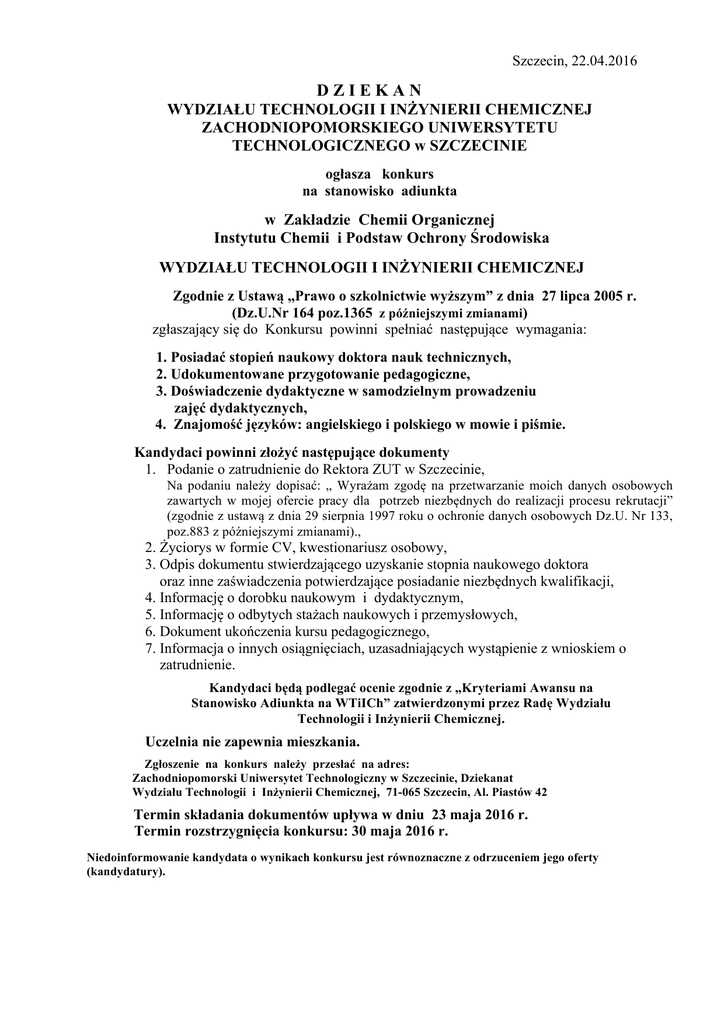 22.04.2016 Konkurs na stanowisko adiunkta w Zakładzie Chemii