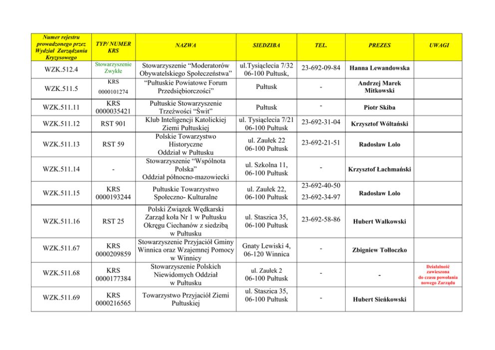 Numer rejestru prowadzonego przez Wydział Zarządzania Kryzysowego TYP/ NUMER KRS NAZWA SIEDZIBA TEL. PREZES WZK.512.4 Stowarzyszenie Zwykłe Stowarzyszenie “Moderatorów Obywatelskiego Społeczeństwa” “Pułtuskie Powiatowe Forum Przedsiębiorczości” ul.Tysiąclecia 7/32 06-100 Pułtusk, 23-692-09-84 Hanna Lewandowska Pułtusk - Andrzej Marek Mitkowski Pułtusk - Piotr Skiba ul. Tysiąclecia 7/21 06-100 Pułtusk 23-692-31-04 Krzysztof Wóltański ul. Zaułek 22 06-100 Pułtusk 23-692-21-51 Radosław Lolo ul. Szkolna 11, 06-100 Pułtusk - Krzysztof Łachmański ul. Zaułek 22, 06-100 Pułtusk 23-692-40-50 ul. Staszica 35, 06-100 Pułtusk 23-692-58-86 Hubert Walkowski Gnaty Lewiski 4, 06-120 Winnica - Zbigniew Tołłoczko ul. Zaułek 2 - - - Hubert Sieńkowski KRS WZK.511.5 0000101274 WZK.511.11 KRS 0000035421 WZK.511.12 RST 901 WZK.511.13 RST 59 WZK.511.14 - WZK.511.15 KRS 0000193244 WZK.511.16 WZK.511.67 WZK.511.68 WZK.511.69 Pułtuskie Stowarzyszenie Trzeźwości “Świt” Klub Inteligencji Katolickiej Ziemi Pułtuskiej Polskie Towarzystwo Historyczne Oddział w Pułtusku Stowarzyszenie “Wspólnota Polska” Oddział północno-mazowiecki Pułtuskie Towarzystwo Społeczno- Kulturalne Polski Związek Wędkarski Zarząd koła Nr 1 w Pułtusku RST 25 Okręgu Ciechanów z siedzibą w Pułtusku Stowarzyszenie Przyjaciół Gminy KRS Winnica oraz Wzajemnej Pomocy 0000209859 w Winnicy Stowarzyszenie Polskich KRS Niewidomych Oddział 0000177384 w Pułtusku KRS 0000216565 Towarzystwo Przyjaciół Ziemi Pułtuskiej 06-100 Pułtusk ul. Staszica 35, 06-100 Pułtusk 23-692-34-97 UWAGI Radosław Lolo Działalność zawieszona do czasu powołania nowego Zarządu Numer rejestru prowadzonego przez Wydział Zarządzania Kryzysowego TYP/ NUMER KRS NAZWA SIEDZIBA TEL. PREZES WZK.511.71 KRS 0000234760 ul. 18 Maja 8, 07-214 Pniewo - Halina Witkowska WZK.511.72 0000245642 KRS Stowarzyszenie “Puszcza Biała – Moja Mała Ojczyzna” Polskie Towarzystwo Turystyczno-Krajoznawcze Stowarzyszenie WyŜszej UŜyteczności Oddział Wodny “PEŁTA” PTTK Stowarzyszenie “Nasz Powiat – Nasza Gmina” ul. Solna 9 06-100 Pułtusk - Tadeusz Guzowski ul. Sportowa 46, 06-100 Pułtusk ul. Stare Miasto 28, 06-100 Pułtusk 23-692-33-80 Witold Saracyn - Wojciech Jan Błaszczyk, Obryte 102 07-215 Obryte 29-741-11-05 Barbara Wóltańska ul. Spacerowa 7 06-100 Pułtusk - Marek Jabłonowski ul. Stare Miasto 28 06-100 Pułtusk - Wojciech Błaszczyk, Pułtusk - Jolanta Budna Pułtusk - Bronisław Nowak Winnica - - ul Warszawska 27. 06-100 Pułtusk, - Andrzej Dolecki WZK.511.75 WZK.511.76 0000251158 KRS 0000268107 KRS WZK.511.78 0000267542 WZK.511.79 0000276387 WZK.511.80 0000281431 WZK.512.81 Stowarzyszenie Zwykłe WZK.511.82 0000151821 WZK.513.84 Fundacja WZK.511.85 - Pułtuski Klub Wodniaków Stowarzyszenie Na Rzecz Rozwoju Gminy Obryte OBRITENSIS Mazowieckie Stowarzyszenie Edukacji i Kultury Regionalnej “NAREW” Pułtuskie Wodne Ochotnicze Pogotowie Ratunkowe Pułtuskie Stowarzyszenie Praworządności Akademickie Towarzystwo Edukacyjno-Naukowe “Atena” Fundacja Rolniczej RóŜnorodności Biologicznej AGRINATURA Związek Piłsudczyków RP Zarząd Krajowy w Warszawie (Koło Terenowe w Pułtusku) UWAGI Koło Terenowe Numer rejestru prowadzonego przez Wydział Zarządzania Kryzysowego TYP/ NUMER KRS NAZWA SIEDZIBA TEL. PREZES WZK.511.86 0000301406 Pułtuski Klub Terenowy 4x4 i ATV ul. Kościuszki 179 06-100 Pułtusk, - Sławomir Gogolewski WZK.511.87 Fundacja 0000298391 Fundacja PRO POLONIA Pułtusk 23-692-98-64 Witold Rybczyńskki WZK.511.88 0000310051 Ołdaki 7, 06-126 Gzy 23-691-30-17 Marcin Majewski WZK.512.90 Stowarzyszenie Zwykłe - Tomasz Milczarek Piotr Socharski WZK.513.91 Fundacja Fundacja ZDROWA MŁODZIEś 0000184127 Pułtusk WZK.511.93 0000326733 WZK.512.94 Stowarzyszenie Zwykłe WZK.511.95 Fundacja WZK.511.96 Stowarzyszenie na rzecz osób niepełnosprawnych ‘’Otwarte Serca” Wodne Ochotnicze Pogotowie Ratunkowe w Winnicy 0000343037 Stowarzyszenie na rzecz osób niepełnosprawnych „Pod jednym dachem” „Pułtuska DruŜyna Łucznicza” Fundacja Budowy Szpitala w Pułtusku Stowarzyszenie NASZA WINNICA Winnica Pułtusk Obryte 188 07-215 Obryte ul. Kotlarska 20, 06-100 Pułtusk Miasto Pułtusk ul. Rynek 41 06-100 Pułtusk Pl. Jana Pawła II 3 06-120 Winnica - Fundacja ustanowiona przez: S.R.Ejdys, J.A.Garus, A.I. Iwanowski, W.A.Jaworski, J.J.Kondracki, M.R.Madeja, A.Przybysz, J.M.Walaszek, M.Wełna, Z.Wultański 29-741-1080 Agnieszka Pierzynowska - Jacek Dobrowolski - Wojciech Dębski Ewa Leszczyńska UWAGI Numer rejestru prowadzonego przez Wydział Zarządzania Kryzysowego TYP/ NUMER KRS NAZWA SIEDZIBA TEL. PREZES WZK.511.97 0000354531 Ekologiczne Stowarzyszenie ochrony regionu - ESOR Kleszewo 42 06-100 Pułtusk - Grzegorz Kaczyński 0000354820 Stowarzyszenie EKOGOLĄDKOWO Golądkowo 41G WZK.511.98 - Łukasz śychowski WZK.511.99 0000353602 Stowarzyszenie „ CIVIUM OMNIUM CIVITAS” - Joanna CmielewskaGnojewska WZK.511.101 0000368519 Stowarzyszenie emerytów i rencistów ŚWIERCZEWIANKA ul. Spacerowa 7 06-100Pułtusk Kowalewice Włościańskie 3 06-150 Świercze 23 691 64 43 GraŜyna Tomczyk ul. Pułtuska 25 06-120 Winnica - Krystyna Bartczak ul. 3 Maja 19 06-100 Pułtusk 29 692 07 53 Anna Pios Stowarzyszenie aktywnych emerytów w Winnicy Stowarzyszenie - Centrum Międzynarodowej Wymiany MłodzieŜy i Wolontariatu 06-120 Winnica WZK.511.102 0000376412 WZK.511.103 0000310643 WZK.513.104 Fundacja 0000374878 Fundacja „PRZYSZŁOŚĆ W NAUCE” ul. Na Skarpie11/14 06-100 Pułtusk - Tomasz Konrad Deptuła 0000381241 Stowarzyszenie na rzecz osób z niepełnosprawnościami i ich rodzin„SKARB NADZIEI” przy Specjalnym Ośrodku SzkolnoWychowawczym im. A. Karłowicz w Pułtusku al. Tysiąclecia 12 06-100 Pułtusk 23 692 03 75 Alina Rutkowska - Jadwiga Modzelewska WZK.511.105 WZK.511.107 0000380613 Stowarzyszenie Miłośników Ziemi Gzowskiej Gzowo 5 06-121 Pokrzywnica UWAGI Numer rejestru prowa
