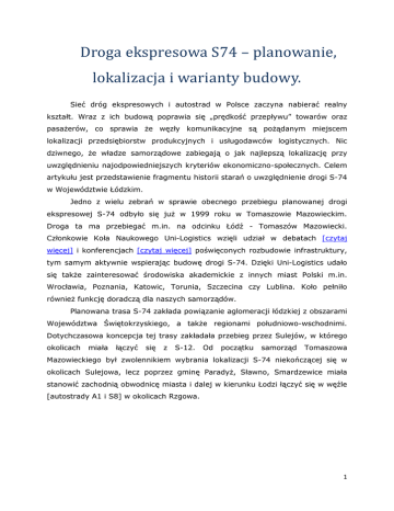 Droga ekspresowa S74 – planowanie, lokalizacja i warianty budowy. Sieć dróg ekspresowych i autostrad w Polsce zaczyna nabierać realny kształt. Wraz z ich budową poprawia się „prędkość przepływu” towarów oraz pasażerów, co sprawia że węzły komunikacyjne są pożądanym miejscem lokalizacji przedsiębiorstw produkcyjnych i usługodawców logistycznych. Nic dziwnego, że władze samorządowe zabiegają o jak najlepszą lokalizację przy uwzględnieniu najodpowiedniejszych kryteriów ekonomiczno-społecznych. Celem artykułu jest przedstawienie fragmentu historii starań o uwzględnienie drogi S-74 w Województwie Łódzkim. Jedno z wielu zebrań w sprawie obecnego przebiegu planowanej drogi ekspresowej S-74 odbyło się już w 1999 roku w Tomaszowie Mazowieckim. Droga ta ma przebiegać m.in. na odcinku Łódź - Tomaszów Mazowiecki. Członkowie Koła Naukowego Uni-Logistics wzięli udział w debatach [czytaj więcej] i konferencjach [czytaj więcej] poświęconych rozbudowie infrastruktury, tym samym aktywnie wspierając budowę drogi S-74. Dzięki Uni-Logistics udało się także zainteresować środowiska akademickie z innych miast Polski m.in. Wrocławia, Poznania, Katowic, Torunia, Szczecina czy Lublina. Koło pełniło również funkcję doradczą dla naszych samorządów. Planowana trasa S-74 zakłada powiązanie aglomeracji łódzkiej z obszarami Województwa Świętokrzyskiego, a także regionami południowo-wschodnimi. Dotychczasowa koncepcja tej trasy zakładała przebieg przez Sulejów, w którego okolicach miała łączyć się z S-12. Od początku samorząd Tomaszowa Mazowieckiego był zwolennikiem wybrania lokalizacji S-74 niekończącej się w okolicach Sulejowa, lecz poprzez gminę Paradyż, Sławno, Smardzewice miała stanowić zachodnią obwodnicę miasta i dalej w kierunku Łodzi łączyć się w węźle [autostrady A1 i S8] w okolicach Rzgowa. 1 Mapa 1. Proponowany przebieg S74 Źródło: http://www.uni-logistics.uni.lodz.pl/pliki/Sprawozdanie_z_konferencji.pdf w dn. 2015.02.03. Inicjatorem i pomysłodawcą aktualnego przebiegu drogi S-74 jest Jacek Kowalewski, były naczelnik w Urzędzie Miasta, później członek Zarządu Powiatu odpowiedzialny za drogi oraz radny miejski. Również przebieg drogi S-74 nie jest jeszcze ustalony jeśli chodzi o południową część województwa w którym rozważane są 3 warianty (Mapa 2). 2 Mapa 2. Warianty przebiegu S-74 w południowo-wschodniej części województwa. Źródło: http://www.dzienniklodzki.pl/artykul/380670,lodzkie-pomysly-na-trases74,id,t.html w dn. 2015.03.26 Droga ekspresowa S-74 powinna oprócz przyciągania inwestycji i poprawy przepływów w lokalnych łańcuchach dostaw, wpływać dodatnio na logistykę kopalni piasku kwarcowego Grudzeń-Las, Syski i Biała Góra. W przypadku realizacji inwestycji poprawiłoby się bezpieczeństwo na drogach, jak również atrakcyjność lokalizacyjna Zalewu Sulejowskiego, jako obszaru turystycznego, podobnie jak Lasów Spalskich.1 Do grudnia 1999 roku wszystkie samorządy szczebla gminnego, przez które miała przebiegać droga S-74, podjęły uchwały intencyjne, wspierające realizację tego projektu. Początkowo droga ta miała przebiegać nad doliną Pilicy i wyrobiskami kopalni piasku kwarcowego "Biała Góra". W 1999 pomysł zakładał, że droga S-74 będzie łączyć Łódź z Tomaszowem Mazowieckim, co otworzyć miało strategiczny kierunek południowo-wschodni relacji Bałtyk - Morze Czarne 1 Wniosek prezydenta miasta Tomaszowa Mazowieckiego i starosty powiatu tomaszowskiego do ministra Transportu, budownictwa i gospodarki morskiej Sławomira Nowaka, Tomaszów Mazowiecki dn. 13.04.2013 3 oraz poprawić obsługę ruchu turystycznego z Łodzi nad teren Zalewu Sulejowskiego. Koncepcja ta została przyjęta w 2000 roku. Od tego czasu Samorząd Miasta Tomaszowa Mazowieckiego walczył o wpisanie tej drogi w relacji Łódź - Tomaszów Mazowiecki - Kielce do programów rządowych. Na szczeblu krajowym droga S-74 pojawiła się dopiero w 2003 roku, potem w 2004 i 2007 w rozporządzeniach Rady Ministrów, lecz w innym przebiegu niż w dokumentach województwa. W 2003 roku Biuro Planowania Przestrzennego Województwa Łódzkiego rozpatrywało drogę S-74 wspólnie z drogą S-12. Rozpoczęto też pracę nad wyznaczeniem korytarza transportowego dla przebiegu drogi S-74. Brano przy tym pod uwagę różne ograniczenia, w szczególności te występujące w okolicach Tomaszowa Mazowieckiego. W 2006 roku droga S-74 zaczęła stanowić element centralnego węzła komunikacyjnego wokół Łodzi. W 2008 roku odbyła się konferencja pt. "Drogi ekspresowe S-74, S-12, S-8 (Wrocław - Łódź) i ich strategiczne znaczenie dla rozwoju Polski środkowowschodniej". Była ona kontynuacją od dawna podejmowanych działań na rzecz realizacji tej inwestycji. Droga S-74 miała stworzyć obwodnicę dla Tomaszowa Mazowieckiego. Jedynym problemem był brak zapisów takich rozwiązań w rozporządzeniu Rady Ministrów, dotyczącym przebiegu autostrad i dróg ekspresowych. Argumenty przedstawione na konferencji pozwoliły GDDKiA, Ministrowi Infrastruktury oraz Radzie Ministrów w podjęciu decyzji i wprowadzeniu stosownych zapisów dotyczących proponowanych przebiegów dróg ekspresowych na terenie województwa łódzkiego. Aktualizacja przebiegu drogi S-74 polegała na jej przesunięciu do okolic Rzgowa. Dzięki temu zostanie ona skomunikowana z systemem drogowym w tej części Polski. W ostatecznej wersji droga S-74 łączy dwa odcinki drogi S-8. Dalszy odcinek będzie przebiegał w kierunku Kielc, a następnie w kierunku południowo-wschodnim przez Opatów, Tarnobrzeg, Stalową Wolę do Lublina, a być może także do granicy Polsko-Ukraińskiej. Taka wersja przebiegu drogi S-74 została przedstawiona przez Radę Miejską Tomaszowa Mazowieckiego. W czerwcu 2013 roku Miasto Łódź poparło zmianę przebiegu drogi S-74, natomiast w listopadzie Parlament Europejski w pełni za