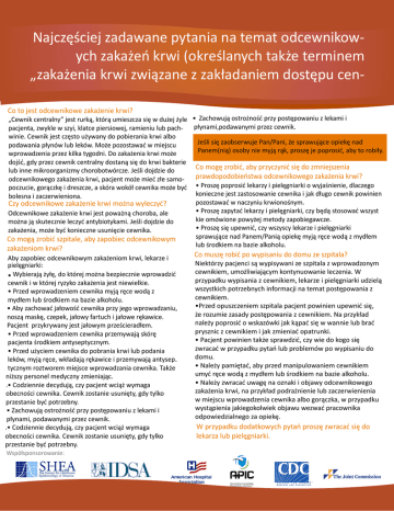 Najczęściej zadawane pytania na temat odcewnikowych zakażeń krwi (określanych także terminem „zakażenia krwi związane z zakładaniem dostępu cenCo to jest odcewnikowe zakażenie krwi? „Cewnik centralny” jest rurką, którą umieszcza się w dużej żyle • Zachowują ostrożność przy postępowaniu z lekami i płynami,podawanymi przez cewnik. pacjenta, zwykle w szyi, klatce piersiowej, ramieniu lub pachwinie. Cewnik jest często używany do pobierania krwi albo Jeśli się zaobserwuje Pan/Pani, że sprawujące opiekę nad podawania płynów lub leków. Może pozostawać w miejscu Panem(nią) osoby nie myją rąk, proszę je poprosić, aby to robiły. wprowadzenia przez kilka tygodni. Do zakażenia krwi może dojść, gdy przez cewnik centralny dostaną się do krwi bakterie Co mogę zrobić, aby przyczynić się do zmniejszenia lub inne mikroorganizmy chorobotwórcze. Jeśli dojdzie do prawdopodobieństwa odcewnikowego zakażenia krwi? odcewnikowego zakażenia krwi, pacjent może mieć złe samopoczucie, gorączkę i dreszcze, a skóra wokół cewnika może być • Proszę poprosić lekarzy i pielęgniarki o wyjaśnienie, dlaczego konieczne jest zastosowanie cewnika i jak długo cewnik powinien bolesna i zaczerwieniona. pozostawać w naczyniu krwionośnym. Czy odcewnikowe zakażenie krwi można wyleczyć? • Proszę zapytać lekarzy i pielęgniarki, czy będą stosować wszyst Odcewnikowe zakażenie krwi jest poważną choroba, ale kie omówione powyżej metody zapobiegawcze. można ją skutecznie leczyć antybiotykami. Jeśli dojdzie do • Proszę się upewnić, czy wszyscy lekarze i pielęgniarki zakażenia, może być konieczne usunięcie cewnika. sprawujące nad Panem/Panią opiekę myją ręce wodą z mydłem Co mogą zrobić szpitale, aby zapobiec odcewnikowym lub środkiem na bazie alkoholu. zakażeniom krwi? Aby zapobiec odcewnikowym zakażeniom krwi, lekarze i pielęgniarki: • Wybierają żyłę, do której można bezpiecznie wprowadzić cewnik i w której ryzyko zakażenia jest niewielkie. • Przed wprowadzeniem cewnika myją ręce wodą z mydłem lub środkiem na bazie alkoholu. • Aby zachować jałowość cewnika przy jego wprowadzaniu, noszą maskę, czepek, jałowy fartuch i jałowe rękawice. Pacjent przykrywany jest jałowym prześcieradłem. • Przed wprowadzeniem cewnika przemywają skórę pacjenta środkiem antyseptycznym. • Przed użyciem cewnika do pobrania krwi lub podania leków, myją ręce, wkładają rękawice i przemywają antyseptycznym roztworem miejsce wprowadzania cewnika. Także niższy personel medyczny zmieniając. .• Codziennie decydują, czy pacjent wciąż wymaga obecności cewnika. Cewnik zostanie usunięty, gdy tylko przestanie być potrzebny. • Zachowują ostrożność przy postępowaniu z lekami i płynami, podawanymi przez cewnik. .• Codziennie decydują, czy pacjent wciąż wymaga obecności cewnika. Cewnik zostanie usunięty, gdy tylko przestanie być potrzebny. Współsponsorowanie: Co muszę robić po wypisaniu do domu ze szpitala? Niektórzy pacjenci są wypisywani ze szpitala z wprowadzonym cewnikiem, umożliwiającym kontynuowanie leczenia. W przypadku wypisania z cewnikiem, lekarze i pielęgniarki udzielą wszystkich potrzebnych informacji na temat postępowania z cewnikiem. •Przed opuszczeniem szpitala pacjent powinien upewnić się, że rozumie zasady postępowania z cewnikiem. Na przykład należy poprosić o wskazówki jak kąpać się w wannie lub brać prysznic z cewnikiem i jak zmieniać opatrunki. • Pacjent powinien także sprawdzić, czy wie do kogo się zwracać w przypadku pytań lub problemów po wypisaniu do domu. • Należy pamiętać, aby przed manipulowaniem cewnikiem umyć ręce wodą z mydłem lub środkiem na bazie alkoholu. • Należy zwracać uwagę na oznaki i objawy odcewnikowego zakażenia krwi, na przykład podrażnienie lub zaczerwienienia w miejscu wprowadzenia cewnika albo gorączka, w przypadku wystąpienia jakiegokolwiek objawu wezwać pracownika odpowiedzialnego za opiekę. W przypadku dodatkowych pytań proszę zwracać się do lekarza lub pielęgniarki.