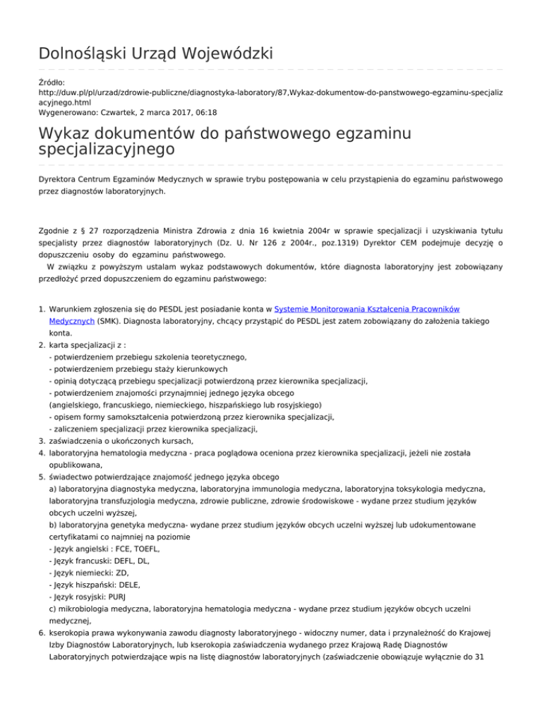 Dolnośląski Urząd Wojewódzki Źródło: http://duw.pl/pl/urzad/zdrowie-publiczne/diagnostyka-laboratory/87,Wykaz-dokumentow-do-panstwowego-egzaminu-specjaliz acyjnego.html Wygenerowano: Czwartek, 2 marca 2017, 06:18 Wykaz dokumentów do państwowego egzaminu specjalizacyjnego Dyrektora Centrum Egzaminów Medycznych w sprawie trybu postępowania w celu przystąpienia do egzaminu państwowego przez diagnostów laboratoryjnych. Zgodnie z § 27 rozporządzenia Ministra Zdrowia z dnia 16 kwietnia 2004r w sprawie specjalizacji i uzyskiwania tytułu specjalisty przez diagnostów laboratoryjnych (Dz. U. Nr 126 z 2004r., poz.1319) Dyrektor CEM podejmuje decyzję o dopuszczeniu osoby do egzaminu państwowego. W związku z powyższym ustalam wykaz podstawowych dokumentów, które diagnosta laboratoryjny jest zobowiązany przedłożyć przed dopuszczeniem do egzaminu państwowego: 1. Warunkiem zgłoszenia się do PESDL jest posiadanie konta w Systemie Monitorowania Kształcenia Pracowników Medycznych (SMK). Diagnosta laboratoryjny, chcący przystąpić do PESDL jest zatem zobowiązany do założenia takiego konta. 2. karta specjalizacji z : - potwierdzeniem przebiegu szkolenia teoretycznego, - potwierdzeniem przebiegu staży kierunkowych - opinią dotyczącą przebiegu specjalizacji potwierdzoną przez kierownika specjalizacji, - potwierdzeniem znajomości przynajmniej jednego języka obcego (angielskiego, francuskiego, niemieckiego, hiszpańskiego lub rosyjskiego) - opisem formy samokształcenia potwierdzoną przez kierownika specjalizacji, - zaliczeniem specjalizacji przez kierownika specjalizacji, 3. zaświadczenia o ukończonych kursach, 4. laboratoryjna hematologia medyczna - praca poglądowa oceniona przez kierownika specjalizacji, jeżeli nie została opublikowana, 5. świadectwo potwierdzające znajomość jednego języka obcego a) laboratoryjna diagnostyka medyczna, laboratoryjna immunologia medyczna, laboratoryjna toksykologia medyczna, laboratoryjna transfuzjologia medyczna, zdrowie publiczne, zdrowie środowiskowe - wydane przez studium języków obcych uczelni wyższej, b) laboratoryjna genetyka medyczna- wydane przez studium języków obcych uczelni wyższej lub udokumentowane certyfikatami co najmniej na poziomie - Język angielski : FCE, TOEFL, - Język francuski: DEFL, DL, - Język niemiecki: ZD, - Język hiszpański: DELE, - Język rosyjski: PURJ c) mikrobiologia medyczna, laboratoryjna hematologia medyczna - wydane przez studium języków obcych uczelni medycznej, 6. kserokopia prawa wykonywania zawodu diagnosty laboratoryjnego - widoczny numer, data i przynależność do Krajowej Izby Diagnostów Laboratoryjnych, lub kserokopia zaświadczenia wydanego przez Krajową Radę Diagnostów Laboratoryjnych potwierdzające wpis na listę diagnostów laboratoryjnych (zaświadczenie obowiązuje wyłącznie do 31 grudnia 2006r), 7. kserokopia dyplomu ukończonej szkoły wyższej UWAGA Świadectwo wydane przez studium języków obcych jest uznawane, gdy okres od zdania egzaminu z języka obcego do dnia rozpoczęcia specjalizacji nie przekracza 5 lat. Dokumenty prosimy składać w białej, wiązanej, nie podpisanej teczce. TERMIN SKŁADANIA DOKUMENTÓW Dokumenty do egzaminu powinny być złożone do Ośrodka Doskonalenia Kadr Medycznych: - przed sesją wiosenną - do 15 stycznia - przed sesją jesienną - do 15 lipca Egzamin państwowy odbywa się : - w sesji wiosennej - od dnia 15 kwietnia do dnia 31 maja - w sesji jesiennej - od dnia 2 listopada do dnia 15 grudnia 1. Drukuj Generuj PDF Powiadom znajomego Wstecz liczba wejść: 3324