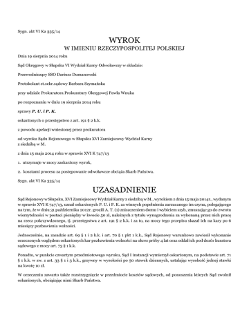 Sygn. akt VI Ka 335/14 WYROK W IMIENIU RZECZYPOSPOLITEJ POLSKIEJ Dnia 19 sierpnia 2014 roku Sąd Okręgowy w Słupsku VI Wydział Karny Odwoławczy w składzie: Przewodniczący SSO Dariusz Dumanowski Protokolant st.sekr.sądowy Barbara Szymańska przy udziale Prokuratora Prokuratury Okręgowej Pawła Wnuka po rozpoznaniu w dniu 19 sierpnia 2014 roku sprawy P. U. i P. K. oskarżonych o przestępstwo z art. 191 § 2 k.k. z powodu apelacji wniesionej przez prokuratora od wyroku Sądu Rejonowego w Słupsku XVI Zamiejscowy Wydział Karny z siedzibą w M. z dnia 15 maja 2014 roku w sprawie XVI K 747/13 1. utrzymuje w mocy zaskarżony wyrok, 2. kosztami procesu za postępowanie odwoławcze obciąża Skarb Państwa. Sygn. akt VI Ka 335/14 UZASADNIENIE Sąd Rejonowy w Słupsku, XVI Zamiejscowy Wydział Karny z siedzibą w M., wyrokiem z dnia 15 maja 2014r., wydanym w sprawie XVI K 747/13, uznał oskarżonych P. U. i P. K. za winnych popełnienia zarzucanego im czynu, polegającego na tym, że w dniu 31 października 2012r. grozili A. T. (1) zniszczeniem domu i wybiciem szyb, zmuszając go do zwrotu wierzytelności w postaci pieniędzy w kwocie 50 zł, należnych z tytułu wynagrodzenia za wykonaną przez nich pracę na rzecz pokrzywdzonego, tj. przestępstwa z art. 191 § 2 k.k. i za to, na mocy tego przepisu skazał ich na kary po 6 miesięcy pozbawienia wolności. Jednocześnie, na zasadzie art. 69 § 1 i 2 k.k. i art. 70 § 1 pkt 1 k.k., Sąd Rejonowy warunkowo zawiesił wykonanie orzeczonych względem oskarżonych kar pozbawienia wolności na okres próby 4 lat oraz oddał ich pod dozór kuratora sądowego z mocy art. 73 § 1 k.k. Ponadto, w punkcie czwartym przedmiotowego wyroku, Sąd I instancji wymierzył oskarżonym, na podstawie art. 71 § 1 k.k. w zw. z art. 33 § 1 i 3 k.k., grzywny w wysokości po 50 stawek dziennych, ustalając wysokość jednej stawki na kwotę 10 zł. W orzeczeniu zawarto także rozstrzygnięcie w przedmiocie kosztów sądowych, od ponoszenia których Sąd zwolnił oskarżonych, obciążając nimi Skarb Państwa. Powyższy wyrok, w części dotyczącej orzeczenia o karze, apelacją na niekorzyść oskarżonych, zaskarżył prokurator, który zarzucił Sądowi I instancji obrazę przepisu prawa materialnego, tj. art. 33 § 2 k.k., polegającą na niewskazaniu tego przepisu, jako podstawy wymiaru kary grzywny za przypisany oskarżonym występek z art. 191 § 2 k.k. pomimo, iż – w jego ocenie – P. U. i P. K. dopuścili się popełnienia zarzucanego im czynu w celu osiągnięcia korzyści majątkowej. W konsekwencji tak postawionego zarzutu oskarżyciel publiczny wniósł o zmianę zaskarżonego wyroku przez wskazanie, jako podstawy wymiaru kary grzywny, przepisu art. 33 § 2 k.k. Sąd Okręgowy zważył, co następuje: Apelacja prokuratora nie zasługiwała na uwzględnienie. Tytułem wstępu zaakcentowania wymaga, że skarżący nie zakwestionował dokonanych w niniejszej sprawie przez Sąd meriti ustaleń faktycznych. Również wina i okoliczności popełnienia zarzucanego oskarżonym występku z art. 191 § 2 k.k. nie budziły jego wątpliwości. Z kolei Sąd Okręgowy, mając na uwadze zakres zaskarżenia, nie znalazł z urzędu jakichkolwiek podstaw, aby zakwestionować poprawność przeprowadzonej oceny dowodów, ustaleń faktycznych, czy też końcowych wniosków w sprawie, które determinowałyby konieczność wydania orzeczenia kasacyjnego. Z tego też względu szczegółowe odniesienie się do zarzutu apelacji wymaga poczynienia pewnych uwag porządkujących. Oskarżeni P. U. i P. K. zostali uznani za winnych popełnienia zarzucanego im aktem oskarżenia czynu z art. 191 § 2 k.k., za który wymierzono im kary po 6 miesięcy pozbawienia wolności z warunkowym zawieszeniem ich wykonania na okres próby lat 4 i dozorem kuratorskim, a nadto orzeczono wobec nich kary grzywny z mocy art. 71 § 1 k.k. w zw. z art. 33 § 1 i 3 k.k. Godzi się zważyć, że istota czynu z art. 191 § 2 k.k. sprowadza się do takiego działania sprawcy, który stosując przemoc lub groźbę bezprawną, zmusza do zwrotu (zaspokojenia) przysługujących mu wierzytelności. Ta ostatnia właściwość odróżnia przestępstwo określone w art. 191 § 2 k.k. od przestępstwa przeciwko mieniu, w szczególności od przestępstwa wymuszenia rozbójniczego. Dla wypełnienia znamion przestępstwa stosowania przemocy lub groźby bezprawnej w celu wymuszenia zwrotu wierzytelności wystarczy w zasadzie subiektywne przekonanie sprawcy, iż wierzytelność faktycznie istnieje, lecz nie chodzi tu o każdą wierzytelność, a jedynie podlegającą ochronie prawnej. Istotne jest więc, czy sprawca wymuszający zwrot świadczenia działa w takim celu, to jest ze świadomością, iż na podstawie obowiązującego prawa przysługuje mu lub osobie, na rzecz której działa wierzytelność, a dłużnik jest zobowiązany do określonego świadczenia. Reasumując, cel, dla którego sprawcy dokonują bezprawnego wymuszenia nie jest związany z chęcią przywłaszczenia (zamiar kierunkowy) cudzego mienia, a ze świadomością wymuszenia na dłużniku faktycznie istniejącej wierzytelności i jedynie sposób działania sprawy lub instrumenty, jakimi się posługuje, pozostają nieuprawnione. W ocenie Sądu Okręgowego, brak jest zatem podstaw do twierdzenia, że do podstawowych znamion tego przestępstwa należy działanie sprawcy w celu osiągnięcia korzyści majątkowej. Jest bowiem oczywistym, że "korzyść majątkowa", o jakiej mowa w art. 33 § 2 k.k., wchodzi w grę tylko wtedy, gdy sprawca przestępstwa działał w celu jej osiągnięcia (dla siebie lub kogo innego). Nie każdy więc sprawca przestępstwa, jeżeli nawet osiąga korzyść majątkową w powyższym jej znaczeniu, działa w tym zamiarze specjalnym. Nie działa w tym zamiarze sprawca, który osiąga lub chce osiągnąć wyłącznie to, co mu się prawnie należy (por. uchwałę składu siedmiu sędziów Sądu Najwyższego z dnia 15 lut