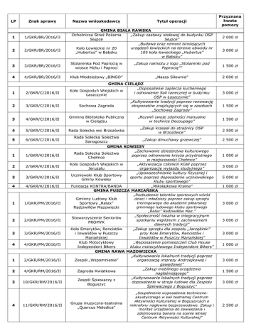 LP Znak sprawy Nazwa wnioskodawcy Tytuł operacji GMINA BIAŁA RAWSKA Ochotnicza Straż Pożarna „Zakup zastawy stołowej do budynku OSP Słupce Słupce” „Budowa oraz remont istniejących urządzeń łowieckich na terenie obwodu nr Koło Łowieckie nr 20 105 koła łowieckiego „Hubertus” „Hubertus” w Babsku w Babsku” Przyznana kwota pomocy 1 1/GKR/BR/2016/II 2 2/GKR/BR/2016/II 3 3/GKR/BR/2016/II Stolarenka Pod Paprocią w wiosce Mchu i Paproci „Zakup namiotu z logo „Stolarenki pod Paprocią”” 1 500 zł 4 4/GKR/BR/2016/II Klub Młodzieżowy „BINGO” „Nasza Siłownia” 2 000 zł GMINA CIELĄDZ „Doposażenie zaplecza kuchennego Koło Gospodyń Wiejskich w i odnowienie Sali tanecznej w budynku Łaszczynie OSP w Łaszczynie” „Kultywowanie tradycji poprzez renowację eksponatów znajdujących się w zasobach Sochowa Zagroda „Sochowej Zagrody” 2 000 zł 3 000 zł 1 2/GKR/C/2016/II 2 3/GKR/C/2016/II 3 4/GKR/C/2016/II Gminna Biblioteka Publiczna w Cielądzu „Rozwiń swoje zdolności manualne w technice Decoupage” 1 500 zł 4 5/GKR/C/2016/II Rada Sołecka wsi Brzozówka „Zakup krzeseł do strażnicy OSP w Brzozówce” 2 500 zł 5 6/GKR/C/2016/II 1 1/GKR/K/2016/II 2 2/GKR/K/2016/II 3 3/GKR/K/2016/II 4 4/GKR/K/2016/II 1 1/GKR/PM/2016/II 2 2/GKR/PM/2016/II 3 3/GKR/PM/2016/II 4 4/GKR/PM/2016/II 1 2/GKR/RM/2016/II 2 4/GKR/RM/2016/II 3 10/GKR/RM/2016/II 4 11/GKR/RM/2016/II Rada Sołecka Sołectwa „Zakup dmuchawy grzewczej” Sanogoszcz GMINA KOWIESY „Zachowanie dziedzictwa kulturowego Rada Sołecka Sołectwa poprzez odnowienie krzyża przydrożnego Chełmce w miejscowości Chełmce” Koło Gospodyń Wiejskich w „Aktywizacja członkiń KGW poprzez Jeruzalu organizację wyjazdu studyjnego” „Upowszechnianie kultury fizycznej i Uczniowski Klub Sportowy sportu poprzez doposażenie uczniowskiego Gminy Kowiesy klubu sportowego” Fundacja KONTRA/BANDA „Mikołajkowa Kraina” GMINA PUSZCZA MARIAŃSKA Gminny Ludowy Klub Sportowy „Relax” Radziwiłłów Mazowiecki „Rozbudzenie talentów sportowych wśród dzieci i młodzieży poprzez zakup sprzętu treningowego dla akademii piłkarskiej gminnego ludowego klubu sportowego „Relax” Radziwiłłów Maz.” „Społeczność lokalna w integracyjnym spotkaniu wigilijnym z zachowaniem dawnych tradycji” Koło Emerytów, Rencistów „Zakup sprzętu dla zespołu „Jarzębinki” i Inwalidów w Puszczy przy Kole Emerytów, Rencistów i Mariańskiej Inwalidów w Puszczy Mariańskiej” Klub Motocyklowy „Wyposażenie pomieszczeń Club House Independent Bikers klubu motocyklowego Independent Bikers” GMINA RAWA MAZOWIECKA „Kultywowanie lokalnych tradycji poprzez Zespół „Wspomnienie” organizację imprezy Andrzejkowej i gawędowej” „Zakup mobilnego urządzenia Zagroda Kwiatkowa nagłaśniającego” „Kultywowanie lokalnych tradycji poprzez Zespół Śpiewaczy z doposażenie w stroje ludowe dla Zespołu Boguszyc Śpiewaczego z Boguszyc” Stowarzyszenie Seniorów PROMYK Grupa muzyczno-teatralna „Quercus Melodica” „Uzupełnienie wyposażenia technicznoakustycznego w sali teatralnej Centrum Aktywności Kulturalnej w Boguszycach o mikrofony nagłowne bezprzewodowe. Zakup i montaż urządzenia do zawieszania i zdejmowania banera na scenie letniej Centrum Aktywności Kulturalnej” 3 000 zł 1 500 zł 2 500 zł 1 000 zł 3 000 zł 5 000 zł 1 000 zł 3 000 zł 3 000 zł 3 000 zł 1 000 zł 3 000 zł 1 500 zł 3 000 zł 2 500 zł GMINA SADKOWICE 1 1/GKR/S/2016/II Nieformalne Koło Gospodyń w Lewinie „Zakup wyposażenia do świetlicy środowiskowej w Lewinie” 1 500 zł 2 2/GKR/S/2016/II Sołectwo Wsi Kłopoczyn „Doposażenie placu zabaw (rekreacyjnosportowego) w Kłopoczynie” 4 000 zł Wioska tematyczna „Wioska Jabłkowa” „Zakup wyposażenia do siedziby „Wioski Jabłkowej” 4 500 zł 3 3/GKR/S/2016/II 1 3/GKR/W/2016/II 2 4/GKR/W/2016/II 3 5/GKR/W/2016/II 4 9/ GKR/W/2016/II 1 1/GKR/Ż/2016/II 2 2/GKR/Ż/2016/II GMINA WISKITKI „Dofinansowanie dla Ochotniczej Straży Ochotnicza Straż Pożarna w Pożarnej w Aleksandrowie do wyposażenia Aleksandrowie świetlicy wiejskiej” Koło Gospodyń Wiejskich „Wzrost aktywności KGW poprzez zakup Stare Kozłowice wyposażenia do świetlicy wiejskiej” Koło Gospodyń Wiejskich w „Wzrost aktywności KGW oraz integracja Nowych Kozłowicach KGW na terenie gminy Wiskitki” Ochotnicza Straż Pożarna w Nowym Oryszewie „Zakup obrusów na stoły do sali OSP” GMINA ŻELECHLINEK Koło Gospodyń Wiejskich „Remont Świetlicy Wiejskiej w Lesisku” w Lesisku „Zagospodarowanie terenu przy Świetlicy Sołectwo Lesisko Wiejskiej w Lesisku” 3 000 zł 2 000 zł 3 500 zł 1 500 zł 5 000 zł 5 000 zł