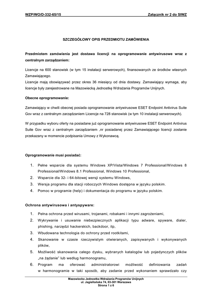WZP/WO/D-332-65/15 Załącznik nr 2 do SIWZ SZCZEGÓŁOWY OPIS PRZEDMIOTU ZAMÓWIENIA Przedmiotem zamówienia jest dostawa licencji na oprogramowanie antywirusowe wraz z centralnym zarządzaniem: Licencje na 600 stanowisk (w tym 15 instalacji serwerowych), finansowanych ze środków własnych Zamawiającego. Licencje mają obowiązywać przez okres 36 miesięcy od dnia dostawy. Zamawiający wymaga, aby licencje były zarejestrowane na Mazowiecką Jednostkę Wdrażania Programów Unijnych. Obecne oprogramowanie: Zamawiający w chwili obecnej posiada oprogramowanie antywirusowe ESET Endpoint Antivirus Suite Gov wraz z centralnym zarządzaniem Licencje na 728 stanowisk (w tym 10 instalacji serwerowych). W przypadku wyboru oferty na posiadane już oprogramowanie antywirusowe ESET Endpoint Antivirus Suite Gov wraz z centralnym zarządzaniem ,nr posiadanej przez Zamawiającego licencji zostanie przekazany w momencie podpisania Umowy z Wykonawcą. Oprogramowanie musi posiadać: 1. Pełne wsparcie dla systemu Windows XP/Vista/Windows 7 Professional/Windows 8 Professional/Windows 8.1 Professional, Windows 10 Professional, 2. Wsparcie dla 32- i 64-bitowej wersji systemu Windows, 3. Wersja programu dla stacji roboczych Windows dostępna w języku polskim. 4. Pomoc w programie (help) i dokumentacja do programu w języku polskim. Ochrona antywirusowa i antyspyware: 1. Pełna ochrona przed wirusami, trojanami, robakami i innymi zagrożeniami, 2. Wykrywanie i usuwanie niebezpiecznych aplikacji typu adware, spyware, dialer, phishing, narzędzi hackerskich, backdoor, itp, 3. Wbudowana technologia do ochrony przed rootkitami, 4. Skanowanie w czasie rzeczywistym otwieranych, zapisywanych i wykonywanych plików, 5. Możliwość skanowania całego dysku, wybranych katalogów lub pojedynczych plików „na żądanie” lub według harmonogramu, 6. Program ma oferować administratorowi możliwość definiowania zadań w harmonogramie w taki sposób, aby zadanie przed wykonaniem sprawdzało czy Mazowiecka Jednostka Wdrażania Programów Unijnych ul. Jagiellońska 74, 03-301 Warszawa Strona 1 z 6 WZP/WO/D-332-65/15 Załącznik nr 2 do SIWZ komputer pracuje na zasilaniu bateryjnym, jeżeli tak - nie wykonywało danego zadania, 7. Możliwość skanowania dysków przenośnych, 8. Skanowanie plików spakowanych i skompresowanych, 9. Możliwość umieszczenia na liście wyłączenia ze skanowania wybranych plików, katalogów lub plików o określonych rozszerzeniach, 10. Wbudowany konektor dla programów MS Outlook, Outlook Express, i (funkcje programu dostępne są bezpośrednio z menu programu pocztowego), 11. Skanowanie i oczyszczanie w czasie rzeczywistym poczty przychodzącej i wychodzącej obsługiwanej przy pomocy programów MS Outlook, Outlook Express, 12. Skanowanie i oczyszczanie poczty przychodzącej POP3 i IMAP „w locie” (w czasie rzeczywistym), zanim zostanie dostarczona do klienta pocztowego zainstalowanego na stacji roboczej (niezależnie od konkretnego klienta pocztowego), 13. Automatyczna integracja skanera POP3 i IMAP z dowolnym klientem pocztowym bez konieczności zmian w konfiguracji, 14. Możliwość definiowania różnych portów dla POP3 i IMAP, na których ma odbywać się skanowanie, 15. Możliwość opcjonalnego dołączenia informacji o przeskanowaniu zainfekowanych wiadomości e-mail, 16. Skanowanie ruchu HTTP na poziomie stacji roboczych. Zainfekowany ruch jest automatycznie blokowany, a użytkownikowi wyświetlane jest stosowne powiadomienie, 17. Automatyczna integracja z dowolną przeglądarką internetową bez konieczności zmian w konfiguracji, 18. Możliwość definiowania różnych portów dla HTTP, na których ma odbywać się skanowanie, 19. Program ma umożliwiać skanowanie ruchu sieciowego wewnątrz szyfrowanych protokołów HTTPS, POP3S, IMAPS, 20. Program ma zapewniać skanowanie ruchu HTTPS transparentnie bez potrzeby konfiguracji zewnętrznych aplikacji takich jak przeglądarki Web lub programy pocztowe, 21. Administrator ma mieć możliwość zdefiniowania portów TCP, na których aplikacja będzie realizowała proces skanowania ruchu szyfrowanego, 22. W przypadku gdy stacja robocza nie będzie posiadała dostępu do sieci Internet ma odbywać się skanowanie wszystkich procesów również tych, które wcześniej zostały uznane za bezpieczne, 23. Możliwość zabezpieczenia konfiguracji programu hasłem, w taki sposób, aby użytkownik siedzący przy komputerze przy próbie dostępu do konfiguracji był proszony o podanie hasła, 24. Możliwość zabezpieczenia programu przed odinstalowaniem przez niepowołane osoby, nawet, gdy posiada ona prawa lokalnego lub domenowego administratora. Przy próbie odinstalowania program musi pytać o hasło, Mazowiecka Jednostka Wdrażania Programów Unijnych ul. Jagiellońska 74, 03-301 Warszawa Strona 2 z 6 WZP/WO/D-332-65/15 25. Program ma Załącznik nr 2 do SIWZ mieć możliwość kontroli zainstalowanych aktualizacji systemu operacyjnego i w przypadku braku jakiejś aktualizacji - poinformować o tym użytkownika wraz z listą niezainstalowanych aktualizacji, 26. Program ma mieć możliwość definiowania typu aktualizacji systemowych o braku, których będzie informować użytkownika w tym przynajmniej: aktualizacje krytyczne, aktualizacje ważne, aktualizacje zalecane oraz aktualizacje opcjonalne. Ma być możliwość dezaktywacji tego mechanizmu, 27. Program ma umożliwiać administratorowi blokowanie zewnętrznych nośników danych na stacji w tym przynajmniej: stacji dyskietek, napędów CD/DVD, czytników kart, 28. Aplikacja ma umożliwiać użytkownikowi nadanie uprawnień dla podłączanych urządzeń w tym co najmniej: dostęp w trybie do odczytu, pełen dostęp, brak dostępu do podłączanego urządzenia, 29. W momencie podłączenia zewnętrznego nośnika, aplikacja musi wyświetlić użytkownikowi odpowiedni komunikat i umożliwić natychmiastowe przeskanowanie całej zawartości podłączanego nośnika, 30. Progr