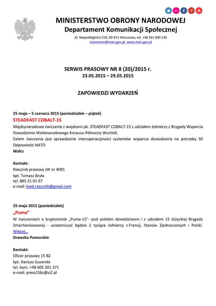 MINISTERSTWO OBRONY NARODOWEJ Departament Komunikacji Społecznej Al. Niepodległości 218, 00-911 Warszawa, tel. +48 261 840 230 [email protected], www.mon.gov.pl SERWIS PRASOWY NR 8 (20)/2015 r. 23.05.2015 – 29.05.2015 ZAPOWIEDZI WYDARZEŃ 25 maja – 5 czerwca 2015 (poniedziałek – piątek) STEADFAST COBALT-15 Międzynarodowe ćwiczenie z wojskami pk. STEADFAST COBALT-15 z udziałem żołnierzy z Brygady Wsparcia Dowodzenia Wielonarodowego Korpusu Północny Wschód. Celem ćwiczenia jest sprawdzenie interoperacyjności systemów wsparcia dowodzenia na potrzeby Sił Odpowiedzi NATO Wałcz Kontakt: Rzecznik prasowy JW nr 4091 kpt. Tomasz Bryła tel. 885 21 01 67 e-mail: [email protected] 25 maja 2015 (poniedziałek) „Puma” W ćwiczeniach o kryptonimie „Puma-15”- pod polskim dowództwem i z udziałem 15 Giżyckiej Brygady Zmechanizowanej - uczestniczyć będzie 2 tysiące żołnierzy z Francji, Stanów Zjednoczonych i Polski. Więcej… Drawsko Pomorskie Kontakt: Oficer prasowy 15 BZ kpt. Dariusz Guzenda tel. kom. +48 605 201 371 e-mail: [email protected] 26 maja 2015 (wtorek) Konferencja: Nauka-Przemysł-Obronność Z udziałem sekretarza stanu w MON Czesława Mroczka odbędzie się Konferencja Nauka-PrzemysłObronność. Podczas konferencji ogłoszone zostaną wyniki III konkursu na najlepszą pracę naukową i wdrożenie z obszaru obronności. Więcej… Warszawa, Centrum Konferencyjne WP (ul. Żwirki i Wigury 9/13) Kontakt: DPZ tel. +48 261 846 607, faks +48 261 874 037 e-mail: [email protected] 26 -29 maja 2015 (wtorek-piątek) „MILTROPA CUP 2015” Z udziałem ośmiu reprezentacji stołecznych garnizonów państw Europy Środkowej odbędzie się międzynarodowy turniej piłki nożnej „MILTROPA CUP 2015”. Mrągowo Kontakt: Rzecznik prasowy DGW ppłk Joanna Klejszmit-Bodziuch Tel. 261 879 102, 721 810 749 e-mail: [email protected] 26 maja 2015 (wtorek), godz. 9.00 Wieniec przed GNŻ Przed rozpoczęciem międzynarodowej konferencji ,,Capital Commander Club” dowódcy stołecznych garnizonów państw Europy Środkowej złożą wieniec przed Grobem Nieznanego Żołnierza. Gospodarzem konferencji będzie Dowódca Garnizonu Warszawa gen. bryg. Wiesław Grudziński. Warszawa Kontakt: Rzecznik prasowy DGW ppłk Joanna Klejszmit-Bodziuch Tel. 261 879 102, 721 810 749 e-mail: [email protected] 28 maja 2015 (czwartek), godz. 17.00 Warsztaty dla weteranów i ich rodzin Podsekretarz stanu w MON Maciej Jankowski weźmie udział w otwarciu warsztatów plastycznofotograficznych pt. „Śladami Józefa Chełmońskiego”. Celem projektu, przygotowanego przez Fundację „Nikt nie zostaje” jest wsparcie weteranów misji poza granicami kraju. Więcej… Dom Pracy Twórczej w Radziejowicach (ul. Sienkiewicza 4) Kontakt: Departament Komunikacji Społecznej tel.+48 261 840 230 e-mail: [email protected] 29 maja 2015 (piątek) Dzień Weterana Działań Poza Granicami Państwa Żołnierze i pracownicy jednostek wojskowych na terenie całego kraju obchodzić będą Dzień Weterana Działań Poza Granicami Państwa. Centralne uroczystości odbędą się w Bydgoszczy. Imprezy towarzyszące obchodom odbywać się będą już w przeddzień, tj. 28 maja. Szczegóły w oddzielnym komunikacie. Garnizony w całym kraju Kontakt: Departament Komunikacji Społecznej tel.+48 261 840 230 e-mail: [email protected] 29 - 30 maja 2015 (piątek - sobota), godz. 10.00-17.00 IX edycja Wystawy AIR FAIR 2015 Głównym celem Wystawy Air Fair 2015 jest konsolidacja środowiska lotniczego, zarówno wojskowego jak i cywilnego. Zgodnie z tradycją pierwszy dzień zostanie poświęcony wyłącznie Wystawcom oraz zaproszonym gościom. Drugi dzień będzie otwarty dla zwiedzających. Więcej... Bydgoszcz, Wojskowe Zakłady Lotnicze Nr 2 przy ul. Szubińskiej 107 Kontakt: Organizatorzy AIR FAIR 2015 tel. (52) 36 28 681 lub 679 fax. (52) 36 28 690 e-mail: [email protected] KRONIKA 15 maja 2015 (piątek) Wicepremier w zakładach lotniczych - Łódzkie Wojskowe Zakłady Lotnicze nr 1 będą ważnym elementem Wojskowej Wyżyny Lotniczej ulokowanego w centrum kraju zaplecza technologicznego dla produkcji i serwisu sprzętu wojskowego – zadeklarował, podczas wizyty w Łodzi, wicepremier, minister obrony narodowej Tomasz Siemoniak. Więcej… 16 maja 2015 (sobota) Noc Muzeów 2015 Noc Muzeów została zorganizowana w tym roku w trzeci weekend maja (16/17). Podobnie jak w latach ubiegłych do tego wyjątkowego święta kultury, sztuki i nauki przyłączyło się wojsko. Więcej… 18 maja 2015 (poniedziałek) Minister Siemoniak na sesji FAC w Brukseli - Uważamy, że Wspólna Polityka Bezpieczeństwa i Obrony Unii Europejskiej to nie tylko dodatkowy temat, ale narzędzie do rozwiązywania najważniejszych europejskich problemów na wschodzie czy południu powiedział wicepremier, minister obrony narodowej Tomasz Siemoniak. W poniedziałek w Brukseli wicepremier uczestniczył w spotkaniu ministrów obrony państw Unii Europejskiej, które odbyło się w formule FAC. Więcej… 19 maja 2015 (wtorek) Wicepremier Tomasz Siemoniak z wizytą w USA Wicepremier, minister obrony narodowej Tomasz Siemoniak przebywał z dwudniową wizytą w USA. Więcej… 20 maja 2015 (środa) Gala finałowa X edycji konkursu „Lex et Patria” W środę w Centralnej Bibliotece Wojskowej w Warszawie odbyła się uroczysta gala finałowa X edycji konkursu „Lex et Patria”. Celem konkursu jest promowanie jednostek wojskowych oraz żołnierzy zasłużonych dla kształtowania idei praworządności w Siłach Zbrojnych RP oraz wzrostu zaufania publicznego dla wojska. Więcej…