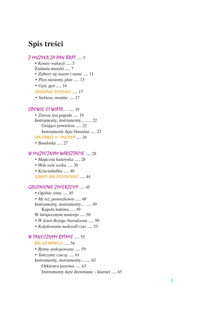 Spis treści Z MUZYKĄ ZA PAN BRAT ..... 5 • Koniec wakacji ..... 5 Zadania muzyki ..... 7 • Zabierz się razem z nami ..... 11 • Plon niesiemy, plon ..... 13 • Gęsi, gęsi ..... 16 ZAKAZANE PIOSENKI ..... 17 • Siekiera, motyka ..... 17 OPOWIE CI WIATR... ..... 19 • Zawsze jest pogoda ..... 19 Instrumenty, instrumenty... ..... 22 Grające powietrze ..... 22 Instrumenty dęte blaszane ..... 23 JAN PAWEŁ II I MUZYKA ..... 26 • Bandoska ..... 27 W MUZYCZNYM WARSZTACIE ..... 28 • Magiczna katarynka ..... 28 • Wele wele wetka ..... 38 • Kciuciubabka ..... 40 IGNACY JAN PADEREWSKI ..... 44 GRUDNIOWE ZMIERZCHY ..... 45 • Ogólnie zima ..... 45 • My też, pastuszkowie ..... 48 Instrumenty, instrumenty... ..... 49 Kapela ludowa ..... 49 W świątecznym nastroju ..... 50 • W dzień Bożego Narodzenia ..... 50 • Kolędowania nadszedł czas ..... 53 W TANECZNYM RYTMIE ..... 55 BAL NA WAWELU ..... 56 • Rytmy synkopowane ..... 59 • Tańczymy czaczę ..... 61 Instrumenty, instrumenty... ..... 63 Orkiestra jazzowa ..... 63 Instrumenty dęte drewniane – klarnet ..... 65 3 MUZYKA NA SCENIE ..... 66 Instrumenty, instrumenty... ..... 72 Instrumenty dęte drewniane – flet poprzeczny ..... 72 SPOTKANIE Z KOMPOZYTOREM ..... 73 • Prząśniczka ..... 74 WIOSENNE WARIACJE ..... 76 • Nadchodzi świt ..... 76 • Kiedy mi wesoło ..... 78 Instrumenty, instrumenty... ..... 82 Instrumenty dęte drewniane – obój i fagot ..... 82 NASZE HYMNY ..... 83 POSŁUCHAJ – ŚWIAT ŚPIEWA ..... 85 • Rozkołysz pieśnią świat ..... 85 Z WIZYTĄ NA KURPIACH ..... 91 Instrumenty, instrumenty... ..... 93 Potęga piszczałek ..... 93 MUZYCZNE OPOWIEŚCI ..... 95 • Od pierwszego wejrzenia ..... 95 Muzyka potrafi opowiadać ..... 99 • Na majówkę, na wędrówkę ..... 101 Instrumenty, instrumenty... ..... 103 Orkiestra symfoniczna ..... 103 • Mama reggae ..... 105 TADEUSZ KOŚCIUSZKO ..... 107 • Dalej, chłopcy, dalej żywo ..... 108 W OCZEKIWANIU NA LETNIE PRZYGODY ..... 110 • Sny kamieni ..... 110 • Wesoły żeglarz ..... 113 Wędrówki z Amadeuszem ..... 115 • Orléans ..... 116 • Dormi bambino ..... 117 • Piñón, piñón ..... 118 Spis piosenek zamieszczonych w podręczniku ..... 121 Źródła fotografii i reprodukcji ..... 123 Objaśnienie oznaczeń zastosowanych w podręczniku ..... 123 Podstawowe chwyty fletowe ..... 124 4