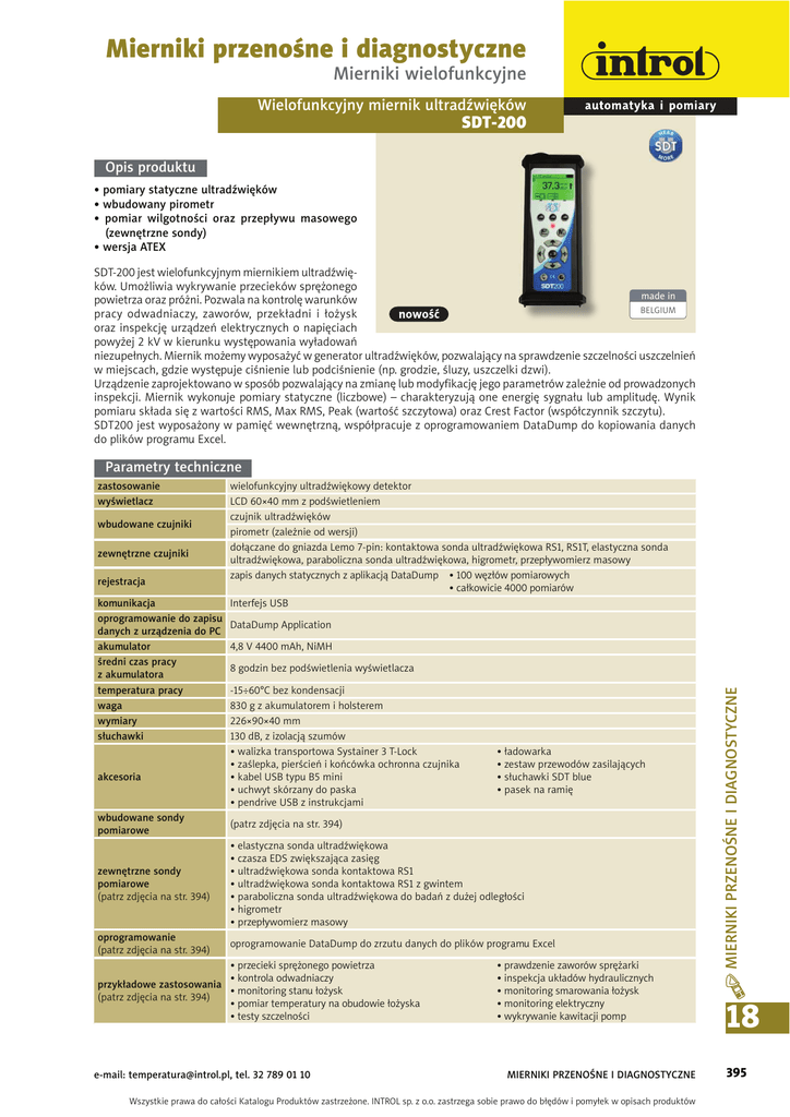 Mierniki przenośne i diagnostyczne Mierniki wielofunkcyjne Wielofunkcyjny miernik ultradźwięków SDT-200 Opis produktu • pomiary statyczne ultradźwięków • wbudowany pirometr • pomiar wilgotności oraz przepływu masowego (zewnętrzne sondy) • wersja ATEX SDT-200 jest wielofunkcyjnym miernikiem ultradźwięków. Umożliwia wykrywanie przecieków sprężonego made in powietrza oraz próżni. Pozwala na kontrolę warunków BELGIUM pracy odwadniaczy, zaworów, przekładni i łożysk oraz inspekcję urządzeń elektrycznych o napięciach powyżej 2 kV w kierunku występowania wyładowań niezupełnych. Miernik możemy wyposażyć w generator ultradźwięków, pozwalający na sprawdzenie szczelności uszczelnień w miejscach, gdzie występuje ciśnienie lub podciśnienie (np. grodzie, śluzy, uszczelki dzwi). Urządzenie zaprojektowano w sposób pozwalający na zmianę lub modyfikację jego parametrów zależnie od prowadzonych inspekcji. Miernik wykonuje pomiary statyczne (liczbowe) – charakteryzują one energię sygnału lub amplitudę. Wynik pomiaru składa się z wartości RMS, Max RMS, Peak (wartość szczytowa) oraz Crest Factor (współczynnik szczytu). SDT200 jest wyposażony w pamięć wewnętrzną, współpracuje z oprogramowaniem DataDump do kopiowania danych do plików programu Excel. Parametry techniczne wbudowane czujniki zewnętrzne czujniki rejestracja komunikacja oprogramowanie do zapisu danych z urządzenia do PC akumulator średni czas pracy z akumulatora temperatura pracy waga wymiary słuchawki akcesoria wielofunkcyjny ultradźwiękowy detektor LCD 60×40 mm z podświetleniem czujnik ultradźwięków pirometr (zależnie od wersji) dołączane do gniazda Lemo 7-pin: kontaktowa sonda ultradźwiękowa RS1, RS1T, elastyczna sonda ultradźwiękowa, paraboliczna sonda ultradźwiękowa, higrometr, przepływomierz masowy zapis danych statycznych z aplikacją DataDump • 100 węzłów pomiarowych • całkowicie 4000 pomiarów Interfejs USB DataDump Application 4,8 V 4400 mAh, NiMH 8 godzin bez podświetlenia wyświetlacza -15÷60°C bez kondensacji 830 g z akumulatorem i holsterem 226×90×40 mm 130 dB, z izolacją szumów • walizka transportowa Systainer 3 T-Lock • zaślepka, pierścień i końcówka ochronna czujnika • kabel USB typu B5 mini • uchwyt skórzany do paska • pendrive USB z instrukcjami • ładowarka • zestaw przewodów zasilających • słuchawki SDT blue • pasek na ramię wbudowane sondy pomiarowe (patrz zdjęcia na str. 394) zewnętrzne sondy pomiarowe (patrz zdjęcia na str. 394) • elastyczna sonda ultradźwiękowa • czasza EDS zwiększająca zasięg • ultradźwiękowa sonda kontaktowa RS1 • ultradźwiękowa sonda kontaktowa RS1 z gwintem • paraboliczna sonda ultradźwiękowa do badań z dużej odległości • higrometr • przepływomierz masowy oprogramowanie (patrz zdjęcia na str. 394) oprogramowanie DataDump do zrzutu danych do plików programu Excel • przecieki sprężonego powietrza • kontrola odwadniaczy przykładowe zastosowania • monitoring stanu łożysk (patrz zdjęcia na str. 394) • pomiar temperatury na obudowie łożyska • testy szczelności e-mail: [email protected], tel. 32 789 01 10 • prawdzenie zaworów sprężarki • inspekcja układów hydraulicznych • monitoring smarowania łożysk • monitoring elektryczny • wykrywanie kawitacji pomp MIERNIKI PRZENOŚNE I DIAGNOSTYCZNE Wszystkie prawa do całości Katalogu Produktów zastrzeżone. INTROL sp. z o.o. zastrzega sobie prawo do błędów i pomyłek w opisach produktów MIERNIKI PRZENOŚNE I DIAGNOSTYCZNE zastosowanie wyświetlacz 18 395