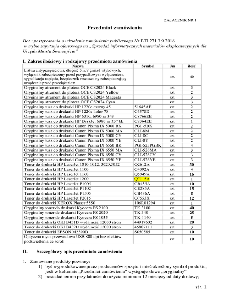 ZAŁĄCZNIK NR 1 Przedmiot zamówienia Dot.: postępowania o udzielenie zamówienia publicznego Nr BTI.271.3.9.2016 w trybie zapytania ofertowego na „Sprzedaż informatycznych materiałów eksploatacyjnych dla Urzędu Miasta Świnoujście” I. Zakres ilościowy i rodzajowy przedmiotu zamówienia Nazwa Listwa antyprzepięciowa, długość 5m, 8 gniazd wtykowych, wyłącznik zabezpieczony przed przypadkowym wyłączeniem, sygnalizacja napięcia, bezpiecznik resetowalny zabezpieczający urządzenie przed przeciążeniem Oryginalny atrament do plotera OCE CS2024 Black Oryginalny atrament do plotera OCE CS2024 Yellow Oryginalny atrament do plotera OCE CS2024 Magenta Oryginalny atrament do plotera OCE CS2024 Cyan Oryginalny tusz do drukarki HP 1220c czarny 45 Oryginalny tusz do drukarki HP 1220c kolor 78 Oryginalny tusz do drukarki HP 6310, 6980 nr 343 Oryginalny tusz do drukarki HP DeskJet 6980 nr 337 bk Oryginalny tusz do drukarki Canon Pixma IX 5000 BK Oryginalny tusz do drukarki Canon Pixma IX 5000 MA Oryginalny tusz do drukarki Canon Pixma IX 5000 CY Oryginalny tusz do drukarki Canon Pixma IX 5000 YE Oryginalny tusz do drukarki Canon Pixma IX 6550 BK Oryginalny tusz do drukarki Canon Pixma IX 6550 MA Oryginalny tusz do drukarki Canon Pixma IX 6550 CY Oryginalny tusz do drukarki Canon Pixma IX 6550 YE Toner do drukarki HP LaserJet 1010-1022, 3020,3052 Toner do drukarki HP LaserJet 1100 Toner do drukarki HP LaserJet 1160 Toner do drukarki HP LaserJet 1200 Toner do drukarki HP LaserJet P1005 Toner do drukarki HP LaserJet P1102 Toner do drukarki HP LaserJet P1505 Toner do drukarki HP LaserJet P2015 Toner do drukarki XEROX Phaser 5550 Oryginalny toner do drukarki Kyocera FS 2100 Oryginalny toner do drukarki Kyocera FS 2020 Oryginalny toner do drukarki Kyocera FS 1035 Toner do drukarki OKI B431D wydajność 12000 stron Toner do drukarki OKI B432D wydajność 12000 stron Toner do drukarki EPSON M2300D Optyczna mysz przewodowa USB 800 dpi bez efektów podświetlenia ze scroll II. Symbol 51645AE C6578D C8766EE C9364EE PGI -5BK CLI-8M CLI-8C CLI-8Y PGI-525PGBK CLI-526MA CLI-526CY CLI-526YE Q2612A C4092A Q5949A Q7115A CB435A CE285A CB436A Q7553X 106R01294 TK 3100 TK 340 TK-1140 44917602 45807111 S050585 Jm ilość szt. 40 szt. szt. szt. szt. szt. szt. szt. szt. szt. szt. szt. szt. szt. szt. szt. szt. szt. szt. szt. szt. szt. szt. szt. szt. szt. szt. szt. szt. szt. szt. szt. 3 2 3 3 2 2 2 1 2 2 2 2 4 3 3 3 30 4 16 1 10 15 8 12 1 40 25 5 20 3 10 szt. 10 Szczegółowy opis przedmiotu zamówienia 1. Zamawiane produkty powinny: 1) być wyprodukowane przez producentów sprzętu i mieć określony symbol produktu, jeśli w kolumnie „Przedmiot zamówienia” występuje słowo „oryginalny” 2) posiadać termin przydatności do użycia minimum 12 miesięcy od daty dostawy; str. 1 2. 3. 4. 5. 6. 3) być fabrycznie nowe, wyprodukowane, pełnowartościowe, nie poddane procesowi ponownego napełniania; 4) w przypadku materiałów drukujących uwzględniać i nie naruszać patentów producentów urządzeń; 5) zawierać informacje o produkcie – znak firmowy producenta, etykiety zawierające numer katalogowy i termin jego ważności, na opakowaniu bądź przedstawić oświadczenia producenta wyrobu; 6) spełniać wymogi jakościowe nie gorsze niż materiały oryginalne producenta urządzenia; 7) w przypadku materiałów drukujących być produkowane co najmniej w standardzie wdrożonych norm jakościowych i ochrony środowiska: ISO 9001:2000, ISO 14001:2004; 8) dobrze współdziałać z urządzeniami, na które producent sprzętu udzielił gwarancji, tzn. odpowiadać parametrom techniczno-eksploatacyjnym zgodnie z wymogami producenta tych urządzeń; 9) w przypadku oferowanych produktów równoważnych, mieć gwarancję producenta, że oferowane produkty nie spowodują utraty uprawnień do gwarancji urządzeń; 10) zawierać zapewnienie, że wykonawca zapewni naprawę urządzenia drukującego w przypadku użycia dostarczonego przez siebie wadliwego wkładu, na podstawie pisemnej opinii serwisu urządzeń; 11) dawać nienaganną jakość zapisu/odczytu w przypadku nośników lub wydruku w odniesieniu do tonerów; 12) mieć co najmniej takie same maksymalne wydajności drukowania jak oryginały i być testowane międzynarodowymi standardami pomiaru wydajności ISO/IEC 19752 dla laserowych materiałów drukujących i ISO 24711 dla wkładów atramentowych. Wykonawca oferujący produkty zamienne inne niż oryginalne obowiązany jest wykazać w złożonym załączniku cenowym do umowy dokumenty potwierdzające pomiary wydajności według powyższych norm; 13) w przypadku, kiedy produkt oryginalny posiada wbudowany układ scalony, który monitoruje proces druku i zużycie atramentu/tonera, produkt równoważny winien posiadać analogiczny element; 14) posiadać gwarancję, która umożliwia natychmiastową wymianę uszkodzonego produktu na nowy 1 do 1 na koszt Wykonawcy zamówienia. Jako załącznik do oferty Wykonawca musi przedłożyć: 1) odpowiednie certyfikaty jakości i ochrony środowiska producentów oferowanych materiałów drukujących; 2) specyfikację wartościową wraz z opisem producenta poszczególnych materiałów. Zamawiający zastrzega sobie prawo wymiany produktów bez zmiany ceny na oryginalne producenta urządzeń lub innego producenta w przypadku, gdy produkt proponowany w ofercie nie spełnia norm jakościowych wydruku lub zapisu, a ilość wadliwych jakościowo produktów zgłoszonych przez Zamawiającego w czasie realizacji umowy przekroczy 20% danego asortymentu z przedmiotu zamówienia. W ramach przedmiotu zamówienia i wartości umowy Zamawiający może dokonać zmian ilościowych w asortymencie stosownie do faktycznych potrzeb, przy zachowaniu cen jednostkowych podanych w ofercie. Zamawiający zastrzega sobie dostawy produktów w ciągu 5 dni od dnia złożenia przez niego zamówienia, w godzinach od 8:00 do 15:00 w dni robocze. Dostawa oraz reklamacje tonerów realizowane są za po