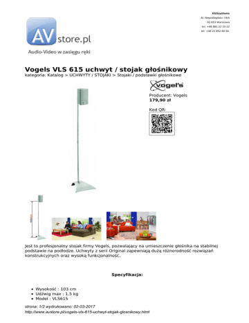 DSSsystems Al. Niepodległości 19/4 02-653 Warszawa tel. +48 881 22 33 22 tel. +48 22 852 00 50 Vogels VLS 615 uchwyt / stojak głośnikowy kategoria: Katalog > UCHWYTY / STOJAKI > Stojaki / podstawki głośnikowe Producent: Vogels 179,90 zł Kod QR: Jest to profesjonalny stojak firmy Vogels, pozwalający na umieszczenie głośnika na stabilnej podstawie na podłodze. Uchwyty z serii Original zapewniają dużą różnorodność rozwiązań konstrukcyjnych oraz wysoką funkcjonalność. Specyfikacja: Wysokość : 103 cm Udźwig max : 1,5 kg Model : VLS615 strona: 1/2 wydrukowano: 02-03-2017 http://www.avstore.pl/vogels-vls-615-uchwyt-stojak-glosnikowy.html Seria: Original Kolor : srebrny Schowek na kable. Gumowe nóżki. Gwarantuje stabilną pozycję głośnika. Bezpieczna konstrukcja odporna na wstrząsy. Szeroka funkcjonalność. Pięć lat gwarancji. Łatwy montaż. Uchwyty z serii Original charakteryzują się bardzo dużą elastycznością dzięki czemu zapewniają wysoki poziom komfortu podczas odsłuchu dźwięku. Stojak ten umożliwia praktyczne wykorzystanie wolnej przestrzeni podłogowej, przy jego pomocy ustawisz głośniki w najbardziej dogodnych dla siebie miejscach. Stojak dostępny w kolorze srebrnym. Schowek na przewody rozwiąże problem ich widoczności. Gumowe nóżki zapewnią bezpieczeństwo dla Twojej podłogi. Praktyczne rozwiązania oraz nowoczesny i stylowy design sprawiają, że seria Original cieszy się rosnącym powodzeniem wśród nabywców. Jest to oryginalny produkt marki Vogels, pochodzący bezpośrednio od polskiego dystrybutora. Wszystkie podane ceny (zawierają podatek VAT 23%). Klientów zainteresowanych większymi zakupami lub współpracą prosimy o kontakt: (22) 852 00 50, lub [email protected] Wszystkie loga oraz znaki firmowe wykorzystane w opisach na stronie AVstore.pl . należą do ich prawnych właścicieli i mają wyłącznie charakter informacyjny strona: 2/2 wydrukowano: 02-03-2017 http://www.avstore.pl/vogels-vls-615-uchwyt-stojak-glosnikowy.html