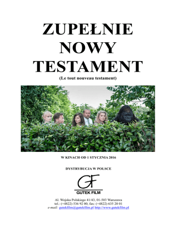 ZUPEŁNIE NOWY TESTAMENT (Le tout nouveau testament) W KINACH OD 1 STYCZNIA 2016 DYSTRYBUCJA W POLSCE Al. Wojska Polskiego 41/43, 01-503 Warszawa tel.: (+4822) 536 92 00, fax: (+4822) 635 20 01 e-mail: [email protected] http://www.gutekfilm.pl ZUPEŁNIE NOWY TESTAMENT LE TOUT NOUVEAU TESTAMENT Reżyseria Jaco Van Dormael Scenariusz Jaco Van Dormael Thomas Gunzig Zdjęcia Christophe Beaucarne Montaż Hervé de Luze Scenografia Sylvie Olivé Kostiumy Caroline Coener Muzyka An Pierlé W rolach głównych: Pili Groyne Benoît Poelvoorde Catherine Deneuve François Damiens Yolande Moreau Laura Verlinden Ea Bóg Martine François Żona Boga Aurélie Serge Larivière Didier De Neck Marco Lorenzini Romain Gelin Marc Jean-Claude Victor Willy Producent Terra Incognita Films Jaco Van Dormael Belgia / Francja / Luksemburg rok produkcji: 2015 czas trwania: 113 min 35 mm – Dolby Digital Kolor OPIS FILMU Gdzie mieszka Pan Bóg? W Brukseli. Z rodziną, którą tyranizuje. Największą przyjemność sprawia mu bezmyślne oglądanie telewizji, dokuczanie żonie i wymyślanie praw, które coraz bardziej komplikują ludziom życie. Do czasu. Jego córka Ea nie może go już znieść i postanawia się zbuntować. Wykrada ojcu z komputera hasła i wszystkie tajemnice, dzięki którym będzie mogła urządzić świat zupełnie od nowa. „Zupełnie Nowy Testament” to komedia w reżyserii Jaco Van Dormaela („Mr. Nobody”, „Ósmy dzień”) z Benoît Poelvoorde („Nic do oclenia”), Yolande Moreau („Serafina”) i Catherine Deneuve w rolach głównych. GŁOSY PRASY Świetnie nakręcony, cudownie zagrany i bardzo zabawny. The Playlist Pod względem humoru – smoliście czarnego, jednocześnie zawoalowanego i bardzo bezpośredniego – film twórcy „Ósmego dnia” przypomina zeszłoroczne „Dzikie historie”. Ma też wszelkie dane ku temu, by stać się równie wielkim hitem. T-Mobile Trendy „Zupełnie Nowy Testament” jest efektownym poradnikiem samoakceptacji, „Biblią dla opornych”, niezłą komedią i przyzwoitą tragedią. Filmweb.pl Religijnie niepoprawny, ale oryginalny i niesamowicie zabawny. The Hollywood Reporter Van Dormael utrzymuje napięcie przez cały trwania filmu i daje popis wizualnej wyobraźni. The Guardian Van Dormael jest równie bluźnierczy, co animacje Terry’ego Gilliama do „Latającego cyrku Monty Pythona”, w których z nieba spadała wielka boska stopa. Variety Zaskakująca uniwersalność [filmu] wynika z poruszania najbardziej aktualnych spraw: komunikacji międzyludzkiej, ceny sacrum w codzienności, czy wartości tego, co nierealne. Onet.pl „Realizm magiczny” to termin używany do opisu historii, które dzieją się w prawdziwym świecie, ale występują w nich elementy fantastyczne. Natomiast „Zupełnie Nowy Testament” to „magiczny realizm”. Nerd Report WYWIAD z REŻYSEREM Od czego zaczęła się praca nad „Zupełnie Nowym Testamentem”? Od pomysłu mojego i Thomasa Gunziga, że Bóg żyje i mieszka w Brukseli. A co jeśli jest draniem? W dodatku oprócz syna ma także córkę, o której nikt nie wie? I co, jeśli ma ona 10 lat i jest tak wściekła na ojca, że postanawia się zemścić, ujawniając przy pomocy SMS-ów jeden z jego najbardziej strzeżonych sekretów – daty śmieci wszystkich ludzi? To dawało nam szansę, by wszystkie odniesienia do religii uczynić częścią surrealistycznej baśni. Nie jestem wierzący, ale wychowywałem się wśród katolików, religie interesują mnie tak samo, jak ciekawe historie. Pamiętam, że w dzieciństwie zastanawiałem się, dlaczego Bóg nie zrobił niczego, kiedy jego syn był krzyżowany? Dlaczego nie robi niczego, kiedy dzieci umierają na białaczkę? Dlaczego ludzi ratuje Batman, a nie Bóg? Bóg w „Zupełnie Nowym Testamencie” jest postacią nikczemną. Sprawia mu przyjemność strącanie samolotów, wywoływanie pożarów, rzeź orangutanów i codzienne nękanie ludzkości, podburzanie jej do zabijania się nawzajem w jego imię. Nie różni się zatem od jego opisów, które znajdziemy w Biblii. Ileż w tej książce jest zabijania! Całe wioski są palone i zrównywane z ziemią. Ludzie są karani i zdradzani, a Bóg nazywany „zazdrosnym”. To dlatego chcieliście zmienić reguły? Ea, siostra Jezusa, która nazywa go JC, sprawia, że świat jest trochę lepszy, zmieniając życie kilku niezwykłych nieszczęśników. Ma tylko 10 lat i w przeciwieństwie do swojego brata potrafi dokonywać tylko mało znaczących cudów. Ale pomimo to udaje jej się pozyskać sześciu nowych apostołów – kobietę o jednym ramieniu, seksualnego maniaka, zabójcę, kobietę którą zostawił mąż, pracownika biurowego i dziecko – a wszyscy oni zakochują się w bardzo nieoczywistych kandydatach. To komediowy sposób, żeby powiedzieć „Niebo jest tu i teraz, nie po śmierci. Nasze życie nie trwa długo. Cieszmy się nim i róbmy to, co sprawia nam przyjemność”. Skąd decyzja, by do dwunastu apostołów z „Nowego Testamentu” dodać sześciu nowych, którzy zbiorą się, gdy czas będzie zbliżał się do końca? Liczba dwanaście nawiązywała przecież do dwunastu plemion Izraela. W moim filmie Bóg lubi hokeja, hokejowa drużyna to dwunastu zawodników. Jego żona natomiast jest fanką baseballu, w którym zespół składa się z 18 graczy. Ich synowi, Jezusowi, wydaje się, że dwunastu apostołów to za mało, więc namawia siostrę, by znalazła sześciu kolejnych. 18 to w końcu ulubiona liczba ich matki. Widzowie na końcu filmu zrozumieją dlaczego. Film ma też prawie identyczną strukturę co „Nowy Testament”. Ten film ma formę baśni. Ktoś, kto nie został wychowany w żadnej konkretnej wierze, nie będzie miał problemów z traktowaniem go podobnie jak „Czerwonego kapturka”, czy „Alicji w krainie czarów”. Są to opowieści wpisane w naszą zbiorową pamięć. Tunel, który łączy mieszkanie Boga z pralnią, jest wręcz typowy dla podobnych histo