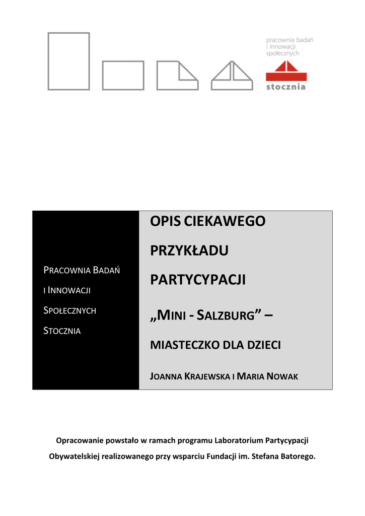 OPIS CIEKAWEGO PRZYKŁADU PRACOWNIA BADAŃ I INNOWACJI SPOŁECZNYCH PARTYCYPACJI „MINI - SALZBURG” – STOCZNIA MIASTECZKO DLA DZIECI JOANNA KRAJEWSKA I MARIA NOWAK Opracowanie powstało w ramach programu Laboratorium Partycypacji Obywatelskiej realizowanego przy wsparciu Fundacji im. Stefana Batorego. W SKRÓCIE Organizator: Stowarzyszenie Spectrum Kontakt: Petra Burgstaller [email protected], Stowarzyszenie Spectrum Czas trwania: od 2002 Co się działo: W ramach projektu wymyślono i stworzono „miasteczko” w centrum Salzburga, do którego raz w roku zapraszane są dzieci na 3-tygodniowy obóz. Miasteczko ma za zadanie odwzorowywać prawdziwe miasto, z jego funkcjami i instytucjami. Dzieci wcielają się w mieszkańców, muszą pracować, zarabiać pieniądze, chodzą do teatru, rozstrzygają sprawy w sądzie i opracowują modele działania miejskich instytucji. Metoda: uczenie się roli społecznych poprzez wcielanie się w mieszkańców stworzonego miasteczka Przydatna do: uczenia dzieci demokracji obywatelskiej, współdziałania odpowiedzialności. Przydatna także do projektowania instytucji publicznych. 2 i HISTORIA Salzburg jest 150-tys. miastem, położonym w centralnej części Austrii, w dolinie Alp. Przed rozpoczęciem programu, na przełomie 2002 i 2003 roku, dużym problemem, z którym borykały się władze miasta, był brak ciekawych ofert dla dzieci i pomysłów jak młodzi mogliby spędzać czas wolny - zwłaszcza podczas wakacji. W tamtym czasie w mieście działało Stowarzyszenie Spectrum. Dla jego założycieli: Thomasa Schustera i Petry Burgstaller głównym celem działalności było zebranie doświadczeń na temat pracy z dziećmi i wzmacnianie ich wiedzy obywatelskiej. Chcieli tę wiedzę zdobyć w sposób nowatorski, wykorzystując jednocześnie elementy zabawy i prawdziwego dorosłego życia. Działania projektu miały obejmować rozmaite dziedziny: media, sport, ochronę środowiska, muzykę, teatr czy zdrowie. Tak zrodził się pomysł na „Mini Salzburg”, czyli trwający kilka tygodni obóz dla dzieci łączący w sobie wszystkie powyższe zagadnienia. Ideą było stworzenie przestrzeni do podejmowania przez dzieci i młodzież działań partycypacyjnych. Przestrzeni, w której mogłyby eksperymentować, decydować i poszukiwać nowych rozwiązań. Dodatkowo, dzieci miałyby nauczyć się uczestnictwa w życiu publicznym by mieć głos i „być widocznym”. Ostatecznie, projekt po raz pierwszy udało się zainicjować w 2003 roku. Od tego czasu, co roku na trzy wakacyjne tygodnie (od końca czerwca do połowy lipca) gromadzi ponad 5000 młodych ludzi pomiędzy 9 a 14 lat rokiem życia. Miasteczko zlokalizowane jest na obszarze areny (Eisarena Salzburg) i Ogrodu Ludowego w pobliżu Starego Miasta w Salzburgu. PRZEBIEG Powtarzany co roku od 2002 roku proces składa się z kilku faz. Pierwszą, trwającą od jesieni do zimy, jest faza planowania. Podczas niej opracowywane są główne treści planowanego na następny rok obozu, określane są potrzeby kadrowe oraz przygotowywany budżet. Następnie, na wiosnę rozpoczyna się intensywna faza przygotowawcza. Opracowywane są szczegółowe koncepcje działań, poszukiwani są pracownicy i sponsorzy, trwa praca nad otrzymaniem odpowiednich zezwoleń, tworzone są strategie dotyczące sfery informowania opinii publicznej i promowania wydarzenia. W lecie, budowane jest miasteczko, trwają 3 kampanie informacyjne, potem następują trzy tygodnie trwania obozu. Po każdym z nich, organizatorzy ewaluują projekt – wyszukując słabych i mocnych stron, zmieniając koncepcje, doprecyzowując założenia. Poza trwaniem wydarzenia, w wielu fazach (przygotowanie, public relations, promocja, przygotowanie prezentacji) biorą udział dzieci. Podczas trzech tygodni trwania obozu, ilość dzieci ulega zmianom. Średnio, codziennie jest ich ok. 1500, jednak całościowo liczba młodych uczestników przekracza 6000. Projekt wspierany jest przez zespół Stowarzyszenia Spectrum (10 osób) oraz ok. 70 osób, które współpracują podczas konkretnych edycji wydarzenia. IDEA I PODSTAWOWE FUNKCJE MIASTECZKA W miasteczku „Mini – Salzburg” wszystko działa jak w prawdziwym mieście, z wyjątkiem tego, że jest zarządzane i obsługiwane wyłącznie przez dzieci. Głównym celem projektu jest czynny udział młodych osób w procesach partycypacji, a tym samym uczenie się podstawowych zasad demokracji. Dzieci konfrontowane są z sytuacjami z dorosłego życia: studiowaniem, zarabianiem pieniędzy, poszukiwaniem pracy, płaceniem podatków. Mogą przy tym podczas jednego pobytu przyjmować różne role. Zdjęcie 1. Widok na fragment miasteczka 1 1 Wszystkie zdjęcia pochodzą ze strony: http://minisalzburg.spektrum.at/fotos/nggallery/mini-salzburg/best-of2011/ 4 W miasteczku znajduje się 55 stacji - oddziałów, które przez cały okres trwania obozu oferują dzieciom ok. 600 miejsc pracy i punktów do nauki w różnych obszarach. Miasteczko zostało przemyślane pod kątem różnych dostępnych dorosłym obywatelom instytucji i życiowych czynności: 1. Administracja W „Mini - Salzburgu” działają organy i urzędy użyteczności publicznej: ratusz, władze miasta, biuro kultury, służby zatrudnienia, pośrednictwo pracy i biuro ochrony środowiska. Utworzono dla dobra obywateli centra usług, np. biuro informacji, bank oraz miejscowy sąd rozstrzygający spory. Życie w miasteczku opiera się na regułach, które mogą być uzupełnione lub zmienione przez obywateli w drodze decyzji większością głosów w tzw. zgromadzeniu obywatelskim. Aby uzyskać pełne obywatelstwo należy pracować 6 godzin i podjąć 2 godziny nauki. Warunkiem zezwolenia na prowadzenie działalności, założenie firmy, czy utworzenie konta oszczędnościowego jest posiadanie pełnego obywatelstwa. 2. Edukacja Ważne miejsce zajmuje edukacja, nauka i technologie. Dzieci w miasteczku mogą studiować na Uniwersytecie. Mają możliwo