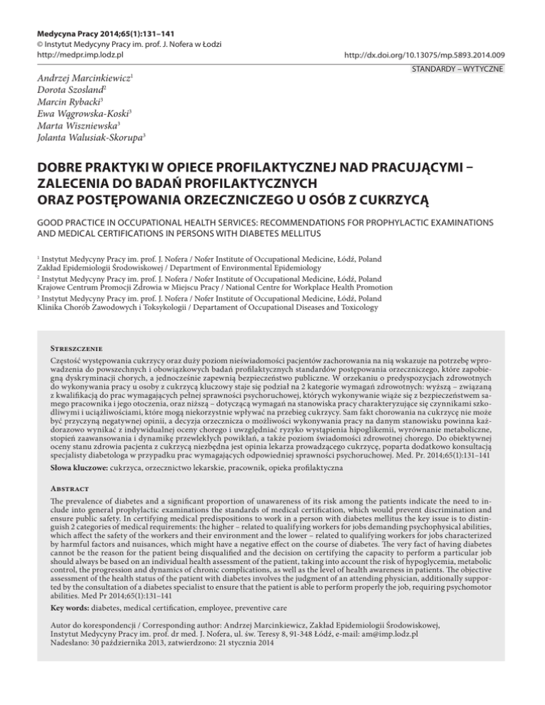 Medycyna Pracy 2014;65(1):131–141 © Instytut Medycyny Pracy im. prof. J. Nofera w Łodzi http://medpr.imp.lodz.pl http://dx.doi.org/10.13075/mp.5893.2014.009 Andrzej Marcinkiewicz1 Dorota Szosland2 Marcin Rybacki3 Ewa Wągrowska-Koski3 Marta Wiszniewska3 Jolanta Walusiak-Skorupa3 STANDARDY – WYTYCZNE Dobre praktyki w opiece profilaktycznej nad pracującymi – Zalecenia do badań profilaktycznych oraz postępowania orzeczniczego u osób z cukrzycą Good practice in occupational health services: Recommendations for prophylactic examinations and medical certifications in Persons with diabetes mellitus Instytut Medycyny Pracy im. prof. J. Nofera / Nofer Institute of Occupational Medicine, Łódź, Poland Zakład Epidemiologii Środowiskowej / Department of Environmental Epidemiology 2 Instytut Medycyny Pracy im. prof. J. Nofera / Nofer Institute of Occupational Medicine, Łódź, Poland Krajowe Centrum Promocji Zdrowia w Miejscu Pracy / National Centre for Workplace Health Promotion 3 Instytut Medycyny Pracy im. prof. J. Nofera / Nofer Institute of Occupational Medicine, Łódź, Poland Klinika Chorób Zawodowych i Toksykologii / Departament of Occupational Diseases and Toxicology 1 Streszczenie Częstość występowania cukrzycy oraz duży poziom nieświadomości pacjentów zachorowania na nią wskazuje na potrzebę wprowadzenia do powszechnych i obowiązkowych badań profilaktycznych standardów postępowania orzeczniczego, które zapobiegną dyskryminacji chorych, a jednocześnie zapewnią bezpieczeństwo publiczne. W orzekaniu o predyspozycjach zdrowotnych do wykonywania pracy u osoby z cukrzycą kluczowy staje się podział na 2 kategorie wymagań zdrowotnych: wyższą – związaną z kwalifikacją do prac wymagających pełnej sprawności psychoruchowej, których wykonywanie wiąże się z bezpieczeństwem samego pracownika i jego otoczenia, oraz niższą – dotyczącą wymagań na stanowiska pracy charakteryzujące się czynnikami szkodliwymi i uciążliwościami, które mogą niekorzystnie wpływać na przebieg cukrzycy. Sam fakt chorowania na cukrzycę nie może być przyczyną negatywnej opinii, a decyzja orzecznicza o możliwości wykonywania pracy na danym stanowisku powinna każdorazowo wynikać z indywidualnej oceny chorego i uwzględniać ryzyko wystąpienia hipoglikemii, wyrównanie metaboliczne, stopień zaawansowania i dynamikę przewlekłych powikłań, a także poziom świadomości zdrowotnej chorego. Do obiektywnej oceny stanu zdrowia pacjenta z cukrzycą niezbędna jest opinia lekarza prowadzącego cukrzycę, poparta dodatkowo konsultacją specjalisty diabetologa w przypadku prac wymagających odpowiedniej sprawności psychoruchowej. Med. Pr. 2014;65(1):131–141 Słowa kluczowe: cukrzyca, orzecznictwo lekarskie, pracownik, opieka profilaktyczna Abstract The prevalence of diabetes and a significant proportion of unawareness of its risk among the patients indicate the need to include into general prophylactic examinations the standards of medical certification, which would prevent discrimination and ensure public safety. In certifying medical predispositions to work in a person with diabetes mellitus the key issue is to distinguish 2 categories of medical requirements: the higher – related to qualifying workers for jobs demanding psychophysical abilities, which affect the safety of the workers and their environment and the lower – related to qualifying workers for jobs characterized by harmful factors and nuisances, which might have a negative effect on the course of diabetes. The very fact of having diabetes cannot be the reason for the patient being disqualified and the decision on certifying the capacity to perform a particular job should always be based on an individual health assessment of the patient, taking into account the risk of hypoglycemia, metabolic control, the progression and dynamics of chronic complications, as well as the level of health awareness in patients. The objective assessment of the health status of the patient with diabetes involves the judgment of an attending physician, additionally supported by the consultation of a diabetes specialist to ensure that the patient is able to perform properly the job, requiring psychomotor abilities. Med Pr 2014;65(1):131–141 Key words: diabetes, medical certification, employee, preventive care Autor do korespondencji / Corresponding author: Andrzej Marcinkiewicz, Zakład Epidemiologii Środowiskowej, Instytut Medycyny Pracy im. prof. dr med. J. Nofera, ul. św. Teresy 8, 91-348 Łódź, e-mail: [email protected] Nadesłano: 30 października 2013, zatwierdzono: 21 stycznia 2014 132 A. Marcinkiewicz i wsp. WSTĘP We „Wskazówkach metodycznych w sprawie przeprowadzania badań profilaktycznych pracowników” – stanowiących załącznik nr 1 do Rozporządzenia Ministra Zdrowia i Opieki Społecznej z dnia 30 maja 1996 r. w sprawie przeprowadzenia badań lekarskich pracowników, zakresu profilaktycznej opieki zdrowotnej nad pracownikami oraz orzeczeń lekarskich wydawanych do celów przewidzianych w Kodeksie pracy (1) – konieczność oznaczania glikemii w ramach pomocniczych badań wstępnych i okresowych wskazano jedynie w przypadku narażenia na pestycydy – związki kwasu dwuchlorofenoksy-octowego (np. dichlorprop, mekoprop). Znacznie szerzej problem diagnostyki cukrzycy został potraktowany w Rozporządzeniu Ministra Zdrowia z dnia 7 stycznia 2004 r. w sprawie badań lekarskich kierowców i osób ubiegających się o uprawnienia do kierowania pojazdami (2). Zawarte w tym rozporządzeniu standardy określiły sposób postępowania orzeczniczego wobec osób chorujących na cukrzycę i kierujących pojazdami w ramach obowiązków zawodowych: n zatrudnionych na stanowisku kierowcy wykonującego przewóz drogowy, w oparciu o przepisy Ustawy z dnia 6 września 2001 r. o transporcie drogowym (3), n zatrudnionych na stanowisku kierowcy, niepodlegających przepisom Ustawy z dnia 6 września 2001 r. 
