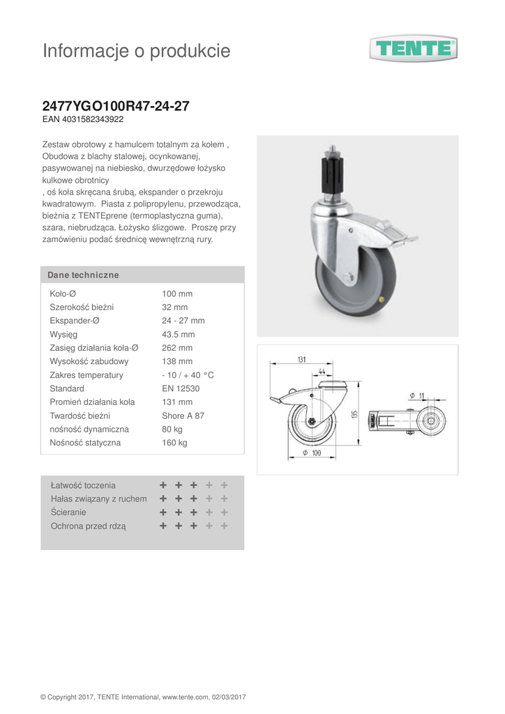 Informacje o produkcie 2477YGO100R47-24-27 EAN 4031582343922 Zestaw obrotowy z hamulcem totalnym za kołem , Obudowa z blachy stalowej, ocynkowanej, pasywowanej na niebiesko, dwurzędowe łożysko kulkowe obrotnicy , oś koła skręcana śrubą, ekspander o przekroju kwadratowym. Piasta z polipropylenu, przewodząca, bieżnia z TENTEprene (termoplastyczna guma), szara, niebrudząca. Łożysko ślizgowe. Proszę przy zamówieniu podać średnicę wewnętrzną rury. Dane techniczne Koło-Ø 100 mm Ekspander-Ø 24 - 27 mm Szerokość bieżni Wysięg Zasięg działania koła-Ø Wysokość zabudowy Zakres temperatury Standard Promień działania koła Twardość bieżni nośność dynamiczna Nośność statyczna Łatwość toczenia Hałas związany z ruchem Ścieranie Ochrona przed rdzą 32 mm 43.5 mm 262 mm 138 mm - 10 / + 40 °C EN 12530 131 mm Shore A 87 80 kg 160 kg + + + + + + + + + + + + + + + + + + + + © Copyright 2017, TENTE International, www.tente.com, 02/03/2017 Informacje o produkcie 2477YGO100R47-24-27 EAN 4031582343922 © Copyright 2017, TENTE International, www.tente.com, 02/03/2017