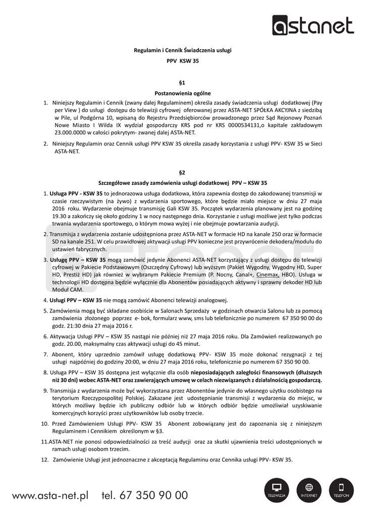 Regulamin i Cennik Świadczenia usługi PPV KSW 35 §1 Postanowienia ogólne 1. Niniejszy Regulamin i Cennik (zwany dalej Regulaminem) określa zasady świadczenia usługi dodatkowej (Pay per View ) do usługi dostępu do telewizji cyfrowej oferowanej przez ASTA-NET SPÓŁKA AKCYJNA z siedzibą w Pile, ul Podgórna 10, wpisaną do Rejestru Przedsiębiorców prowadzonego przez Sąd Rejonowy Poznań Nowe Miasto I Wilda IX wydział gospodarczy KRS pod nr KRS 0000534131,o kapitale zakładowym 23.000.0000 w całości pokrytym- zwanej dalej ASTA-NET. 2. Niniejszy Regulamin oraz Cennik usługi PPV KSW 35 określa zasady korzystania z usługi PPV- KSW 35 w Sieci ASTA-NET. §2 Szczegółowe zasady zamówienia usługi dodatkowej PPV – KSW 35 1. Usługa PPV - KSW 35 to jednorazowa usługa dodatkowa, która zapewnia dostęp do zakodowanej transmisji w czasie rzeczywistym (na żywo) z wydarzenia sportowego, które będzie miało miejsce w dniu 27 maja 2016 roku. Wydarzenie obejmuje transmisję Gali KSW 35. Początek wydarzenia planowany jest na godzinę 19.30 a zakończy się około godziny 1 w nocy następnego dnia. Korzystanie z usługi możliwe jest tylko podczas trwania wydarzenia sportowego, o którym mowa wyżej i nie obejmuje powtarzania audycji. 2. Transmisja z wydarzenia zostanie udostępniona przez ASTA-NET w formacie HD na kanale 250 oraz w formacie SD na kanale 251. W celu prawidłowej aktywacji usługi PPV konieczne jest przywrócenie dekodera/modułu do ustawień fabrycznych. 3. Usługę PPV – KSW 35 mogą zamówić jedynie Abonenci ASTA-NET korzystający z usługi dostępu do telewizji cyfrowej w Pakiecie Podstawowym (Oszczędny Cyfrowy) lub wyższym (Pakiet Wygodny, Wygodny HD, Super HD, Prestiż HD) jak również w wybranym Pakiecie Premium (P. Nocny, Canal+, Cinemax, HBO). Usługa w technologii HD dostępna będzie wyłącznie dla Abonentów posiadających aktywny i sprawny dekoder HD lub Moduł CAM. 4. Usługi PPV – KSW 35 nie mogą zamówić Abonenci telewizji analogowej. 5. Zamówienia mogą być składane osobiście w Salonach Sprzedaży w godzinach otwarcia Salonu lub za pomocą zamówienia złożonego poprzez e- bok, formularz www, sms lub telefonicznie po numerem 67 350 90 00 do godz. 21:30 dnia 27 maja 2016 r. 6. Aktywacja Usługi PPV – KSW 35 nastąpi nie później niż 27 maja 2016 roku. Dla Zamówień realizowanych po godz. 20.00, maksymalny czas aktywacji usługi do 45 minut. 7. Abonent, który uprzednio zamówił usługę dodatkową PPV- KSW 35 może dokonać rezygnacji z tej usługi najpóźniej do godziny 20:00, w dniu 27 maja 2016 roku, telefonicznie po numerem 67 350 90 00. 8. Usługa PPV – KSW 35 dostępna jest wyłącznie dla osób nieposiadających zaległości finansowych (dłuższych niż 30 dni) wobec ASTA-NET oraz zawierających umowę w celach niezwiązanych z działalnością gospodarczą. 9. Transmisja z wydarzenia może być wykorzystana przez Abonentów jedynie do własnego użytku osobistego na terytorium Rzeczypospolitej Polskiej. Zakazane jest udostępnianie transmisji z wydarzenia do miejsc, w których możliwy będzie ich publiczny odbiór lub w których odbiór będzie umożliwiał uzyskiwanie komercyjnych korzyści przez użytkowników lub osoby trzecie. 10. Przed Zamówieniem Usługi PPV- KSW 35 Abonent zobowiązany jest do zapoznania się z niniejszym Regulaminem i Cennikiem określonym w §3. 11.ASTA-NET nie ponosi odpowiedzialności za treść audycji oraz za skutki ujawnienia treści udostępnionych w ramach usługi osobom trzecim. 12. Zamówienie Usługi jest jednoznaczne z akceptacją Regulaminu oraz Cennika usługi PPV- KSW 35. §3 Cennik Usługi PPV – KSW 35 1. Opłata za usługę PPV – KSW 35 wynosi – 39,99 zł brutto. 2. Abonent, który zamówi usługę PPV KSW 35 jest zobowiązany uiścić opłatę za usługę w wysokości wskazanej w §3 pkt 1 na podstawie faktury VAT wystawionej przez ASTA-NET, w terminie określonym na fakturze. §4 Postanowienia końcowe 1. Postanowienia niniejszego Regulaminu stanowią regulację szczególną w stosunku do postanowień Regulaminu Świadczenia Usług Telekomunikacyjnych ASTA-NET . 2. W sprawach nieuregulowanych niniejszym Regulaminem zastosowanie mają odpowiednie postanowienia Regulaminu Świadczenia Usług Telekomunikacyjnych ASTA-NET przepisy kodeksu cywilnego oraz przepisy regulujące działalność w dziedzinie telekomunikacji. 3. Uczestnik Promocji oświadcza, że zapoznał się z postanowieniami niniejszego Regulaminu i akceptuję jego treść. _____________________________ ___________________________ ASTA-NET Uczestnik Promocji