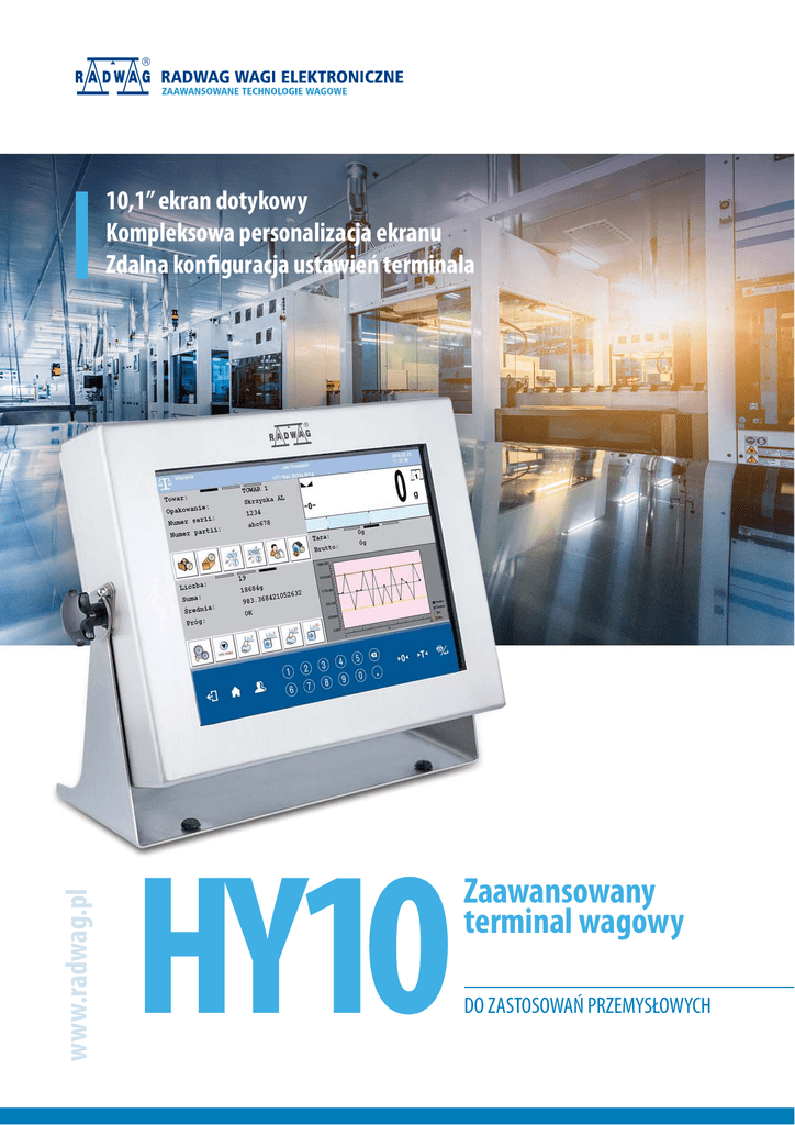 www.radwag.pl 10,1” ekran dotykowy Kompleksowa personalizacja ekranu Zdalna konfiguracja ustawień terminala HY10 Zaawansowany terminal wagowy DO ZASTOSOWAŃ PRZEMYSŁOWYCH HY10 WYSOKI STOPIEŃ OCHRONY Jakość i precyzja w trudnych środowiskach pracy Adaptacja do wymagań procesu produkcyjnego Pełna personalizacja ekranu Ekran terminala HY10 może zostać samodzielnie zaprojektowany przez użytkownika i dostosowany do specyficznych wymagań każdego procesu produkcyjnego. Kreator procesów produkcyjnych Funkcja „Procesy Identyfikacji” pozwala ściśle określić przebieg procesu wagowego i krok po kroku kierować pracą operatora terminala, aby nie został pominięty żaden element procesu ważenia. Szczelna, nierdzewna obudowa zapewniająca bezproblemowe działanie terminalna w warunkach o wysokiej wilgotności i dużym zapyleniu. WYŚWIETLACZ 10,1 CALA Duży, 10,1 calowy kolorowy wyświetlacz pojemnościowy o rozdzielczości 1024×600 pikseli zapewniający doskonałą ergonomię pracy. KREATOR WYGLĄDU Kompleksowana personalizacja dzięki możliwości zastosowania własnego wyglądu oraz funkcjonalności menu. Zdalna konfiguracja Nowatorskie rozwiązanie konfiguracji zdalnej, pozwala na zarządzanie ustawieniami terminala HY10 z dowolnego miejsca na świecie. Połączenie z terminalem jest realizowane przez internet za pomocą programu komputerowego „Edytor Parametrów”. Aplikacje na miarę wymagań przemysłu Oprogramowanie terminala HY10 umożliwia wykorzystanie go do większości zastosowań przemysłowych, jak np. etykietowanie, dozowanie, liczenie sztuk, recepturowanie, kontrola towarów paczkowanych (KTP), statystyczna kontrola jakości. Niezawodność i higiena w trudnych warunkach Konstrukcja ze stali nierdzewnej i wysoki stopień ochrony IP68/69 umożliwiają pracę terminala w trudnych warunkach przemysłowych oraz spełniają wysokie standardy higieny, wymagane w przemyśle spożywczym i farmaceutycznym. Zarządzanie systemami wieloplatformowymi Terminal wagowy HY10 może zostać rozbudowany do obsługi 6 platform wagowych. Współpracuje z platformami tensometrycznymi, magnetoelektrycznymi. Umożliwia też podłączenie do niego wag laboratoryjnych oraz modułów wagowych. Bazy danych z łatwością archiwizacji Obszerna baza danych terminala HY10 umożliwia archiwizację wyników pracy i raportów okresowych, wymianę danych pomiędzy terminalami oraz ich łatwy import i eksport. Wyświetlacz Stopień ochrony Obudowa Ilość platform wagowych IP68/69 Stal nierdzewna standardowo 1, opcjonalnie do 6 System Microsoft Windows 7 Embedded Compact Pamięć 256 MB DDR2, 8 GB - karta microSD Procesor Komunikacja Terminal wagowy HY10 posiada bazę grafik, które moga być podporządkowywane do ważonych produktów. kolorowy 10,1 cala z panelem dotykowym Opcje dodatkowe Dwurdzeniowy 1 GHz 2×RS 232, 2×USB, Ethernet, 4×IN, 4×OUT, Modbus 12×IN, 12×OUT, Profibus, Wi-Fi, RS 232, RS 485, wyjścia analogowe: 4-20mA, 0-20mA, 0-10V RADWAG Wagi Elektroniczne • www.radwag.pl