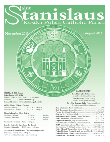Listopad 2013 November 2013 PARISH STAFF 1413 North 20th Street Saint Louis, MO 63106 Phone: 314.421.5948 Fax: 314.588.8688 Website: www.saintstan.org Sunday Homilies: www.saintstan.org/homilies Office Hours / Biuro Czynne Monday - Friday: 9:00 a.m. - 2:00 p.m. Poniedziałek - Piątek: 9:00 a.m. - 2:00 p.m. Mass Schedule / Msze Święte Saturday - Sobota: 4:00 p.m. Sunday - Niedziela: 9:00 a.m. 11:00 a.m. Fridays of November - Piątki 6:30 p.m. English English Polish Sunday School / Katecheza dla dzieci Sunday - Niedziela: 10:15 a.m. - 11:00 a.m. Sacrament of Reconciliation / Sakrament Pojednania Saturday / Soboty 3:00 - 3:45 p.m. or by appointment / lub po umówieniu się Rev. Marek B. Bożek, Pastor E-mail: [email protected] Danica Koster, Parish Secretary E-mail: [email protected] Rev. Mr. Tomasz Pels, Transitional Deacon E-mail: [email protected] BoD Chairman, Randolph Mindak……….………..314.614.4199 BoD Treasurer, Roman Kaminski…………………314.487.3075 Pastor, Rev. Marek Bożek...............................................314.278.8887 Deacon, Rev. Mr.Tomasz Pels.......................................312.771.9896 Sacristan & Social Justice, Donna Nachefski……..314.323.6415 PSR Coordinator, Christine Mindak……………….314.482.7810 Organist & Pianist, Jerry & Pamela Peters...………314.412.8545 Discernment Coordinator, Christine Clifford..........314.631.1364 RCIA Coordinator, Janice Merzweiler……………..314.352.5644 Częstochowa Sodality, Josephine Konsewicz……..314.752.2439 “After Chapel” Group, Ken & Sue Beekman…........636.936.1785 Polish Heritage Center Rental, Mariann Novak….314.488.6669 Polish Heritage Library, Alicja Kaminska.................636.441.1677 Fall Festival Chairman, Gene Koziatek…………...314.846.7819 St. Stanislaus® Kostka November * Listopad 2013 2 St. Stanislaus Kostka Parish Welcomes You! All baptized Christians who believe that Jesus Christ is truly present in the Eucharistic bread and wine are invited to partake in His banquet of life and join us in receiving Holy Communion. Wszyscy ochrzczeni wyznający wiarę w prawdziwą obecność Pana Jezusa w Eucharystii są zaproszeni do przyjęcia komunii świętej w naszym kościele. WE USE THE VATICAN II MISSAL WE SAY * AND ALSO WITH YOU * At St. Stanislaus we continue to pray the originally authorized English translation of the Vatican II Catholic Liturgy. It is slightly different from the Mass prayers currently used in the Roman Catholic parishes. If you are unsure about the prayers we use, please feel free to follow “The Order of the Mass” as it appears in readily available Saint Joseph Sunday Missals. PRAY FOR THE SICK * MODLITWA ZA CHORYCH Please notify the rectory if you become sick or hospitalized * Prosimy zglaszać na plebanię imiona osób chorych proszących o modlitwę. George Bentz, Doug Bernier, Richard Ceglinski, Steve Czerniewski, Carol Czarnecki, Lucyna Dziedzina, Margaret Hankins, Tim Harris, Joan Janczura, Ellen Marciniak, Fr. Tom Mueller, Mariann Novak, Mary Ellen Czerniewski, Eileen Prose, John Sitek, Julie Stichnote, Elena Schulte, Mary Sulzer, Eugene Vetz, Bernie Wejzgrowicz, and Joe Wejzgrowicz. ST. STANISLAUS 150 CLUB SEPTEMBER WINNER: CLARENCE & DEBBIE KOZUSZEK OCTOBER WINNER: GERALD PACANOWSKI November 1 All Saints - Wszystkich Świętych 7:00 p.m. † Stanley Raczynski Intention of Eddie & Barbara Raczynski November 2 Vigil of the 31st Sunday in Ordinary Time 4:00 p.m. † Bob Lesinski Intention of Parishioners & Friends November 3 Thirty-First Sunday in Ordinary Time 9:00 a.m. † Antoni & Petronela Kaminski Intention of Adam & Leona Kaminski 11:00 a.m. † Jacek Jarzeński (Polish) Intencja Gosi Brooks 1:00 p.m. Kenya Onofre (Spanish) Misa de su Bautismo November 8 ††† November Mass for Deceased 6:30 p.m. ††† Listopadowa Msza Wypominkowa November 9 Vigil of the 32nd Sunday in Ordinary Time 4:00 p.m. † Stanley Bialczak Intention of the Bialczak Family November 10 Thirty-Second Sunday in Ordinary Time 10:00 a.m. † Stanley Bialczak (bilingual) Intention of the Family November 15 ††† November Mass for Deceased 6:30 p.m. ††† Listopadowa Msza Wypominkowa November 16 Vigil of the 33rd Sunday in Ordinary Time 4:00 p.m. † Walter Snopek Intention of Diane & Tom Daley November 17 Thirty-Third Sunday in Ordinary Time 9:00 a.m. †† Chester & Mirian Detpula Intention of Stanley & Eleanor Podolski 11:00 a.m. † Shirley Margański (Polish) Intencja Susan & Roman Kaminski November22 ††† November Mass for Deceased 6:30 p.m. ††† Listopadowa Msza Wypominkowa November 23 Vigil of Christ the King Sunday 4:00 p.m. † Joseph Rudawski Intention of Diane & Tom Daley November 24 Christ the King Sunday 9:00 a.m. †† John & Connie Myslinski Intention of Bill & Felicia Schnittker 11:00 a.m. † Diane Hunnius (Polish) Intencja Family & Friends November 29 ††† November Mass for Deceased 6:30 p.m. ††† Listopadowa Msza Wypominkowa November 30 Vigil of the First Sunday of Advent 4:00 p.m. † Bob Lesinski Intention of Diane & Tom Daley December 1 First Sunday of Advent 9:00 a.m. †Gene Czerniewski Intention of John & Irene Meyer St. Stanislaus® Kostka November * Listopad 2013 3 There were no funerals in the month of October W październiku nie odbył się żaden pogrzeb THERE IS A PROMISE OF MARRIAGE BETWEEN: ANDY DEVINE AND MADELINE HOFF ON NOVEMBER 30, 2013 AT 1:30 P.M. BRIAN COBB AND ELISE DOYLE WERE MARRIED ON OCTOBER 5, 2013 GASTON HOLLOWAY AND LATISHA EARL WERE MARRIED ON OCTOBER 18, 2013 TIMOTHY AIDEN SCHMIDT Born: May 24, 2007 Baptized: October 6, 2013 Parent: Kristen Schmidt Godparents: Timothy Keeley, Sally Griffith, Terry Schmidt CHRISTIAN JOSEPH SCHMIDT Born: May 24, 2007 Baptized: October 6, 2013 Parent: Kristen Schmidt Godparents: Timothy Keeley, Sally Griffith, Terry Schmidt BROOKS ROGER BUSS WELCOME TO OUR NEWEST PARISHIONERS: NICHOLAS HELLER & KATIE TOLER Born: August 13, 2013 Baptized: