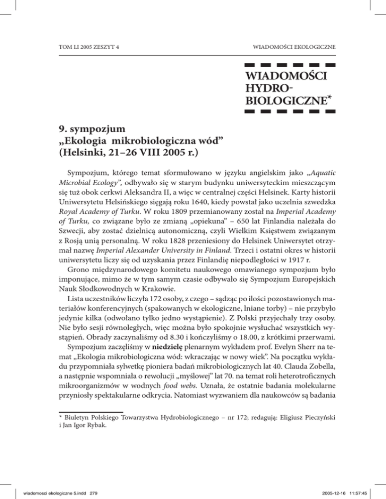 TOM LI 2005 ZESZYT 4 WIADOMOŚCI EKOLOGICZNE !!!!!! WIADOMOŚCI HYDRO BIOLOGICZNE* !!!!!! 9. sympozjum „Ekologia mikrobiologiczna wód” (Helsinki, 21–26 VIII 2005 r.) Sympozjum, którego temat sformułowano w języku angielskim jako „Aquatic Microbial Ecology”, odbywało się w starym budynku uniwersyteckim mieszczącym się tuż obok cerkwi Aleksandra II, a więc w centralnej części Helsinek. Karty historii Uniwersytetu Helsińskiego sięgają roku 1640, kiedy powstał jako uczelnia szwedzka Royal Academy of Turku. W roku 1809 przemianowany został na Imperial Academy of Turku, co związane było ze zmianą „opiekuna” – 650 lat Finlandia należała do Szwecji, aby zostać dzielnicą autonomiczną, czyli Wielkim Księstwem związanym z Rosją unią personalną. W roku 1828 przeniesiony do Helsinek Uniwersytet otrzymał nazwę Imperial Alexander University in Finland. Trzeci i ostatni okres w historii uniwersytetu liczy się od uzyskania przez Finlandię niepodległości w 1917 r. Grono międzynarodowego komitetu naukowego omawianego sympozjum było imponujące, mimo że w tym samym czasie odbywało się Sympozjum Europejskich Nauk Słodkowodnych w Krakowie. Lista uczestników liczyła 172 osoby, z czego – sądząc po ilości pozostawionych materiałów konferencyjnych (spakowanych w ekologiczne, lniane torby) – nie przybyło jedynie kilka (odwołano tylko jedno wystąpienie). Z Polski przyjechały trzy osoby. Nie było sesji równoległych, więc można było spokojnie wysłuchać wszystkich wystąpień. Obrady zaczynaliśmy od 8.30 i kończyliśmy o 18.00, z krótkimi przerwami. Sympozjum zaczęliśmy w niedzielę plenarnym wykładem prof. Evelyn Sherr na temat „Ekologia mikrobiologiczna wód: wkraczając w nowy wiek”. Na początku wykładu przypomniała sylwetkę pioniera badań mikrobiologicznych lat 40. Clauda Zobella, a następnie wspomniała o rewolucji „myślowej” lat 70. na temat roli heterotroficznych mikroorganizmów w wodnych food webs. Uznała, że ostatnie badania molekularne przyniosły spektakularne odkrycia. Natomiast wyzwaniem dla naukowców są badania * Biuletyn Polskiego Towarzystwa Hydrobiologicznego – nr 172; redagują: Eligiusz Pieczyński i Jan Igor Rybak. wiadomosci ekologiczne 5.indd 279 2005-12-16 11:57:45 280 WIADOMOŚCI HYDROBIOLOGICZNE mikroorganizmów wodnych jako systemu komórkowego współgrającego z otaczającym je bezpośrednio fizyczno-chemicznym otoczeniem oraz innymi organizmami (np. komunikacja międzykomórkowa czy interakcje allelopatyczne). Później kontynuowaliśmy rozmowy w kuluarach przy szklaneczce ponczu. W poniedziałek były dwa główne tematy: „Biogeochemia mikrobiologiczna toni wodnej” i „Struktura molekularna zespołów”, w obrębie których odbyło się kilka sesji (m.in. „Molekularne analizy zespołów” oraz „Mikrobiologiczne konsorcja: zmienność i regulacje różnorodności”). Na początku każdej sesji był wykład plenarny. W poniedziałek wysłuchaliśmy dwóch. Prof. Faroog Azam omówił „Biochemiczne interakcje w mikroskali”, a więc dotyczące m.in. bakterii, które mają wpływ na gospodarkę węglem w całym oceanie, czyli w rzeczywistości w skali makro. Zdaniem referenta dopiero zintegrowane podejście obejmujące badania genetyczne, ekologiczne i biochemiczne może przynieść wyniki, które pozwolą przewidywać w jaki sposób ekosystemy morskie odpowiedzą na stresy, jak np. przełowienie, zanieczyszczenia, globalne ocieplenie, zanikanie bioróżnorodności, zwiększona ilość dwutlenku węgla Rys. 1. Fragment fontanny na tle starego ryneczku i reprezentacyjnej części miasta z budynkiem mera miasta i pałacem prezydenckim (w głębi) (fot. I. Kostrzewska-Szlakowska) wiadomosci ekologiczne 5.indd 280 2005-12-16 11:57:45 WIADOMOŚCI HYDROBIOLOGICZNE 281 w atmosferze, „użyźnianie” związane z eutrofizowaniem się wód przybrzeżnych. Następny był wykład prof. Stephena Giovannoniego „O przestrzennej i czasowej strukturze w obrębie zespołów bakterioplanktonu oceanicznego”. Codziennie wysłuchiwaliśmy też „wykładów na zaproszenie” – zwykle kilku. Dzień zakończyliśmy bardzo miłym przyjęciem, na które w imieniu rektora Uniwersytetu w Helsinkach zaprosiła nas jego zastępczyni prof. Marja Makarow. Wtorek – kontynuacja poniedziałkowego drugiego tematu (sesja: „Ekologiczne znaczenie różnorodności”) oraz nowy temat – „Regulacje w obrębie zespołów mikrobiologicznych” z sesją „Kompleksowość i dynamika mikrobiologicznych sieci pokarmowych (food web)”. Wykład plenarny prof. Davida Kirchmana dotyczył „Regulacji zespołów bakteryjnych przez rozpuszczoną materię organiczną w ekosystemach wodnych”, ze szczególnym uwzględnieniem ciekawego szczepu SAR11. Okazuje, że genetyczne badania bakterii (CARD-FISH, MICRO-CARD FISH, PCR-DGGE, T-RFLP itd.) są już standardem w badaniach światowych. Wieczorem w siedzibie władz miasta (przy głównej ulicy obok pałacu prezydenckiego i tuż przy starym ryneczku nad zatoką – rys. 1) powitał nas osobiście na kolejnym przyjęciu mer Helsinek. W środę kontynuowaliśmy poprzedni temat (sesje: „Regulacje i wydajność wzrostu”, „Regulacje zakwitów toksycznych”) oraz zaczęliśmy nowy: „Życie mikrobiologiczne w specyficznych środowiskach”, podzielony na dwie sesje: „Procesy mikrobiologiczne w interfazie woda–osad” oraz wspomniane procesy w biofilmach. Prof. Staffan Kjellerberg w wykładzie plenarnym przedstawił złożoność zespołów biofilmu w środowisku morskim. Stwierdził, że w biofilmie występuje na ogół 40–80 gatunków z wielu filogenetycznych grup oraz że skład gatunkowy jest dość stały w czasie i przestrzeni. Jednakże badania nad kolonizacją powierzchni sugerują, że skład zespołów bakterii zmienia się po każdych 12 dniach. Od 17.30 odbywała się sesja plakatowa (przy piwie i przekąskach). Zgłoszono blisko 80 plakatów