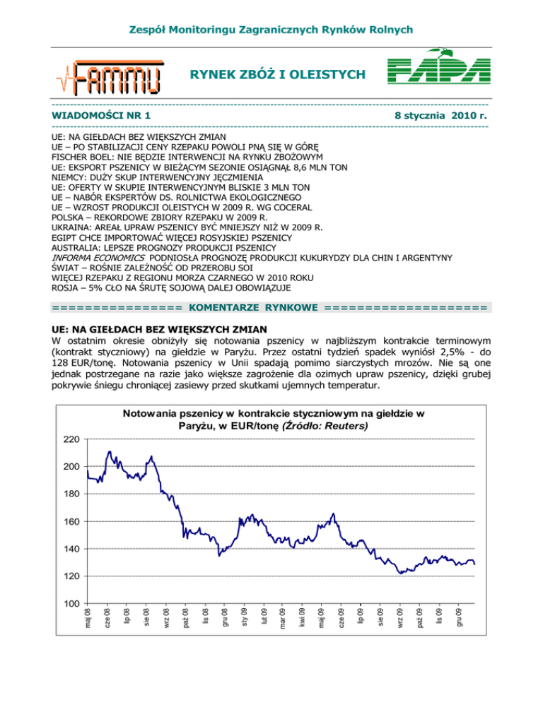 Zespół Monitoringu Zagranicznych Rynków Rolnych RYNEK ZBÓŻ I OLEISTYCH -----------------------------------------------------------------------------------------------------------------------WIADOMOŚCI NR 1 8 stycznia 2010 r. -----------------------------------------------------------------------------------------------------------------------UE: NA GIEŁDACH BEZ WIĘKSZYCH ZMIAN UE – PO STABILIZACJI CENY RZEPAKU POWOLI PNĄ SIĘ W GÓRĘ FISCHER BOEL: NIE BĘDZIE INTERWENCJI NA RYNKU ZBOŻOWYM UE: EKSPORT PSZENICY W BIEŻĄCYM SEZONIE OSIĄGNĄŁ 8,6 MLN TON NIEMCY: DUŻY SKUP INTERWENCYJNY JĘCZMIENIA UE: OFERTY W SKUPIE INTERWENCYJNYM BLISKIE 3 MLN TON UE – NABÓR EKSPERTÓW DS. ROLNICTWA EKOLOGICZNEGO UE – WZROST PRODUKCJI OLEISTYCH W 2009 R. WG COCERAL POLSKA – REKORDOWE ZBIORY RZEPAKU W 2009 R. UKRAINA: AREAŁ UPRAW PSZENICY BYĆ MNIEJSZY NIŻ W 2009 R. EGIPT CHCE IMPORTOWAĆ WIĘCEJ ROSYJSKIEJ PSZENICY AUSTRALIA: LEPSZE PROGNOZY PRODUKCJI PSZENICY INFORMA ECONOMICS PODNIOSŁA PROGNOZĘ PRODUKCJI KUKURYDZY DLA CHIN I ARGENTYNY ŚWIAT – ROŚNIE ZALEŻNOŚĆ OD PRZEROBU SOI WIĘCEJ RZEPAKU Z REGIONU MORZA CZARNEGO W 2010 ROKU ROSJA – 5% CŁO NA ŚRUTĘ SOJOWĄ DALEJ OBOWIĄZUJE ================ KOMENTARZE RYNKOWE ==================== UE: NA GIEŁDACH BEZ WIĘKSZYCH ZMIAN W ostatnim okresie obniżyły się notowania pszenicy w najbliższym kontrakcie terminowym (kontrakt styczniowy) na giełdzie w Paryżu. Przez ostatni tydzień spadek wyniósł 2,5% - do 128 EUR/tonę. Notowania pszenicy w Unii spadają pomimo siarczystych mrozów. Nie są one jednak postrzegane na razie jako większe zagrożenie dla ozimych upraw pszenicy, dzięki grubej pokrywie śniegu chroniącej zasiewy przed skutkami ujemnych temperatur. Notowania pszenicy w kontrakcie styczniowym na giełdzie w Paryżu, w EUR/tonę (Źródło: Reuters) 220 200 180 160 140 gru 09 lis 09 paź 09 wrz 09 sie 09 lip 09 cze 09 maj 09 kwi 09 mar 09 lut 09 sty 09 gru 08 lis 08 paź 08 wrz 08 sie 08 lip 08 cze 08 100 maj 08 120 Zespół Monitoringu Zagranicznych Rynków Rolnych Czynniki fundamentalne dla rynku pszenicy miękkiej niezmiennie wskazują na zniżki. Światowy bilans pszenicy jest „przyciężki”, a wzrost cen na giełdach amerykańskich (przede wszystkim CBoT) możliwy będzie tylko w przypadku większego uaktywnienia się funduszy inwestycyjnych, czego spodziewa się rynek. Większe zainteresowanie funduszy inwestowaniem na amerykańskich giełdach towarowych było prawdopodobnie główną przyczyną zwyżek mających miejsce w ostatnich dwóch tygodniach na giełdzie w Chicago. W ostatnim tygodniu notowania pszenicy w kontrakcie marcowym wzrosły o 3% do 204,9 USD/tonę. Drożeje kukurydza - zarówno na unijnych giełdach, jak i w USA. Na paryskiej giełdzie ceny tego gatunku w kontrakcie marcowym wzrosły przez tydzień o 4,6% do 141,3 EUR/tonę, a w Chicago – do 0,7% do 164,4 USD/tonę. Notowania kukurydzy w kontrakcie marcowym na giełdzie w Paryżu, w EUR/tonę (Źródło: Reuters) 300 280 260 240 220 200 180 160 140 120 lis 09 wrz 09 lip 09 maj 09 mar 09 sty 09 lis 08 wrz 08 lip 08 maj 08 mar 08 sty 08 lis 07 wrz 07 lip 07 maj 07 mar 07 100 Ostatnie zwyżki notowań kukurydzy w Paryżu to wynik większego popytu na ten gatunek zarówno na unijnym rynku, jak również ze strony prywatnych importerów z Algierii i Tunezji. W dłuższym okresie ceny nadal pozostają jednak na w miarę stabilnym poziomie. Komentarz autorstwa analityków FAMMU/FAPA z wykorzystaniem Reuters i innych źródeł UE – PO STABILIZACJI CENY RZEPAKU POWOLI PNĄ SIĘ W GÓRĘ Na giełdzie Euronext w ciągu tygodnia kontrakty na rzepak umocniły się. Lutowy kontrakt na rzepak odnotował wzrost 1,4% do 291,5 Euro/t (w ciągu dwóch tygodni podrożał o 2,9%). Kontrakt na maj i sierpień’2010 również podrożały 0,9%. Kontrakt lutowy znalazł się w bieżącym tygodniu na poziomie najwyższym od 6 miesięcy. Wydaje się, że główną przyczyną umocnienia jest kontynuacja drożenia cen ropy do ponad 80 USD/baryłkę na poziomie najwyższym od 15 miesięcy. Wpłynęło to na rynek olejów roślinnych oraz na surowce w tym rzepak. Linia oporu znajduje się na poziomie około 294,5-298 Euro. Rzepak ma wsparcie ze strony słonecznika, którego ograniczona podaż dodatkowo napędza popyt na niego. Wysoki poziom przerobu słonecznika w Rosji, Ukrainie i UE poważnie zredukował jego zapasy, co najprawdopodobniej umocni ceny słonecznika. Dodatkowo popyt na biodiesel wspiera wartość oleju rzepakowego. Uczestnicy rynku bacznie obserwują rozwój sytuacji w Ameryce Południowej, gdzie spodziewane są wysokie zbiory soi, a ewentualne redukcje optymistycznych prognoz mogłyby wpłynąć na dalszy rozwój sytuacji podażowo popytowej. Pokrywa śniegu we Francji i Niemczech przyczynia się do dobrego Zespół Monitoringu Zagranicznych Rynków Rolnych przezimowania plantacji rzepaku, jakkolwiek wiele się może zdarzyć do zbiorów. Większość surowców oleistych oraz oleje w Rotterdamie podrożała. W ciągu tygodnia na giełdzie towarowej w Chicago styczniowe kontrakty terminowe na soję potaniały o 2,1% po wzroście tydzień wcześniej o 1,8%. Od 1 stycznia br. Chiny wprowadziły automatyczne licencje importowe na przywóz soi i rzepaku. W grudniu 2009 roku eksport z USA do Chin osiągnął rekordowe 5 mln ton. Niektórzy handlowcy przewidują spadek dynamiki eksportu soi do Chin w dalszej części sezonu zwłaszcza od kwietnia br. ponieważ przewidywany spadek cen tego surowca może pogorszyć opłacalność tłocznia. Eksport ten istotnie wspierał wartość soi w ostatnich miesiącach, więc pogorszenie eksportu wraz ze zbliżającą się podażą soi z Ameryki Południowej mogą dławić ceny soi. W czwartek niespodziewana decyzja banku centralnego w Chinach o wzroście kosztów kredytów dodatkowo spotęgowała obawy o kredytowanie importu soi przez ten kraj. Źródło: FAMMU/FAPA na podst.: WR, Reuters Notowania rzepaku