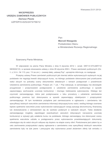Warszawa 23.01.2012r. WICEPREZES URZĘDU ZAMÓWIEŃ PUBLICZNYCH Dariusz Piasta UZP/DP/O-EZG/2473/756/12 Pan Marceli Niezgoda Podsekretarz Stanu w Ministerstwie Rozwoju Regionalnego Szanowny Panie Ministrze, W odpowiedzi na pisma Pana Ministra z dnia 9 stycznia 2012 r. (znak: DKF-IV-073-2MT/12 NK5024/12). w sprawie stosowania ustawy z dnia 29 stycznia 2004 r. Prawo zamówień publicznych (Oz. U. z 2010 r. Nr 113, poz. 759 ze zm.) - zwanej dalej „ustawą Pzp", uprzejmie informuje, co następuje. Przepisy ustawy Prawo zamówień publicznych jak również aktów wykonawczych wydanych na jej podstawie nie regulują kwestii dotyczących kursu, na którego podstawie dokonywane jest przeliczenie walut obcych na potrzeby oceny dokumentów składanych w ramach postępowań w przedmiocie Udzielenia zamówienia publicznego. Przepis art. 7 ust. 1 Pzp wskazuje, iż zamawiający ma obowiązek przygotować i przeprowadzić postępowanie o udzielenie zamówienia publicznego w sposób zapewniający zachowanie uczciwej konkurencji i równego traktowania wykonawców. Dlatego też czynność zamawiającego, która jest podejmowana w toku procedury 0 udzielenie zamówienia publicznego powinna być dokonywana w sposób zapewniający obiektywizm i przejrzystość zamawiającego. W tym kontekście pożądane jest zamieszczanie w ogłoszeniu 0 zamówieniu lub specyfikacji istotnych warunków zamówienia informacji dotyczącej kursu walut, według którego oceniane będzie spełnianie warunków przez wykonawców wykazujących swoją sytuację ekonomiczną, finansową lub doświadczenie z odniesieniem się do wartości podanych w walutach obcych. Takie działanie zamawiającego mogłoby zapobiegać ewentualnym zarzutom dotyczącym naruszenia uczciwej konkurencji w sytuacji gdy ustalenie kursu na podstawie, którego zamawiający ma dokonywać oceny spełnienia warunków udziału w postępowaniu przez wykonawców przedstawiających dokumenty odwołujące się do walut obcych odbywa się dopiero na etapie oceny ofert. Postulowane jest zatem by w celu zachowania przejrzystości zapisy ogłoszenia o zamówieniu oraz specyfikacji istotnych warunków zamówienia były na tyle jasne i precyzyjne aby wykonawca przed złożeniem oferty lub wniosku o dopuszczenie do udziału w postępowaniu mógł właściwie ocenić czy jest w stanie ubiegać się o takie zamówienie, czyli m.in. czy spełnia postawiane przez zamawiającego warunki udziału w postępowaniu. Informacja w przedmiocie kursu walut może służyć jako narzędzie do prawidłowej oceny spełniania przez wykonawców warunków udziały w postępowaniu. Należy podkreślić iż w związku z wyżej wspomnianym brakiem uregulowania przedmiotowej kwestii w przepisach obowiązującego prawa, wskazanie przez zamawiającego kursów walut dla dokonywania przeliczenia walut może mieć jedynie charakter postulatów i zaleceń pozwalających na uniknięcie ewentualnych trudności przy ocenie ofert. Odnosząc się do przedstawionej w Pana piśmie kwestii naruszenia art. 36 ust.1 pkt.5 oraz art. 41 pkt. 7 ustawy Pzp poprzez nie umieszczenie w ogłoszeniu o zamówieniu i specyfikacji istotnych warunków zamówienia zapisu, według jakiego kursu walut miałyby być przeliczane wartości podane w walutach innych niż podane przez zamawiającego, wskazać należy, iż zaniechanie zamieszczenia wskazanego wyżej kursu nie może być podstawą stwierdzenia nieprawidłowości działania zamawiającego i naruszenia przepisów ustawy Pzp. Ponadto uprzejmie informuję, iż w zakresie omówionej wyżej problematyki Urząd Zamówień Publicznych zajął stanowisko z dnia 21 grudnia 2011r. znak: UZP/DP/O-EZG/36937/12436/11 kierowanym do Departamentu Koordynacji i Wdrażania Programów Regionalnych w Ministerstwie Rozwoju Regionalnego. Z poważaniem Dariusz Piasta