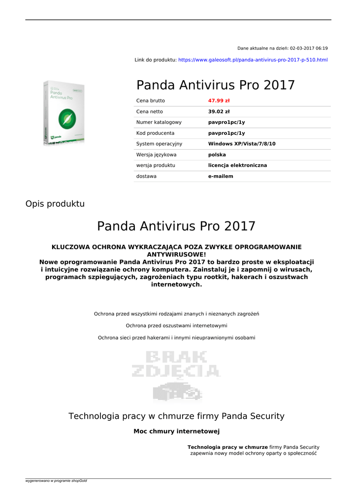 Dane aktualne na dzień: 02-03-2017 06:19 Link do produktu: https://www.galeosoft.pl/panda-antivirus-pro-2017-p-510.html Panda Antivirus Pro 2017 Cena brutto 47.99 zł Cena netto 39.02 zł Numer katalogowy pavpro1pc/1y Kod producenta pavpro1pc/1y System operacyjny Windows XP/Vista/7/8/10 Wersja językowa polska wersja produktu licencja elektroniczna dostawa e-mailem Opis produktu Panda Antivirus Pro 2017 KLUCZOWA OCHRONA WYKRACZAJĄCA POZA ZWYKŁE OPROGRAMOWANIE ANTYWIRUSOWE! Nowe oprogramowanie Panda Antivirus Pro 2017 to bardzo proste w eksploatacji i intuicyjne rozwiązanie ochrony komputera. Zainstaluj je i zapomnij o wirusach, programach szpiegujących, zagrożeniach typu rootkit, hakerach i oszustwach internetowych. Ochrona przed wszystkimi rodzajami znanych i nieznanych zagrożeń Ochrona przed oszustwami internetowymi Ochrona sieci przed hakerami i innymi nieuprawnionymi osobami Technologia pracy w chmurze firmy Panda Security Moc chmury internetowej Technologia pracy w chmurze firmy Panda Security zapewnia nowy model ochrony oparty o społeczność wygenerowano w programie shopGold użytkowników, w ramach której wszyscy uczestnicy wnoszą swój wkład. Twój komputer będzie przez cały czas aktualizowany i chroniony. Ponadto możliwości komputera PC nie będą ograniczać funkcji wykrywania, ponieważ ogromna baza danych wirusów firmy Panda jest umieszczona w Internecie (w chmurze). Ochrona, ochrona i jeszcze więcej ochrony. Ochrona przed oprogramowaniem szpiegującym, próbami wyłudzenia informacji (oszustwami internetowymi), zagrożeniami typu rootkit (zagrożeniami słabo wykrywanymi przez typowe oprogramowanie) oraz trojanami do przejmowania danych bankowych. Ochrona w czasie rzeczywistym Nowy filtr internetowy zapewniający bezpieczne przeglądanie sieci. Pełna ochrona przed atakami znanych i nieznanych wirusów. Zapewnij ochronę dysków flash USB przed infekcjami. Zapora. Zablokuj dostęp intruzom i hakerom, także w przypadku sieci bezprzewodowej. Szybkie skanowanie. Szybsze skanowanie dzięki zastosowaniu nowych technologii przetwarzania wielowątkowego. Jest ono uaktywniane tylko w razie potrzeby. Obciążenie jest tak niewielkie, że nawet nie zauważysz działania procesu. Tryb multimediów/gier. Ciesz się światem multimedialnym i graj bez żadnych przerw! Program antywirusowy monitoruje system, nie przeszkadzając użytkownikom. Poprawione zużycie zasobów Baza danych dotyczących złośliwego oprogramowanie jest umieszczona w chmurze, a nie na komputerze użytkownika. Zużywająca niewiele zasobów ochrona odznacza się niewielkim wpływem na wydajność komputera. Zestaw awaryjny = bezpieczeństwo w sytuacjach awaryjnych. W razie infekcji wirusem przywróć odpowiednie działanie komputera za pomocą zestawu awaryjnego. W przypadku infekcji innego komputera także można przywrócić jego normalne działanie. typ licencji: komercyjna / domowa Produkt posiada dodatkowe opcje: liczba licencji/przedział za szt: 1 licencja , 10 licencji (+ 22.00 zł) wygenerowano w programie shopGold Wymagania sprzętowe Wymagania techniczne: System operacyjny Windows® 10 (wersja 32-bitowa i 64-bitowa) Windows® 10 (wersja 32-bitowa i 64-bitowa) Windows® 8, 8.1 (wersja 32-bitowa i 64-bitowa) Windows® 7 (wersja 32-bitowa i 64-bitowa) Windows® Vista (wersja 32-bitowa i 64-bitowa) Windows® XP (wersja 32-bitowa SP2 lub nowsza) Android 2.3 lub nowszy W ramach licencji istneje możliwość zainstalowania starszej wersji Pandy dla systemów Windows 98, Me i 2000 oraz XP 64bit. Wymagania techniczne Procesor: Pentium 300 MHz lub szybszy Pamięć RAM: 256 MB Dysk twardy: 240 MB wolnej przestrzeni MS Internet Explorer 6.0 Obsługiwana przeglądarka internetowa Microsoft Internet Explorer 6.0 lub nowsza Mozilla Firefox 2 lub nowsza Google Chrome Pobierz wersję testową ! http://download.pandasecurity.com/thankyou/index.php?track=180418&productID=AP&coupon=40OFFWEB&interstitial=0 wygenerowano w programie shopGold Powered by TCPDF (www.tcpdf.org)