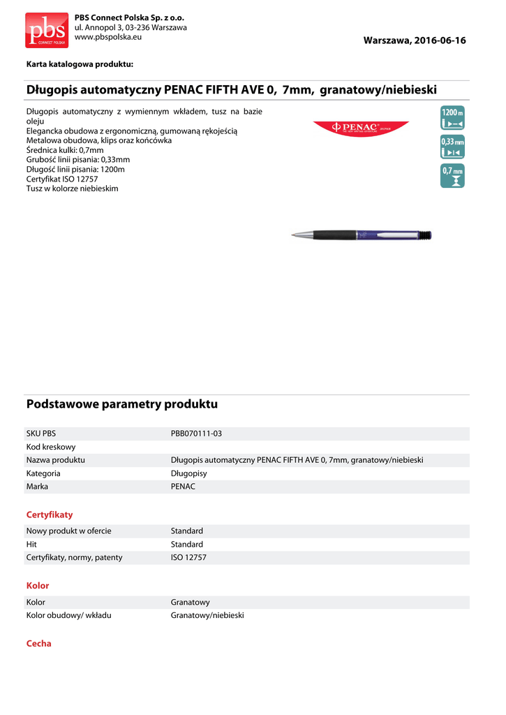 PBS Connect Polska Sp. z o.o. ul. Annopol 3, 03-236 Warszawa www.pbspolska.eu Warszawa, 2016-06-16 Karta katalogowa produktu: Długopis automatyczny PENAC FIFTH AVE 0, 7mm, granatowy/niebieski Długopis automatyczny z wymiennym wkładem, tusz na bazie oleju Elegancka obudowa z ergonomiczną, gumowaną rękojeścią Metalowa obudowa, klips oraz końcówka Średnica kulki: 0,7mm Grubość linii pisania: 0,33mm Długość linii pisania: 1200m Certyfikat ISO 12757 Tusz w kolorze niebieskim Podstawowe parametry produktu SKU PBS PBB070111-03 Kod kreskowy Nazwa produktu Długopis automatyczny PENAC FIFTH AVE 0, 7mm, granatowy/niebieski Kategoria Długopisy Marka PENAC Certyfikaty Nowy produkt w ofercie Standard Hit Standard Certyfikaty, normy, patenty ISO 12757 Kolor Kolor Granatowy Kolor obudowy/ wkładu Granatowy/niebieski Cecha PBS Connect Polska Sp. z o.o. ul. Annopol 3, 03-236 Warszawa www.pbspolska.eu Warszawa, 2016-06-16 Karta katalogowa produktu cd. Długopis automatyczny PENAC FIFTH AVE 0, 7mm, granatowy/niebieski Podstawowe parametry produktu Produkt Długopis automatyczny Typ Elegancki W ofercie od 2013-01 Wymiary Dł. linii (m) 1200 Grubość linii (mm) 0,33 Wspólny słownik zamówień CPV 30192121-5 Długopisy kulkowe Zamiennik Zamiennik JBB070111-18 Jednostki logistyczne Opakowanie 1 12 szt